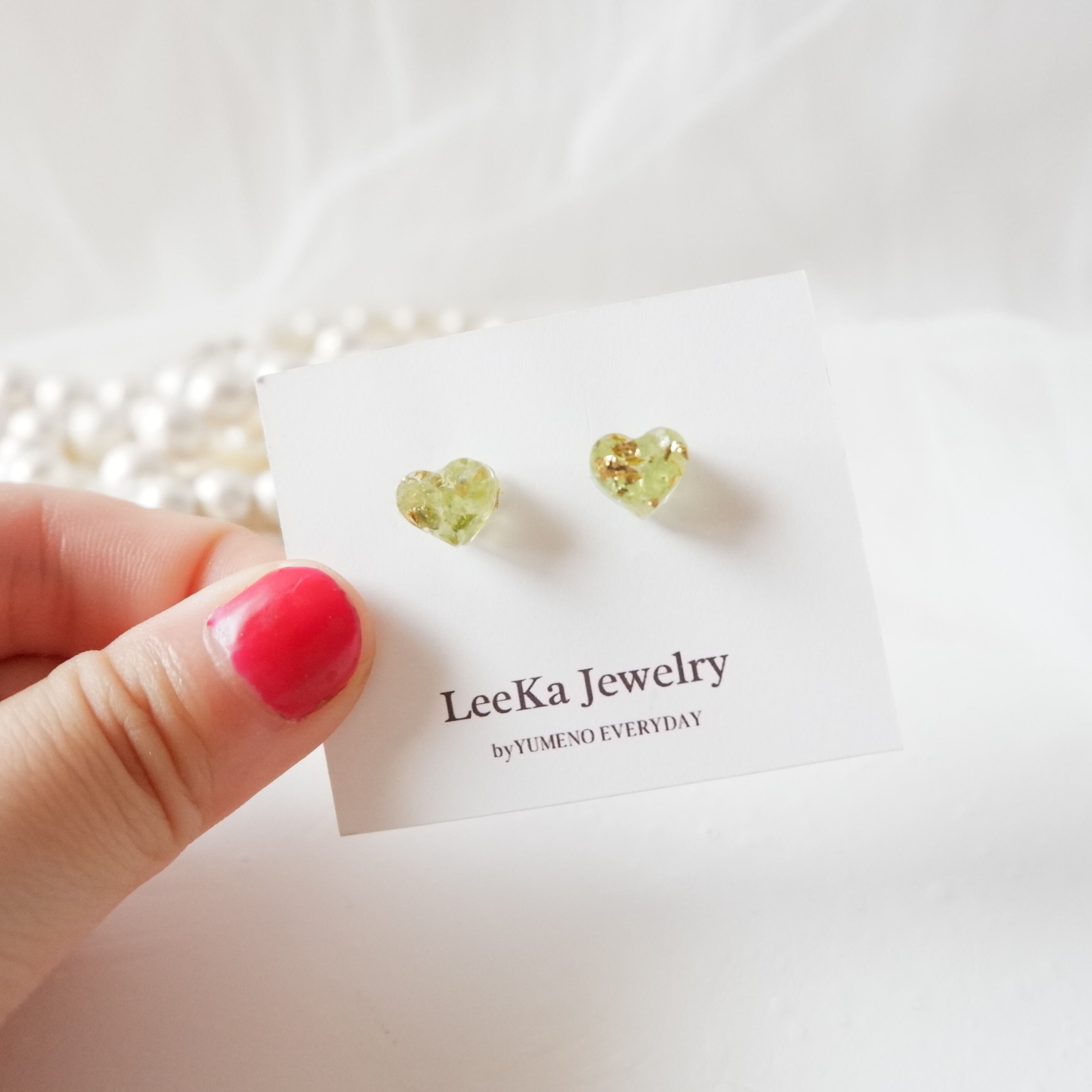 約1cmのハートの中にペリドットのさざれと金箔を閉じ込めました。