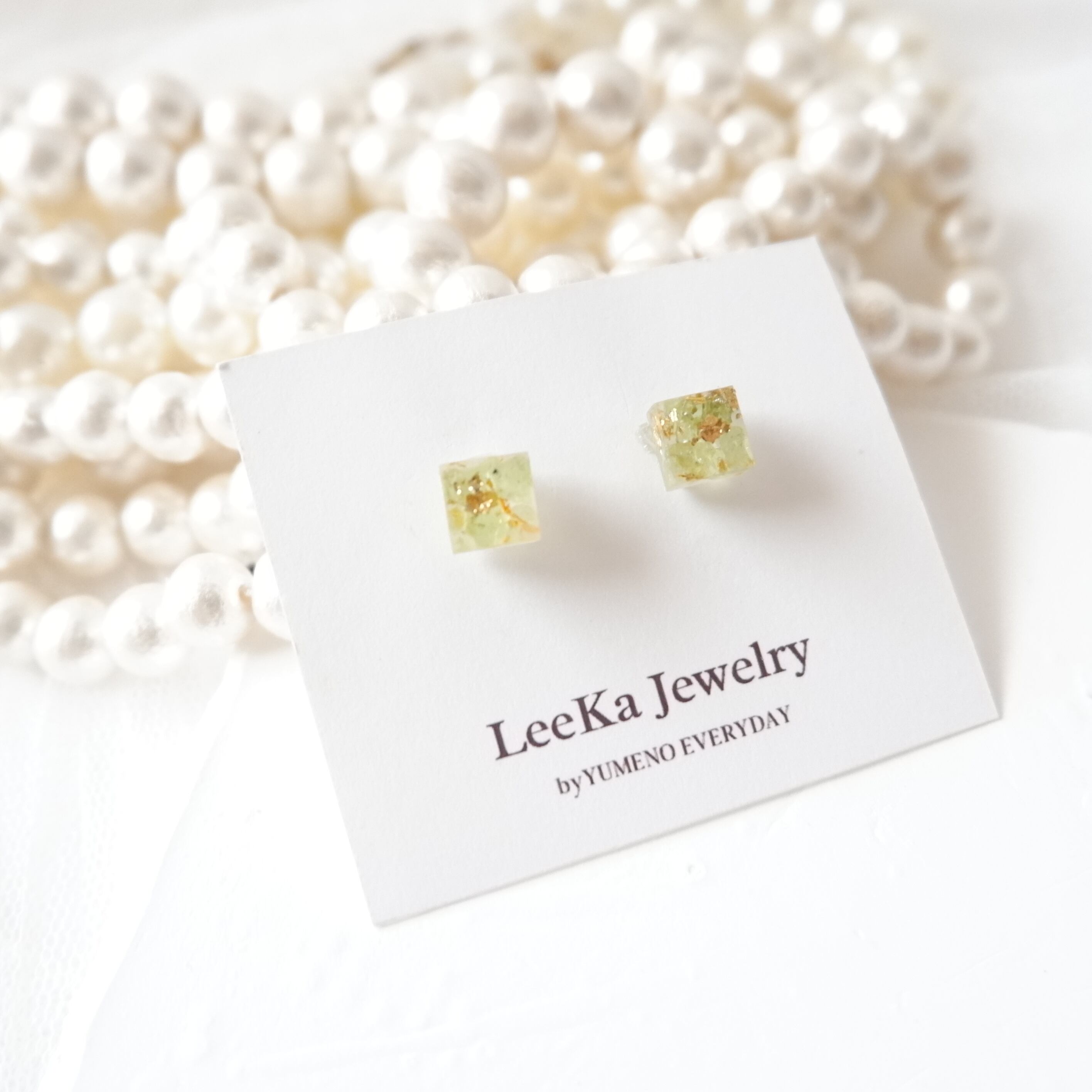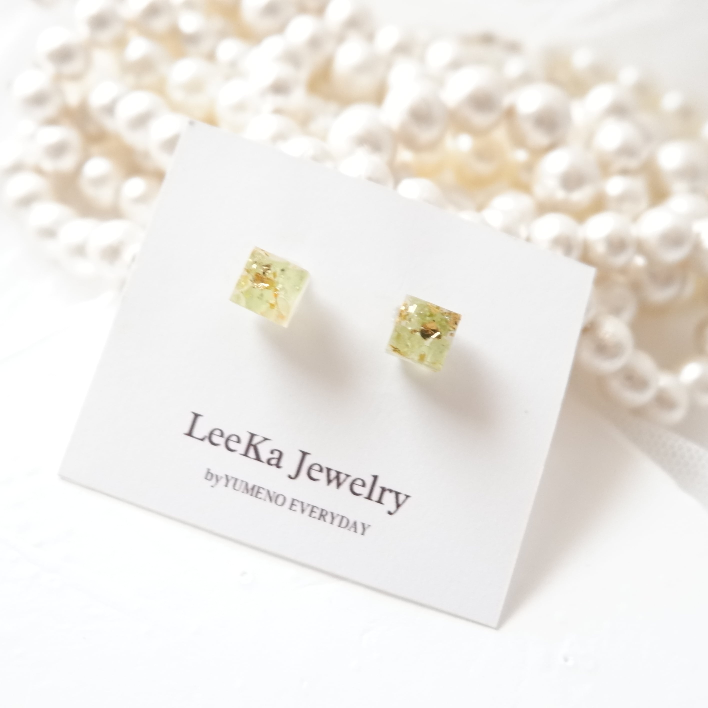 1㎝の四角の中にペリドットのさざれと金箔を閉じ込めました。
