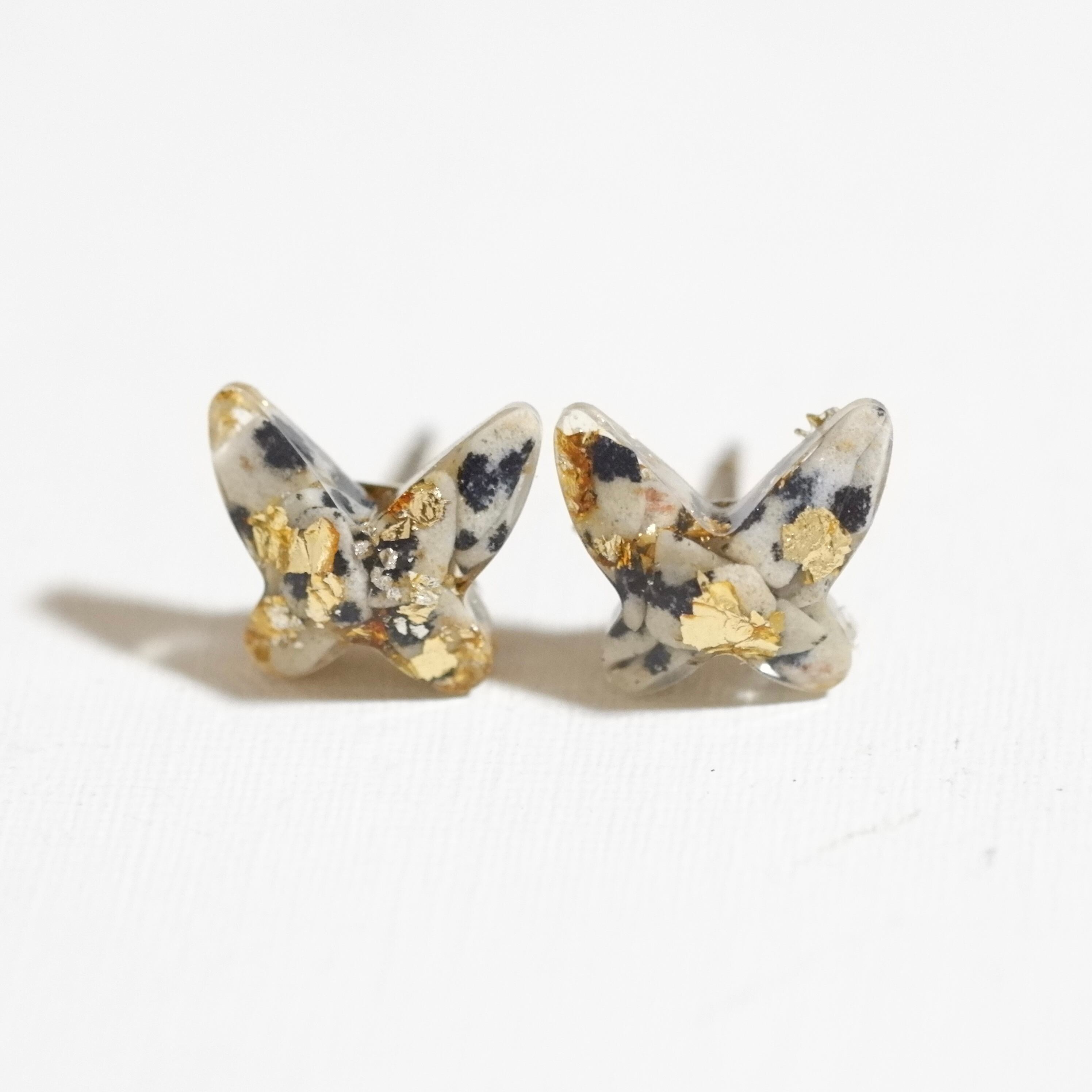 天然石ダルメシアンジャスパーのさざれと金箔を美しいジュエリーカットの蝶々に閉じ込めた大人女性のための蝶々アクセサリーです。