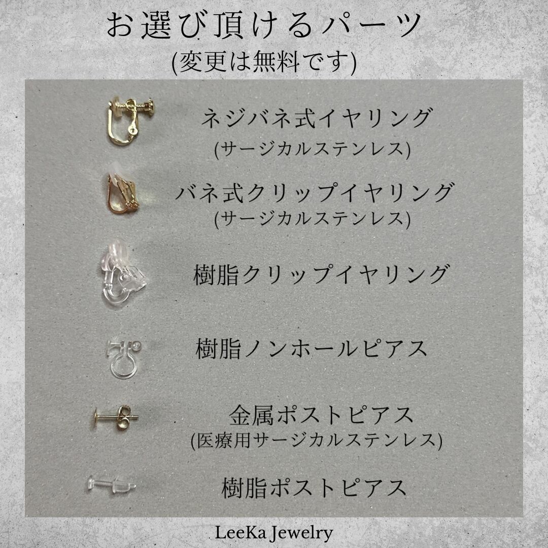 ネジバネ式イヤリング、樹脂ノンホールピアス、、クリップイヤリング、金属バネ式クリップ、金属ポストピアス、樹脂ポストピアスからパーツがお選び頂けます。