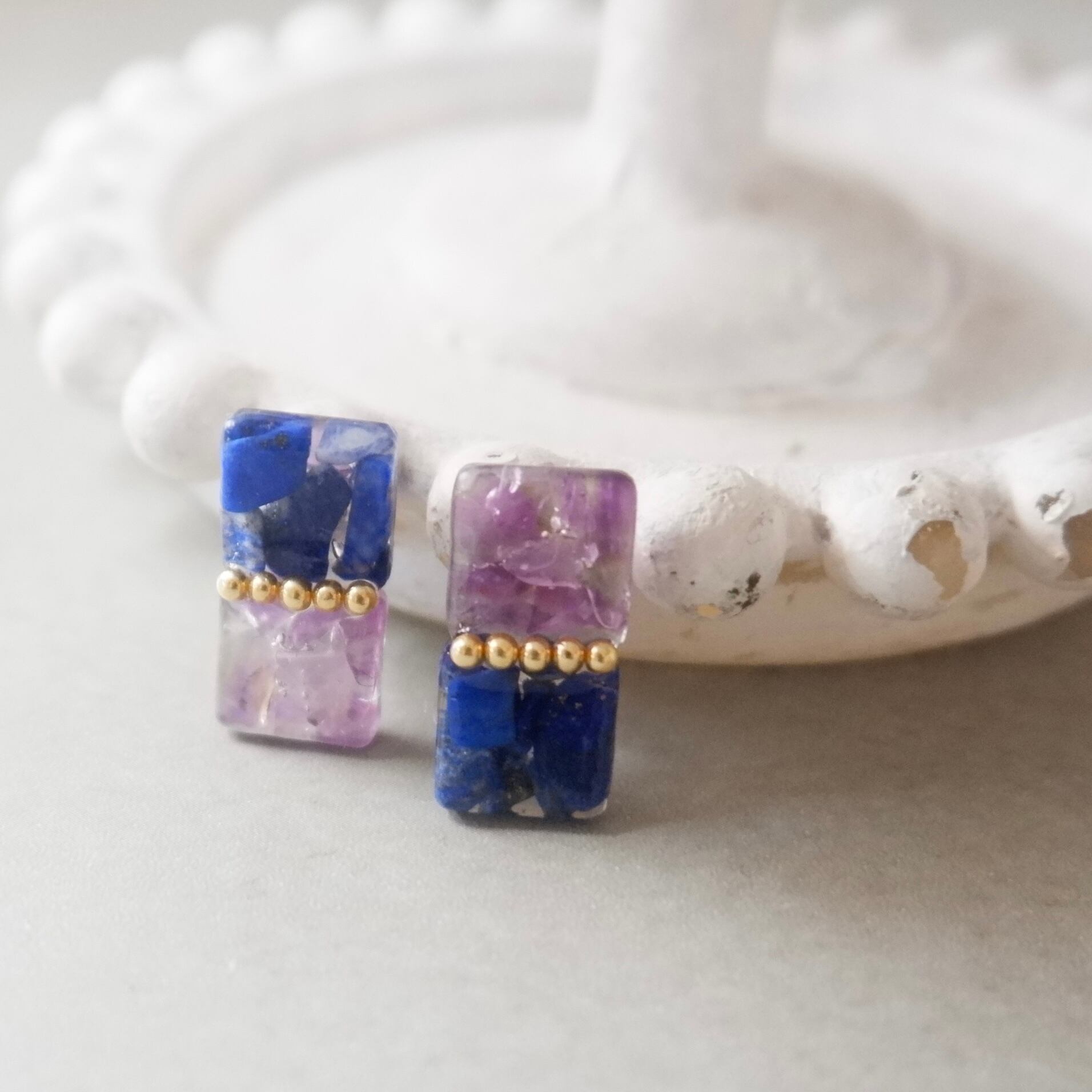 せっかくのアメジストとラピスラズリのお色味をいかすためにそれぞれ別の四角に閉じ込めて繋げました。