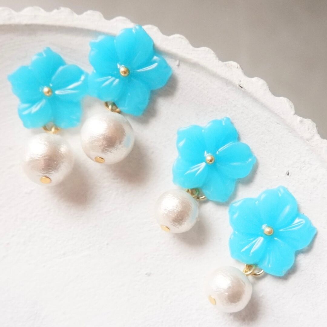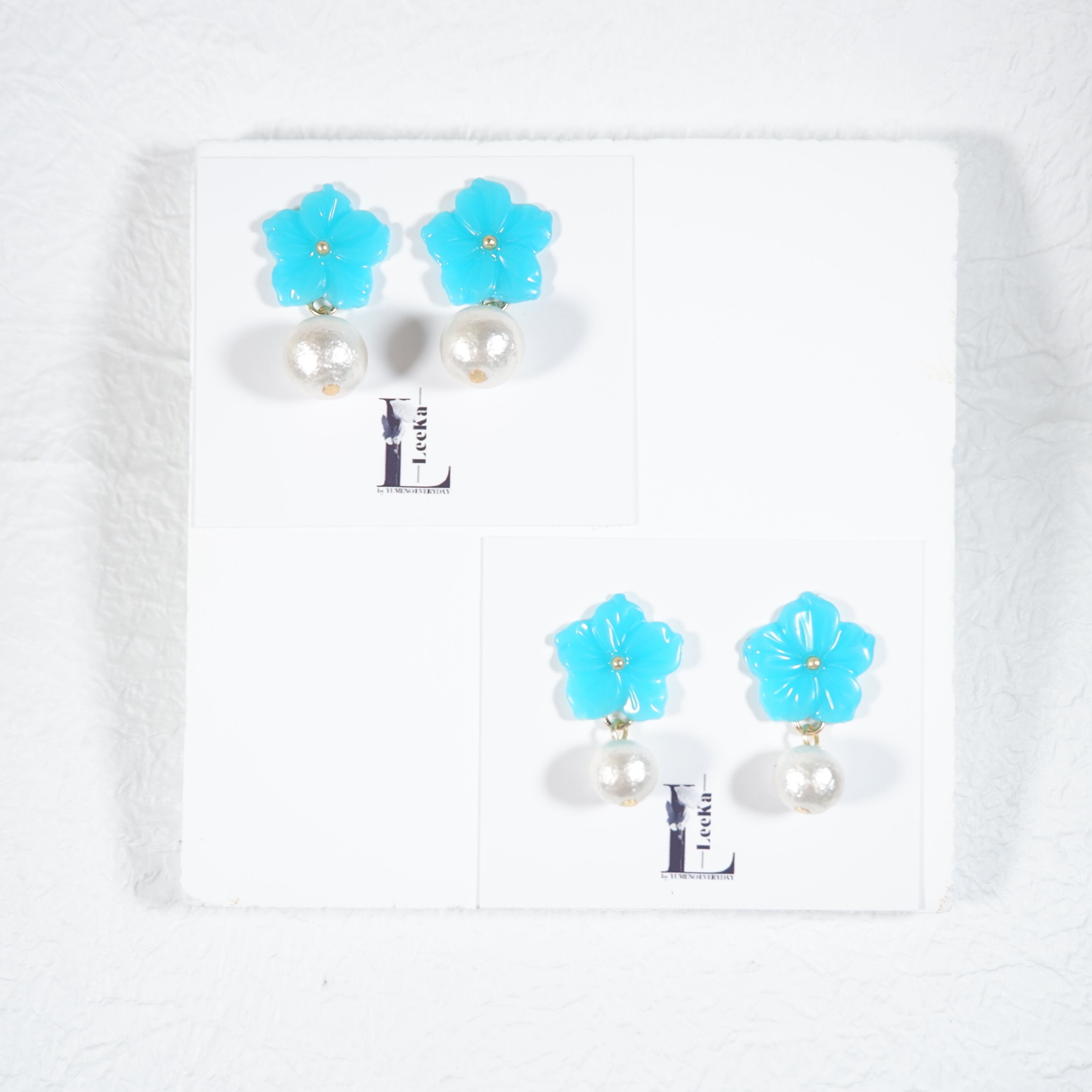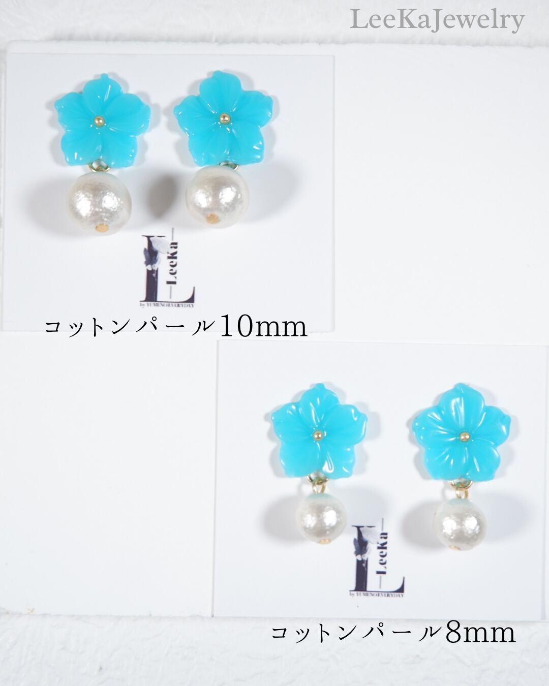 鮮やかなターコイズブルーのお花と揺れるコットンパールが夏っぽい雰囲気です。