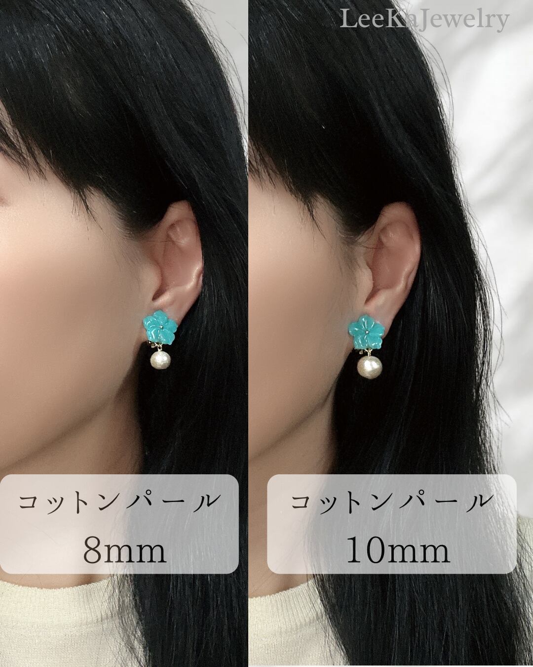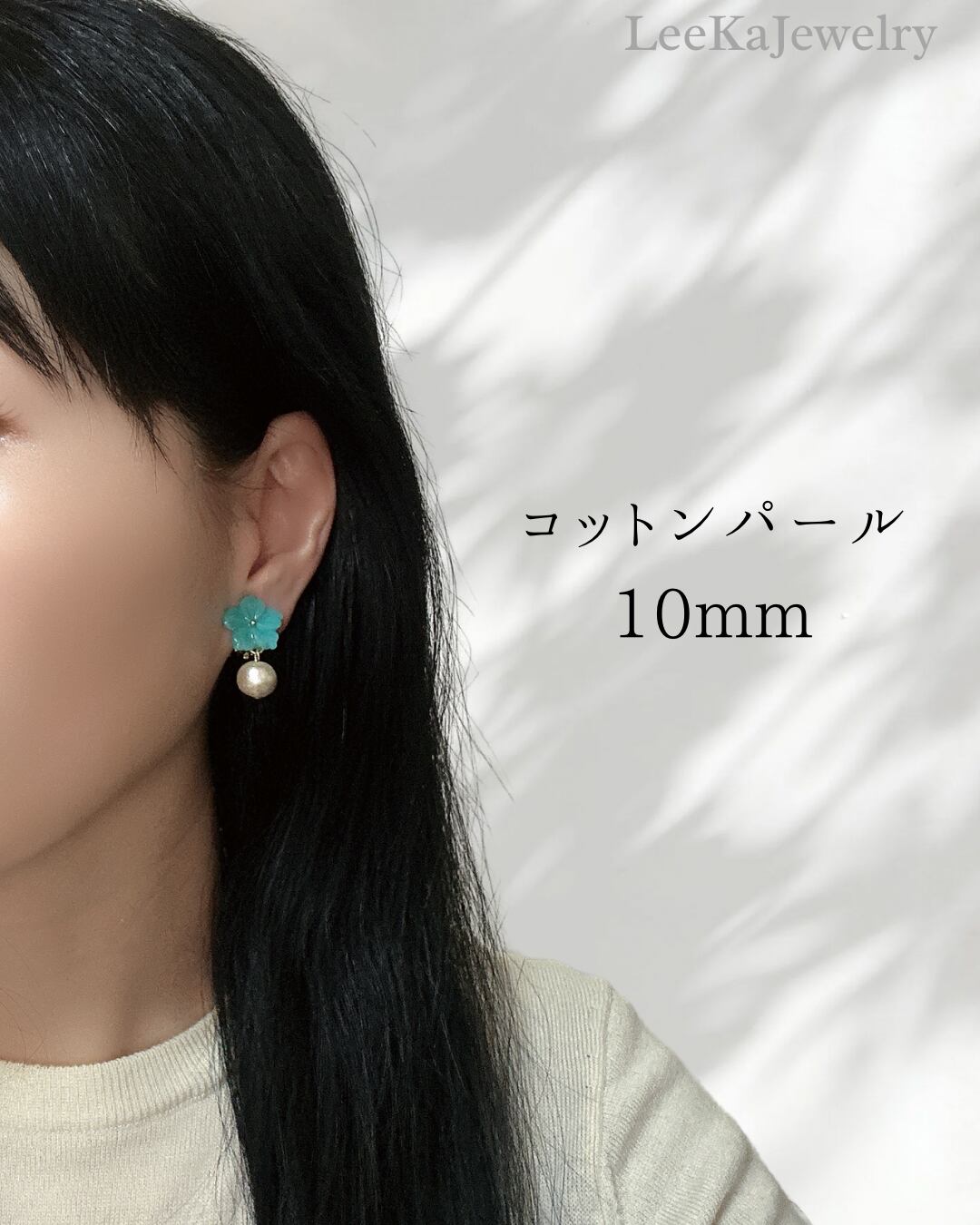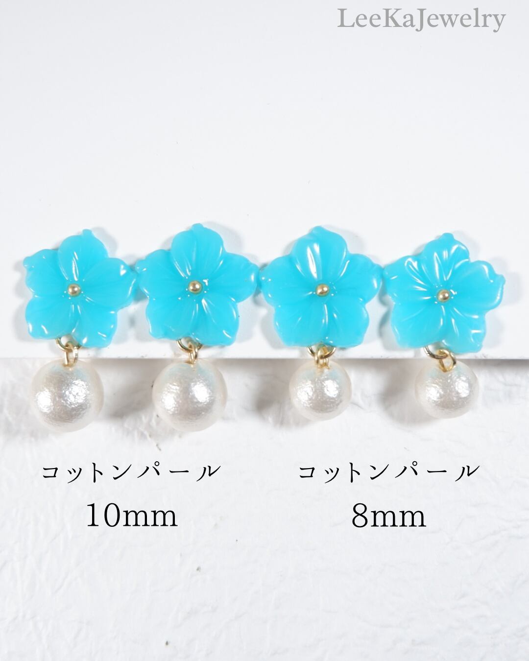 鮮やかなターコイズブルーのお花と揺れるコットンパールが夏っぽい雰囲気です。