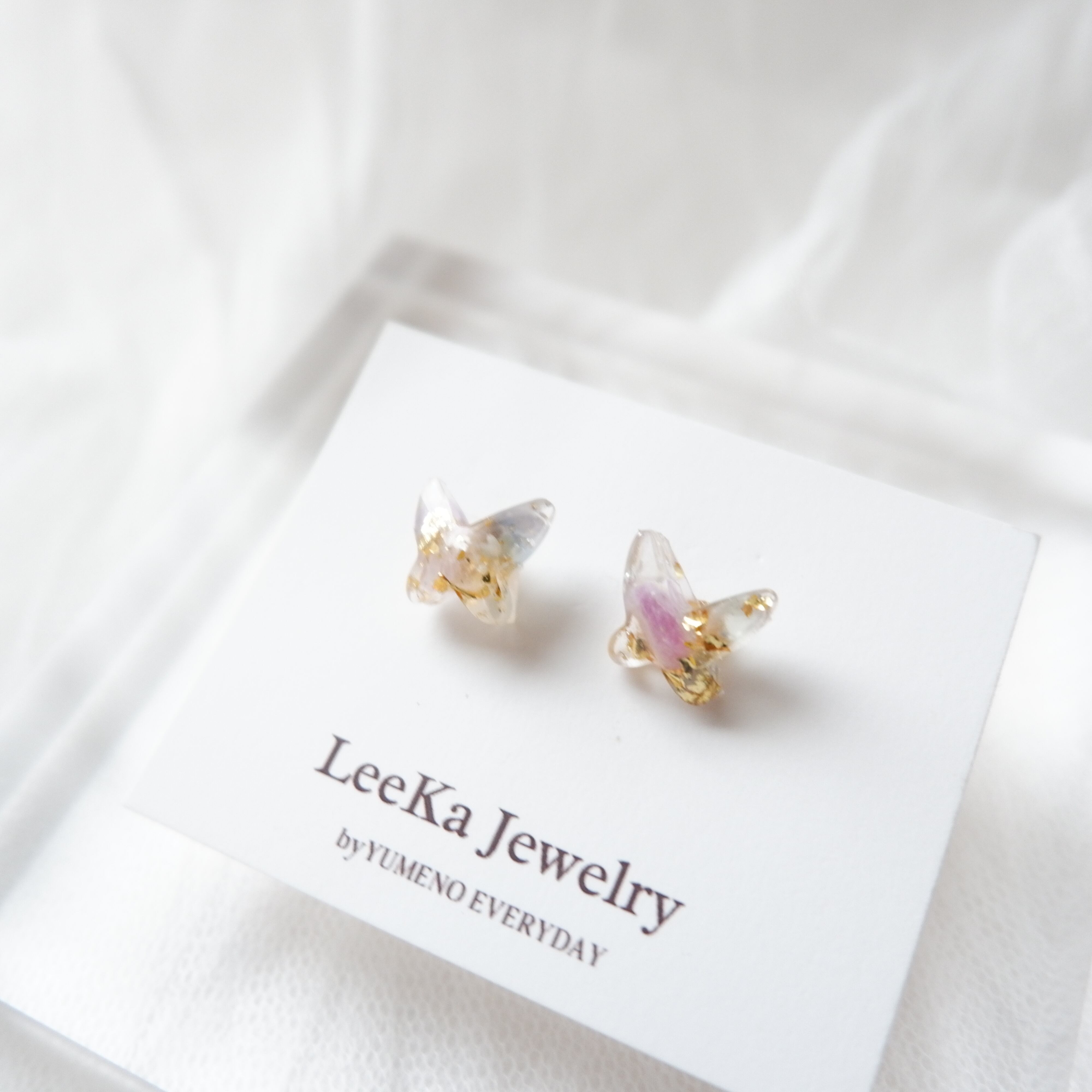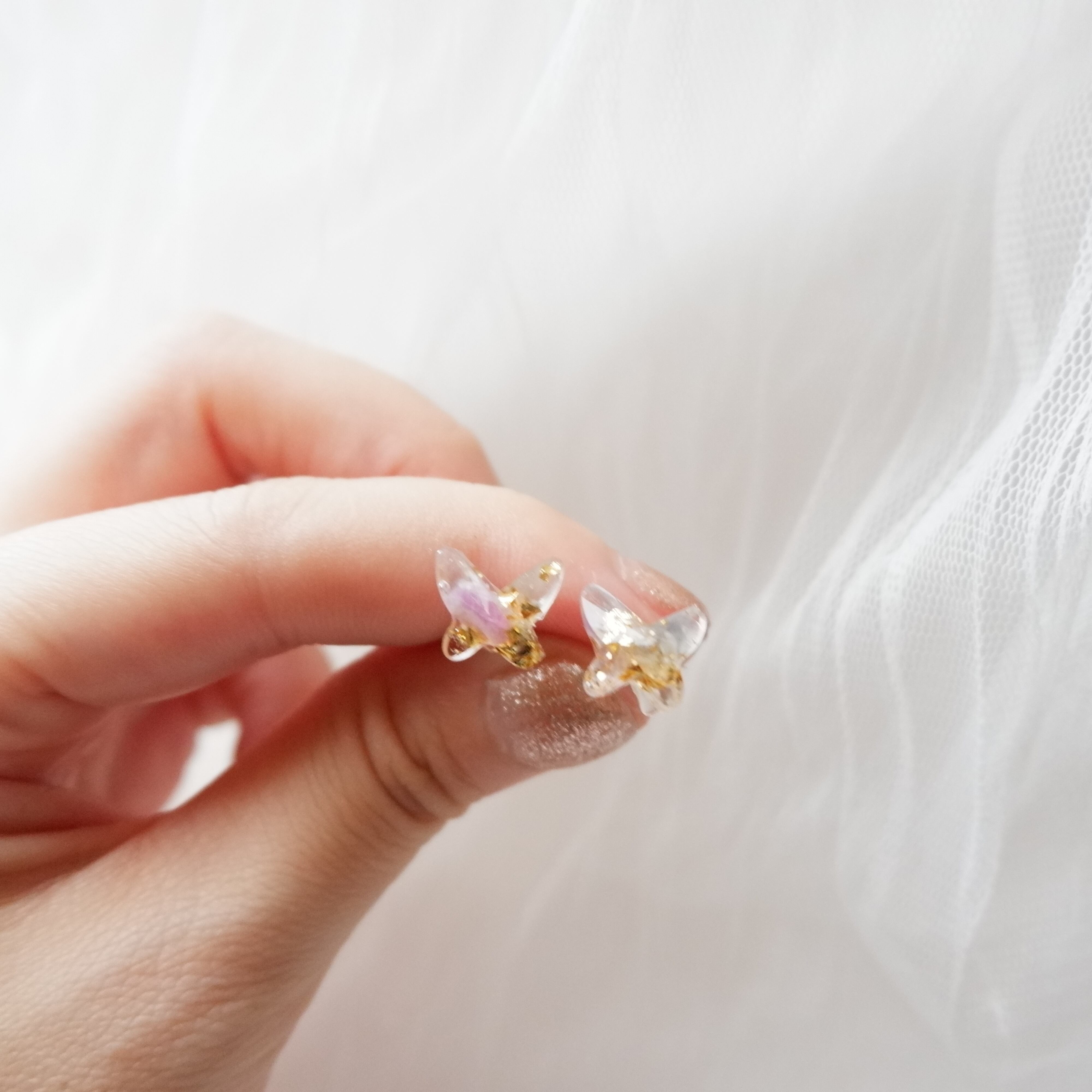 スワロフスキークリスタルの蝶々と同じ形、ジュエリーカットも忠実に再現し、不思議とキラリと煌めくようにも見えます。