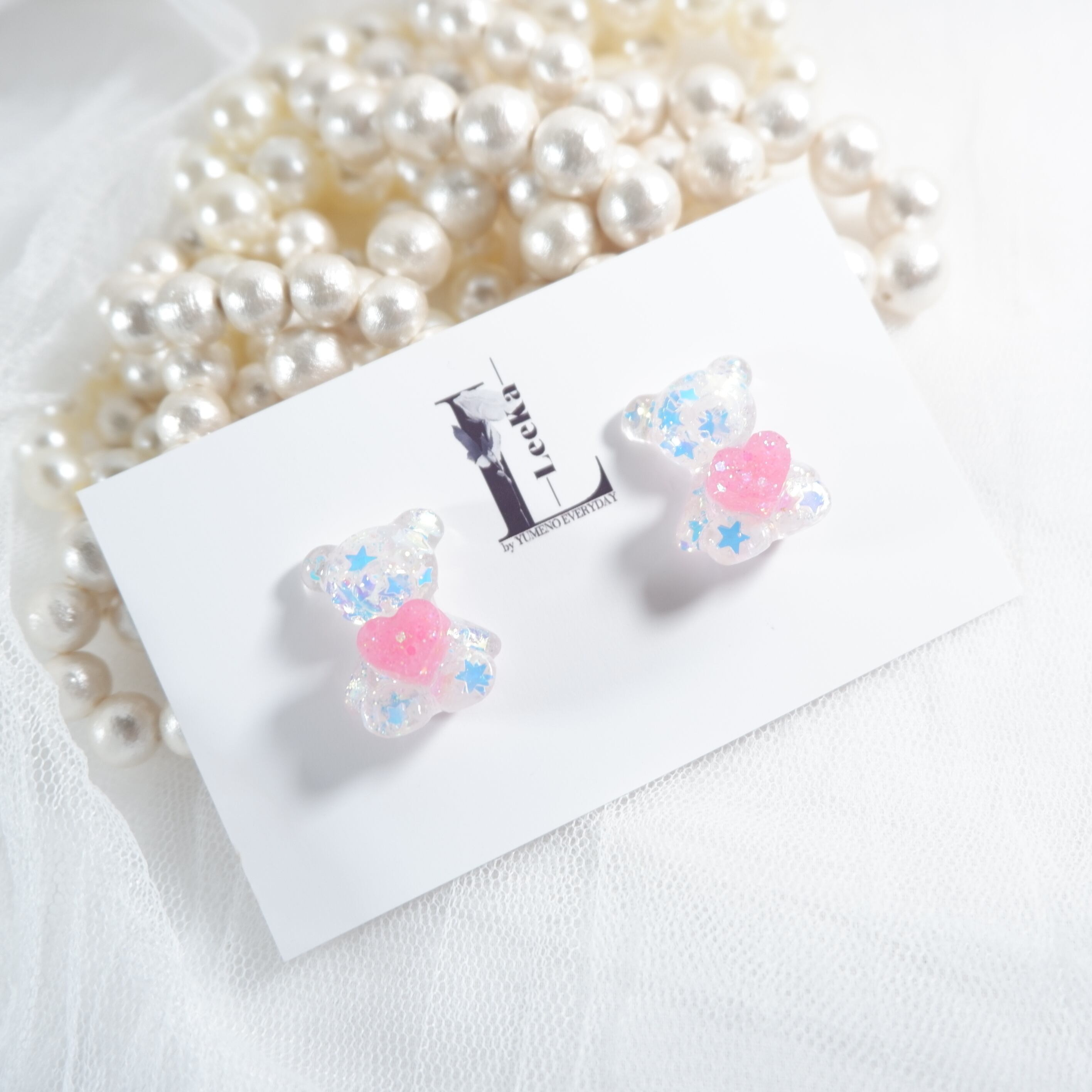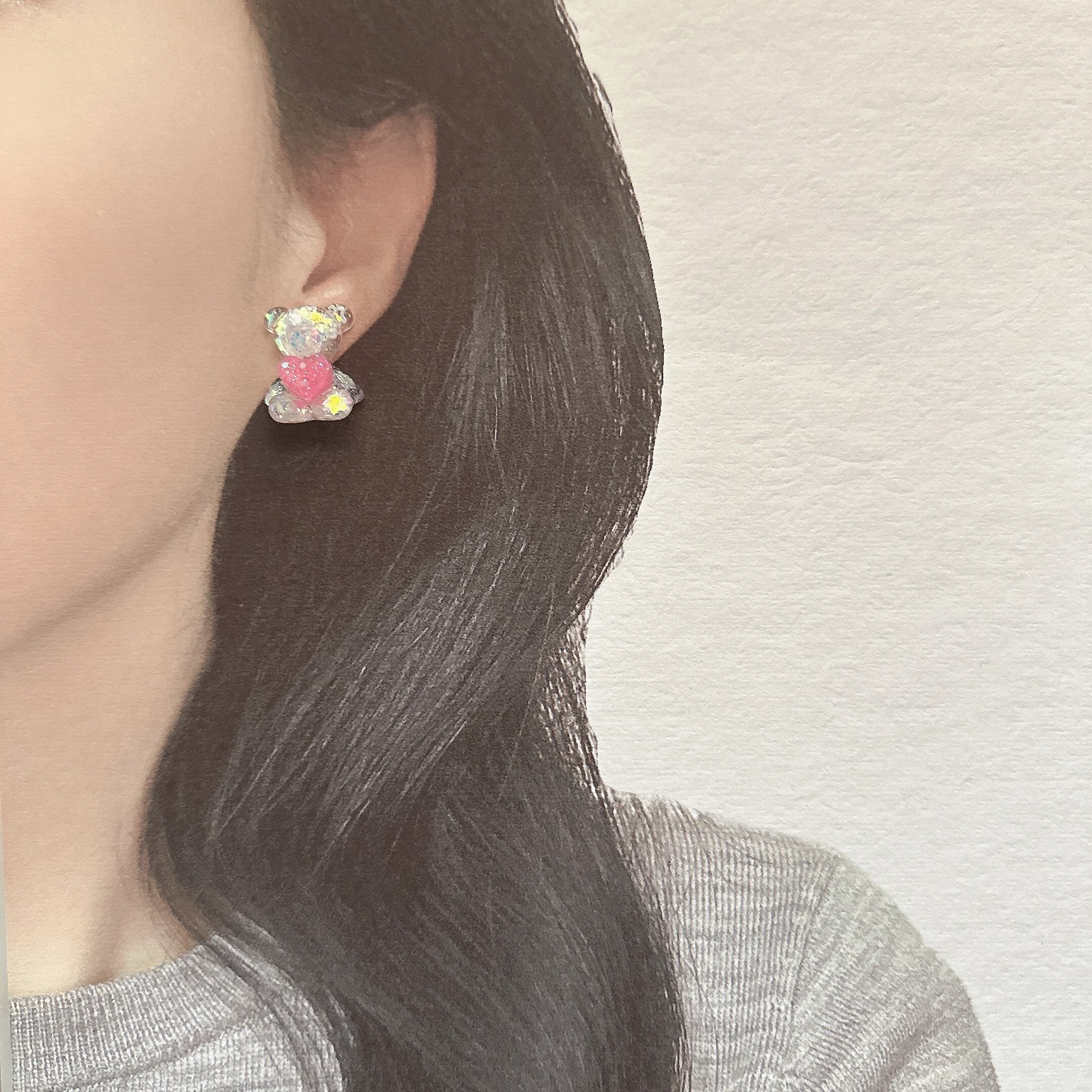 【1点限定】ピンクのハートを抱えたキラキラクマさん イヤリング/ピアス 金属アレルギー対応 サージカルステンレス