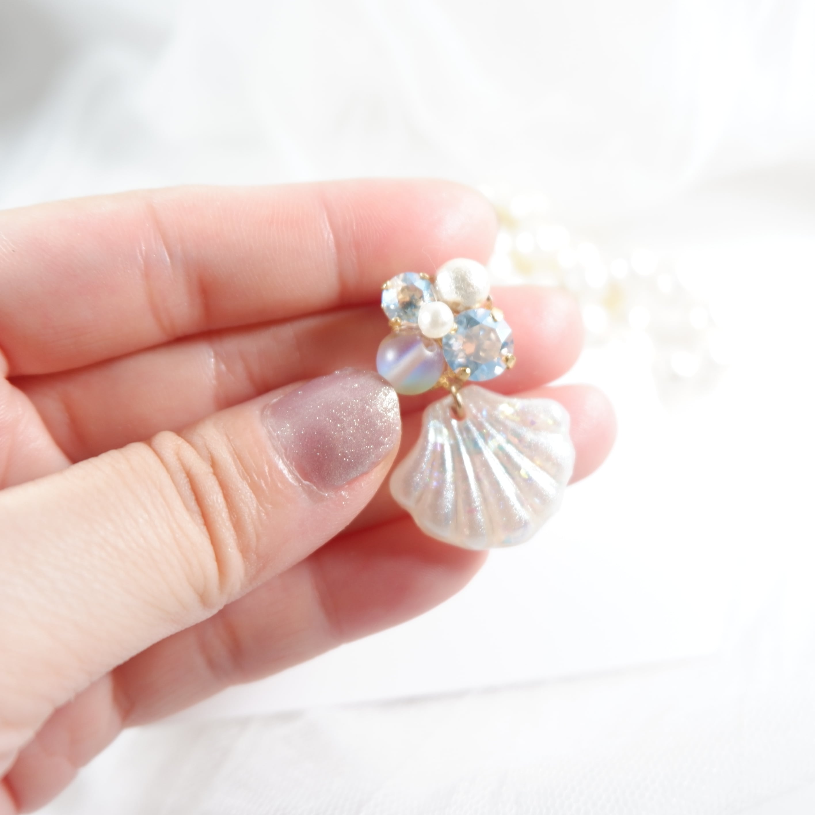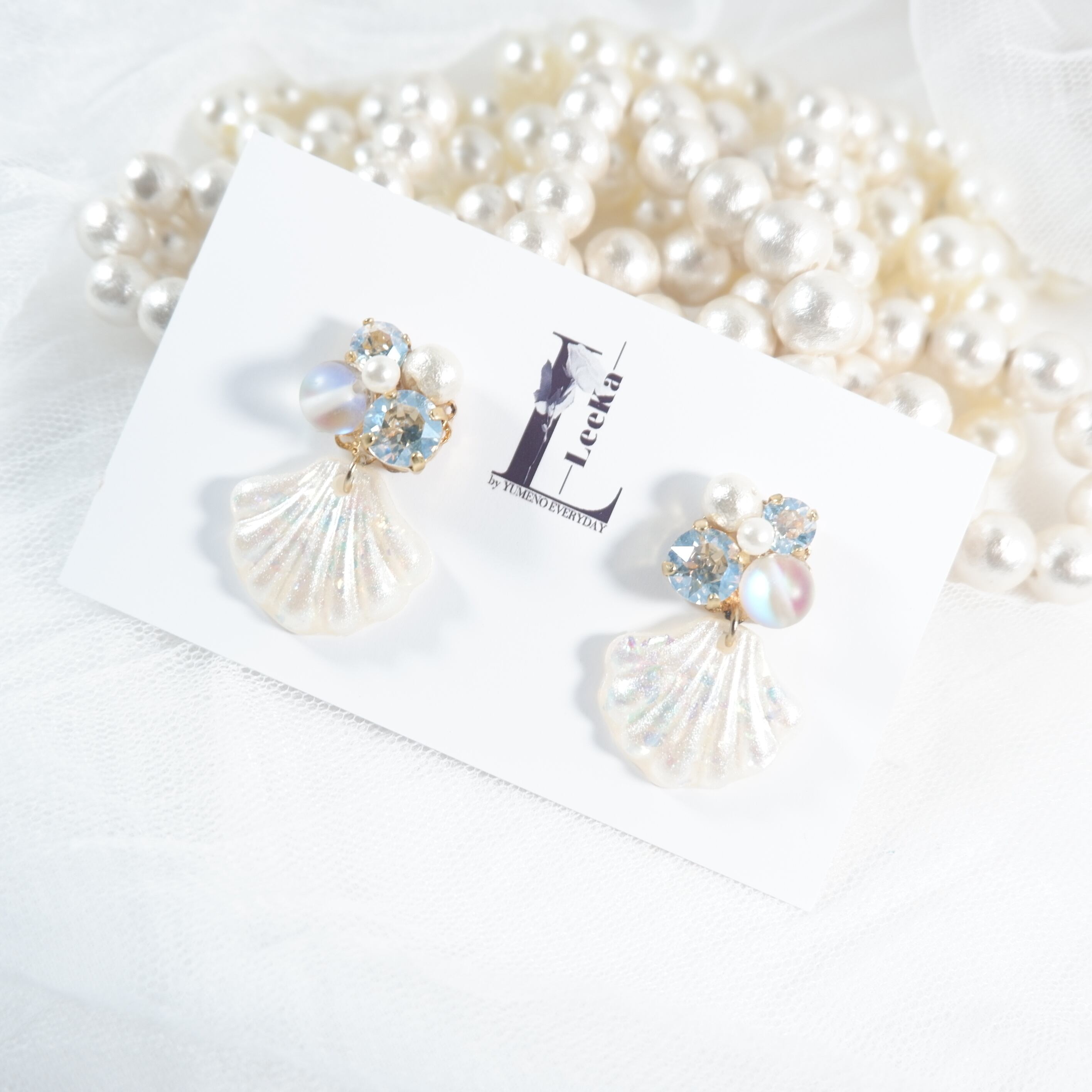 たっぷりビジューにキラメキ感のあるホワイトシェルを組み合わせたピアス、イヤリングです。