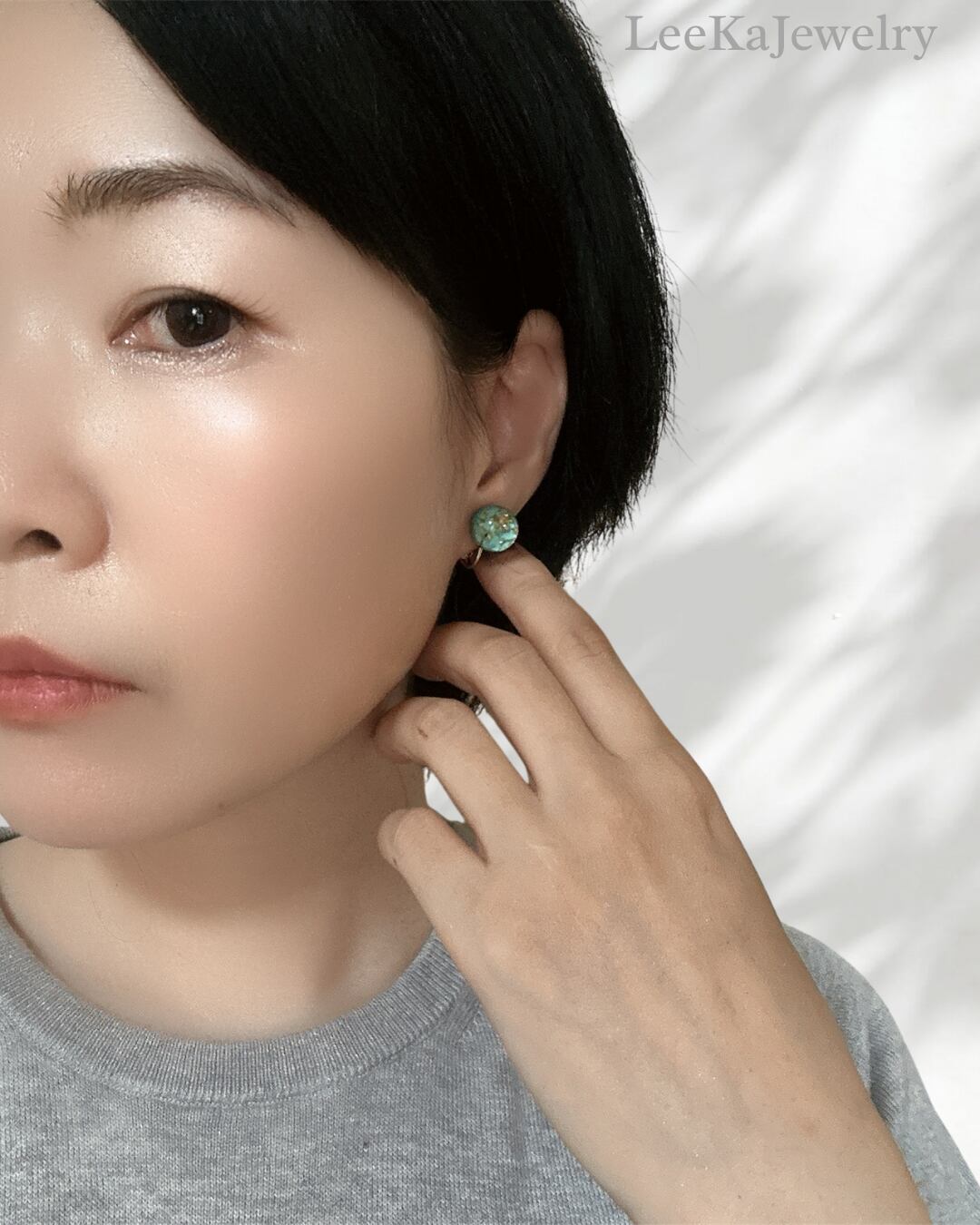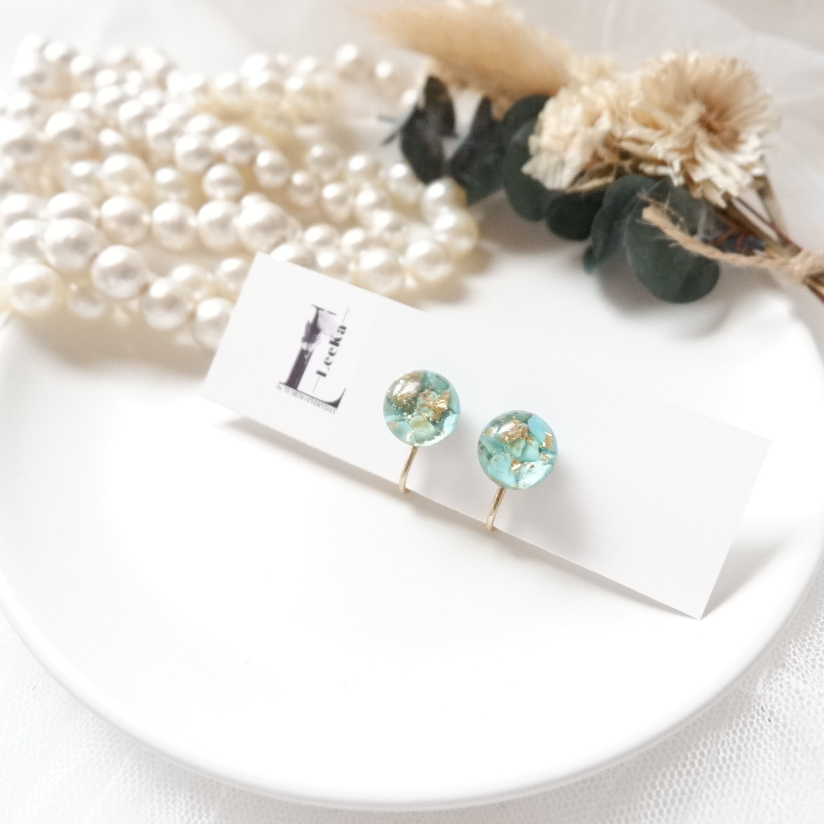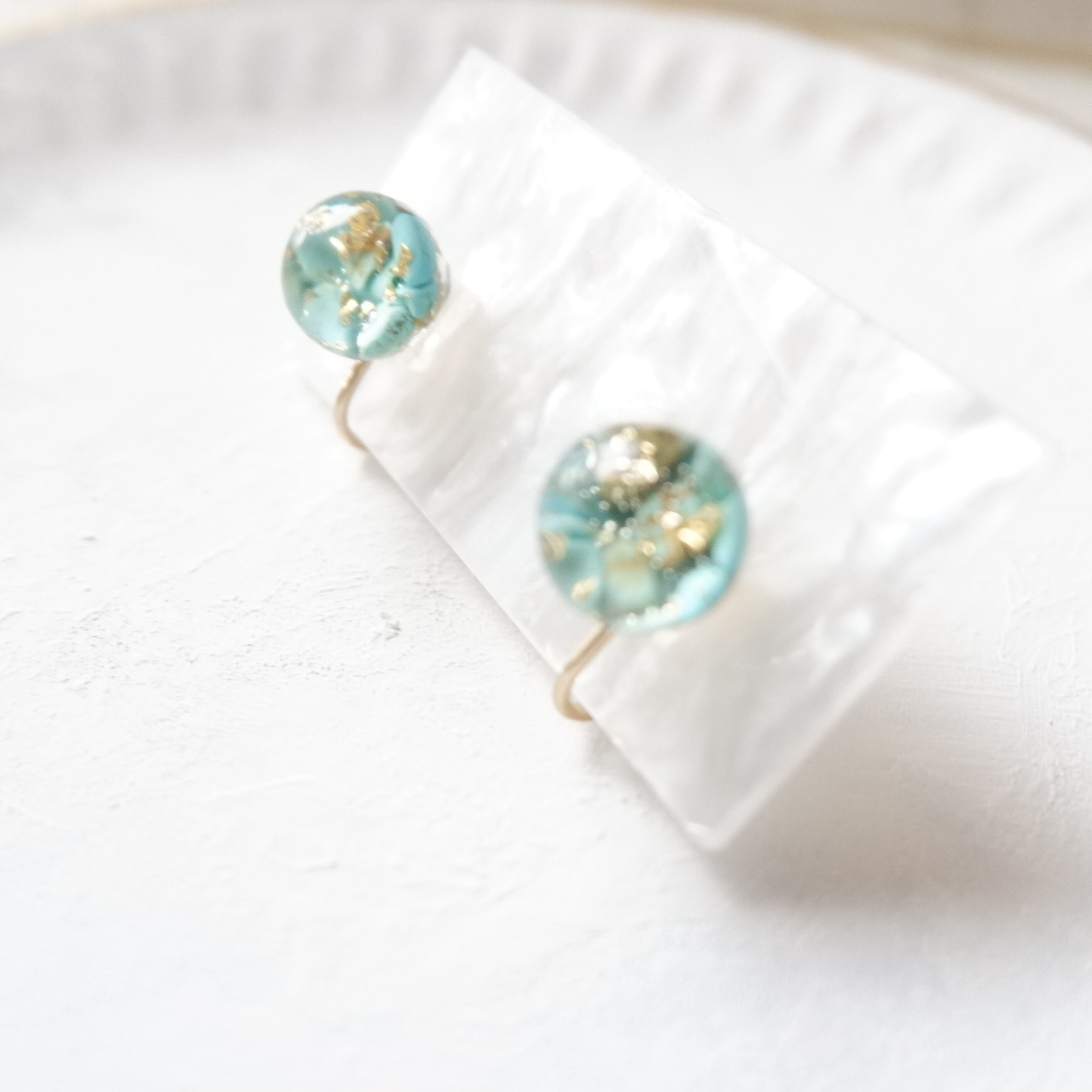 天然石のターコイズのさざれと金箔を綺麗なSphere(球体)にアクアリウムのように閉じ込めた1粒タイプの耳飾りです。