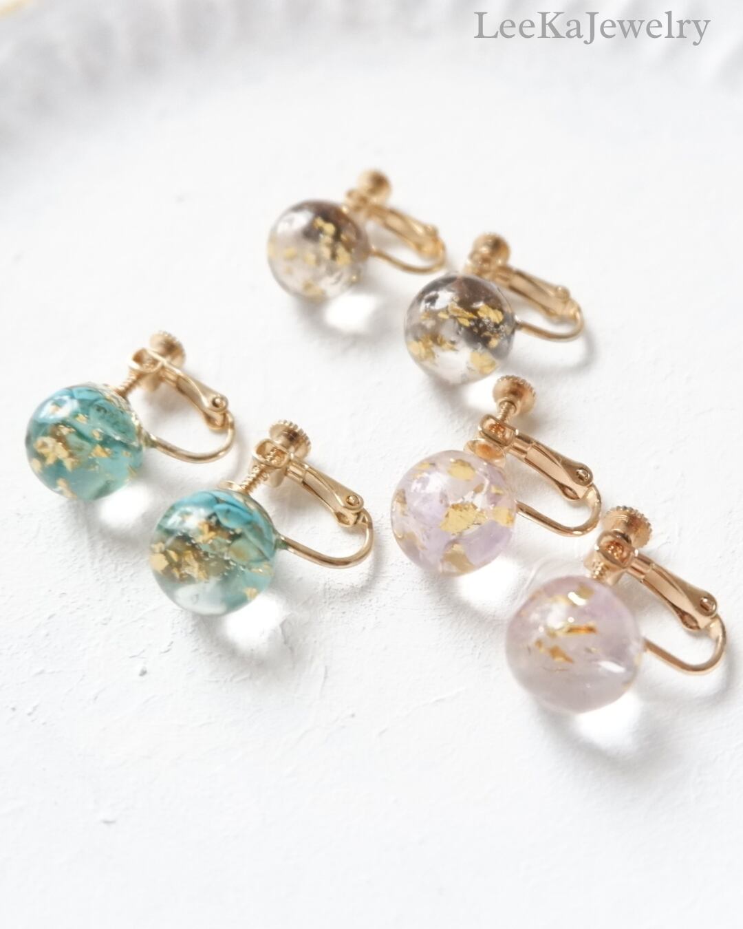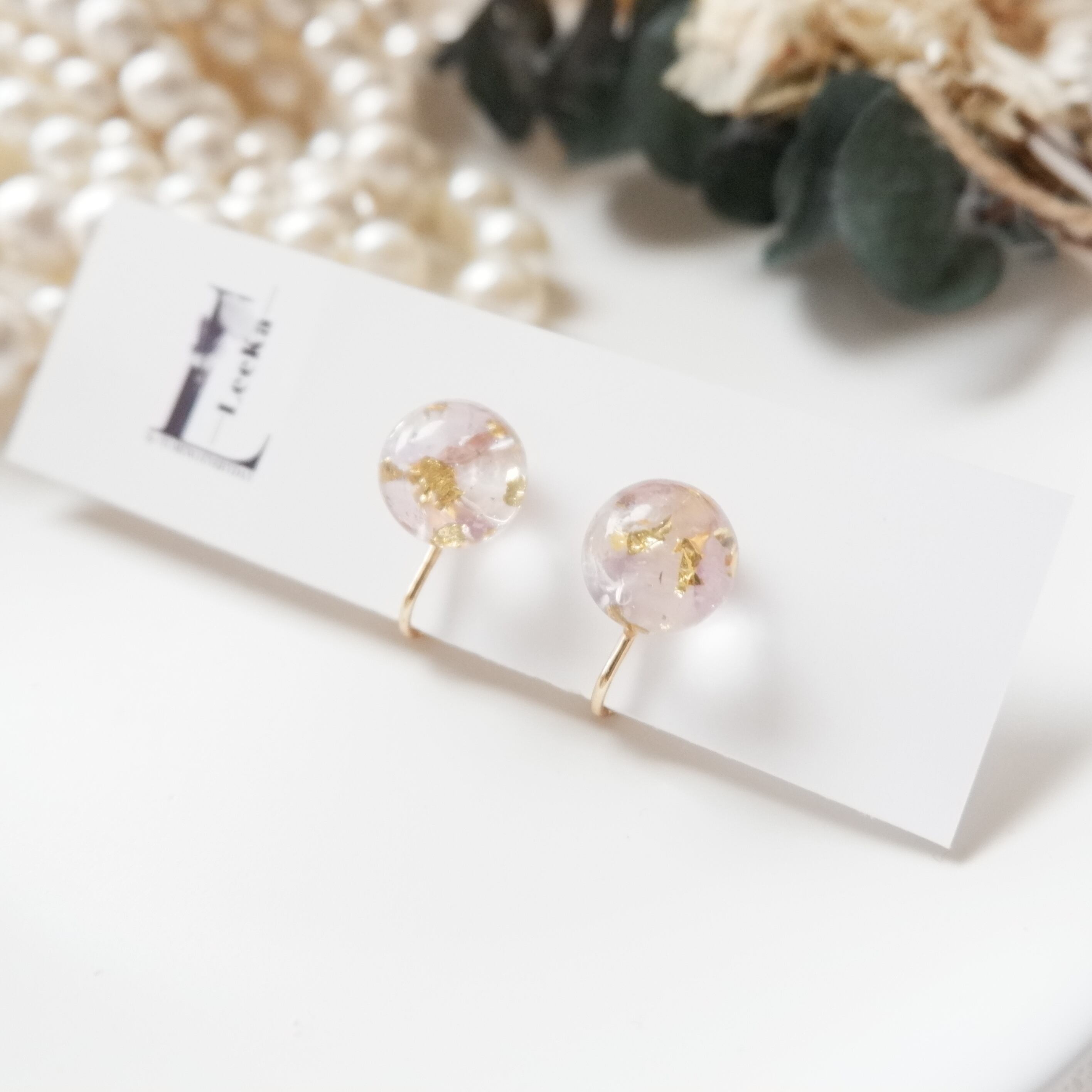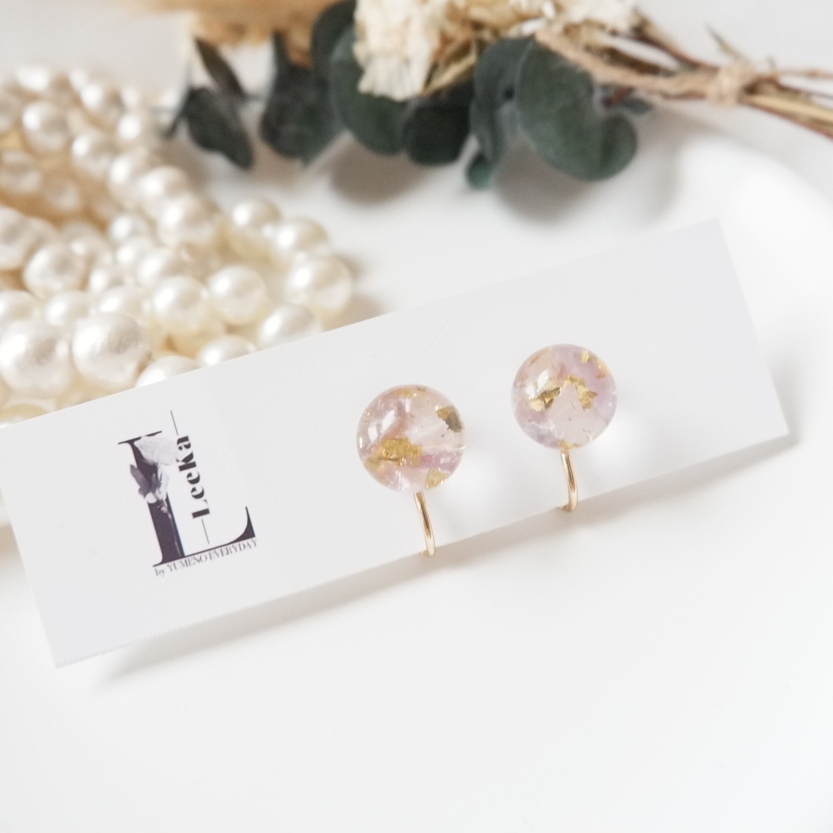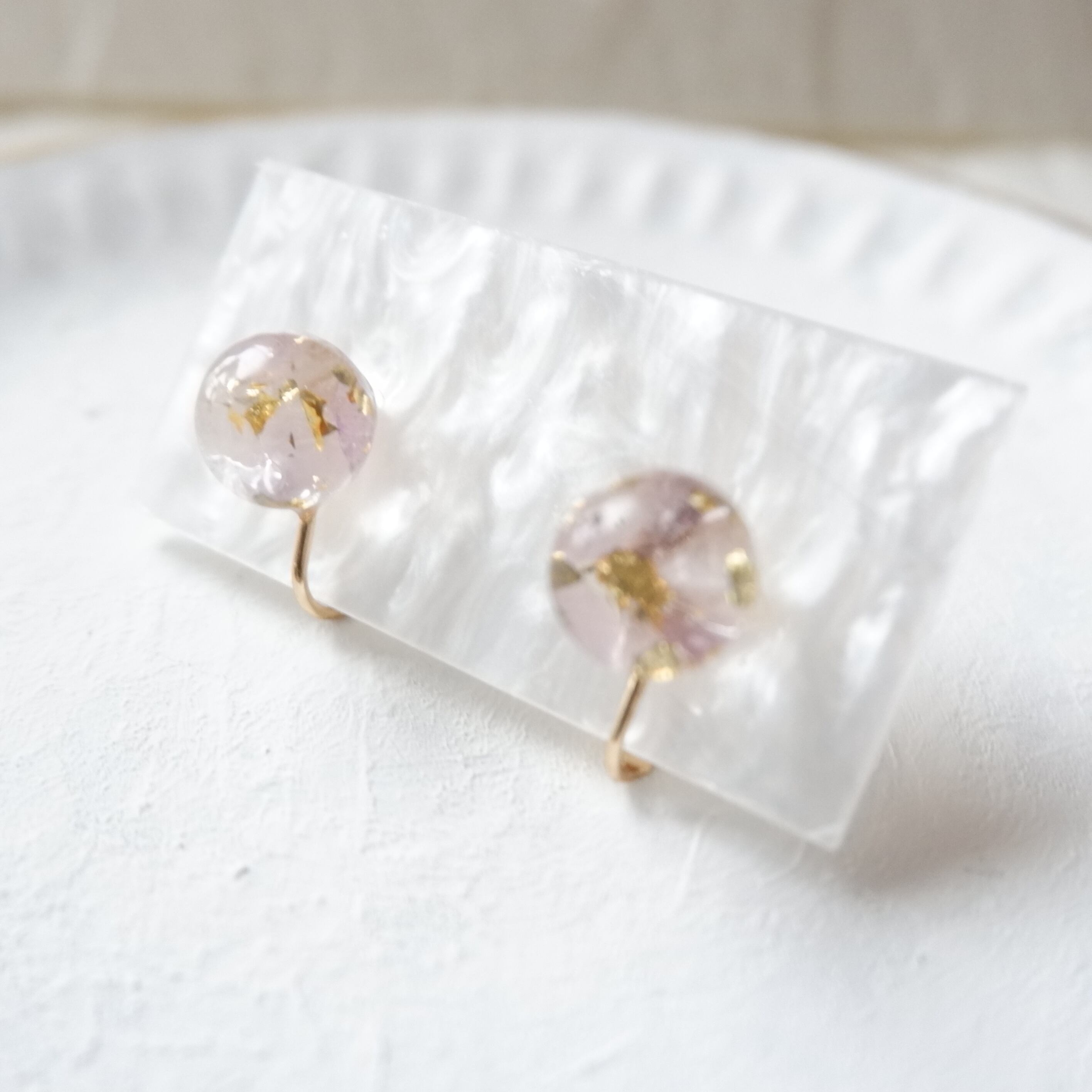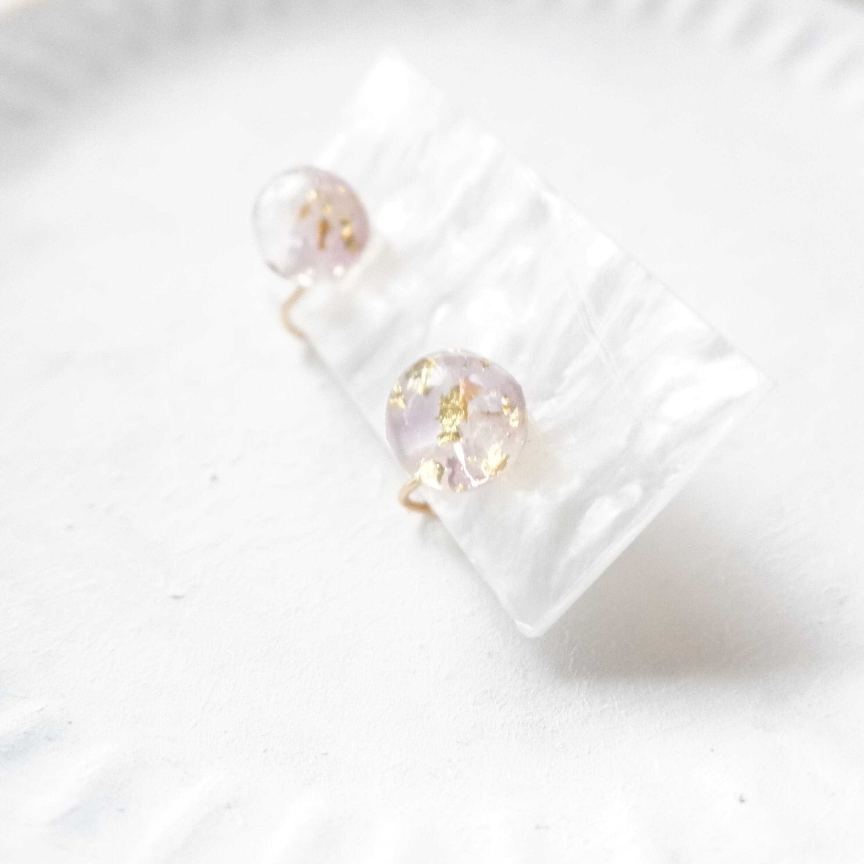 天然石のアメジストとローズクォーツのさざれと金箔を綺麗なSphere(球体)にアクアリウムのように閉じ込めた1粒タイプの耳飾りです。