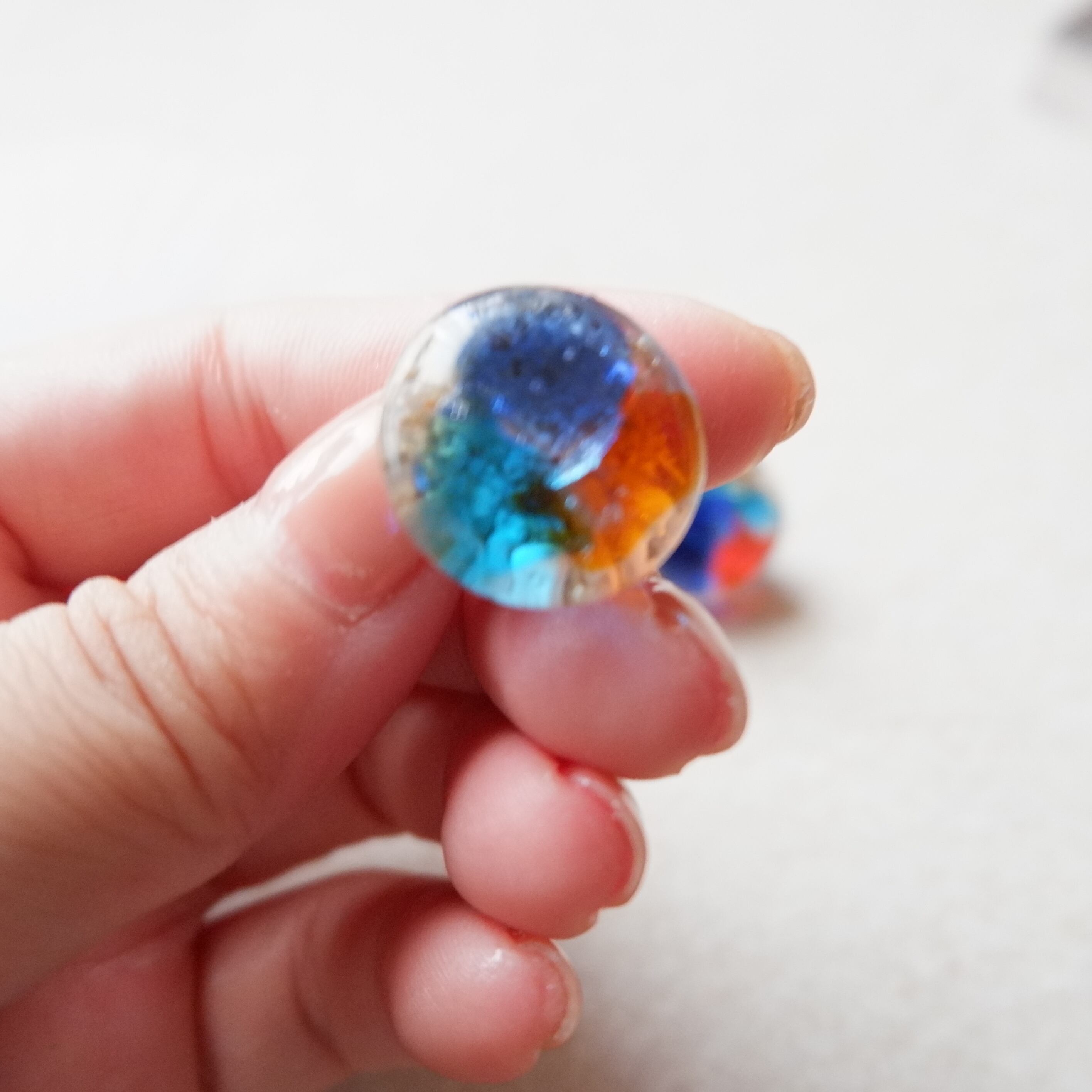琉球ガラスは濃いブルー、水色、オレンジの3色を閉じ込めています。