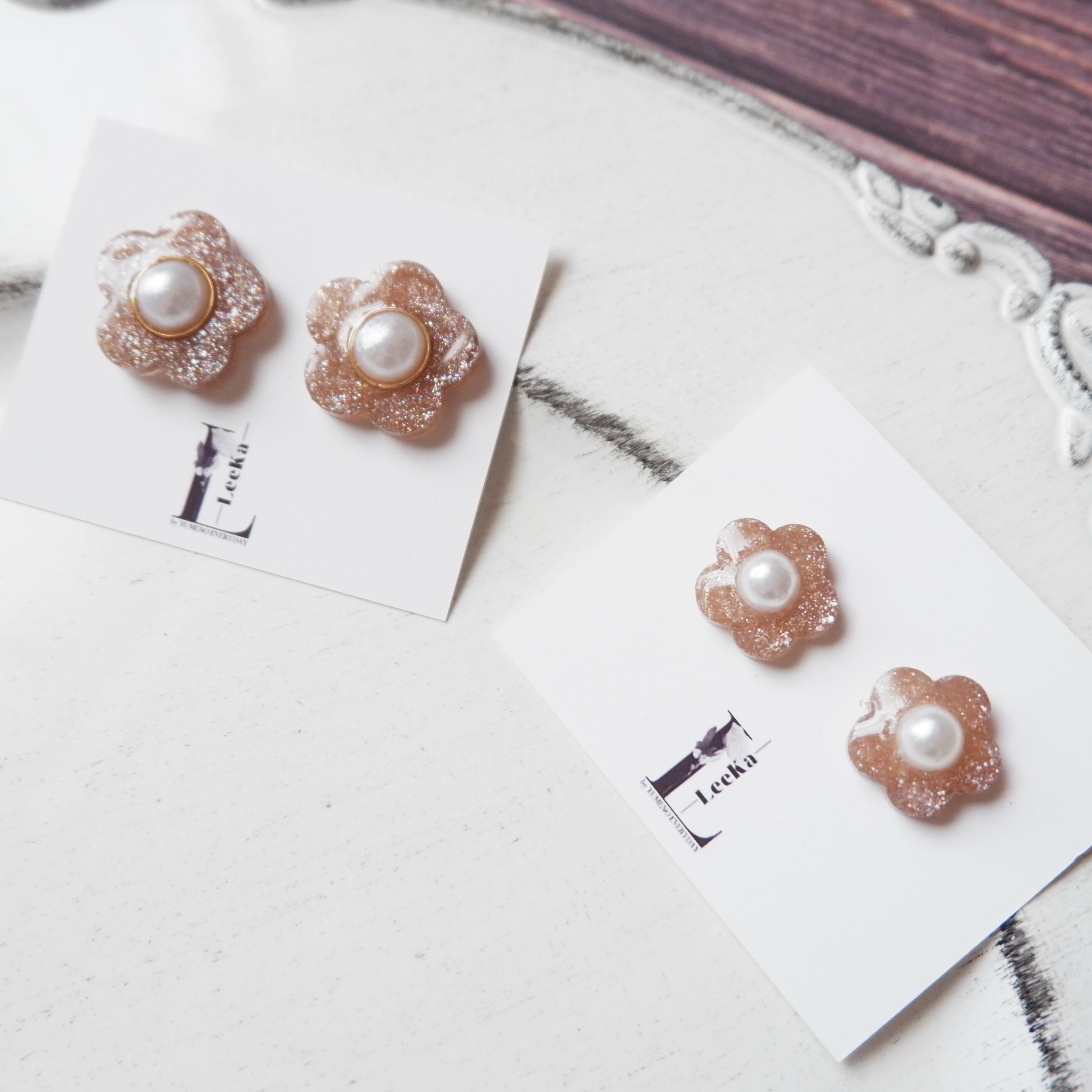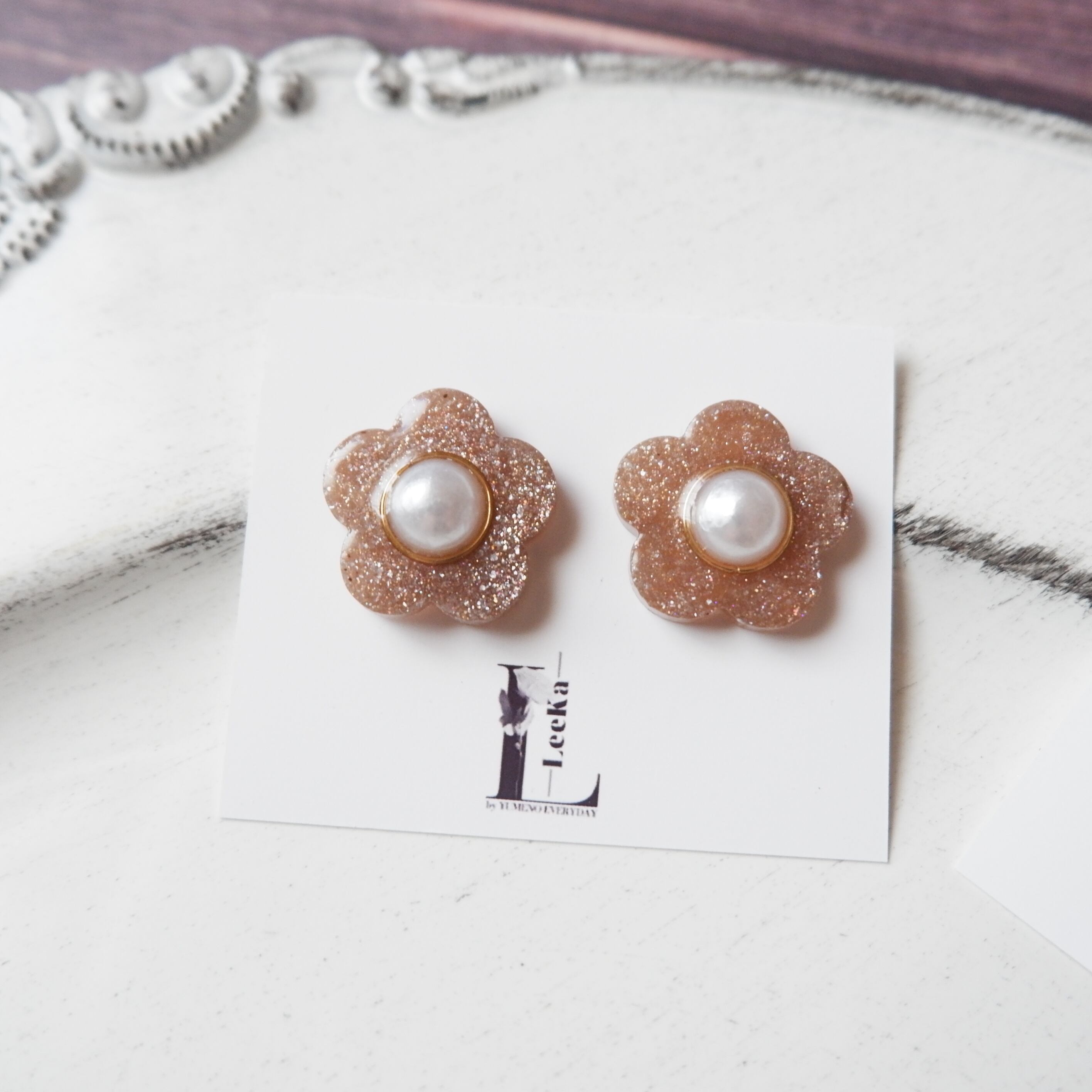 ④お花 キラキラ ブラウン シンプル 一粒 イヤリング/ピアス 金属アレルギー対応 サージカルステンレス