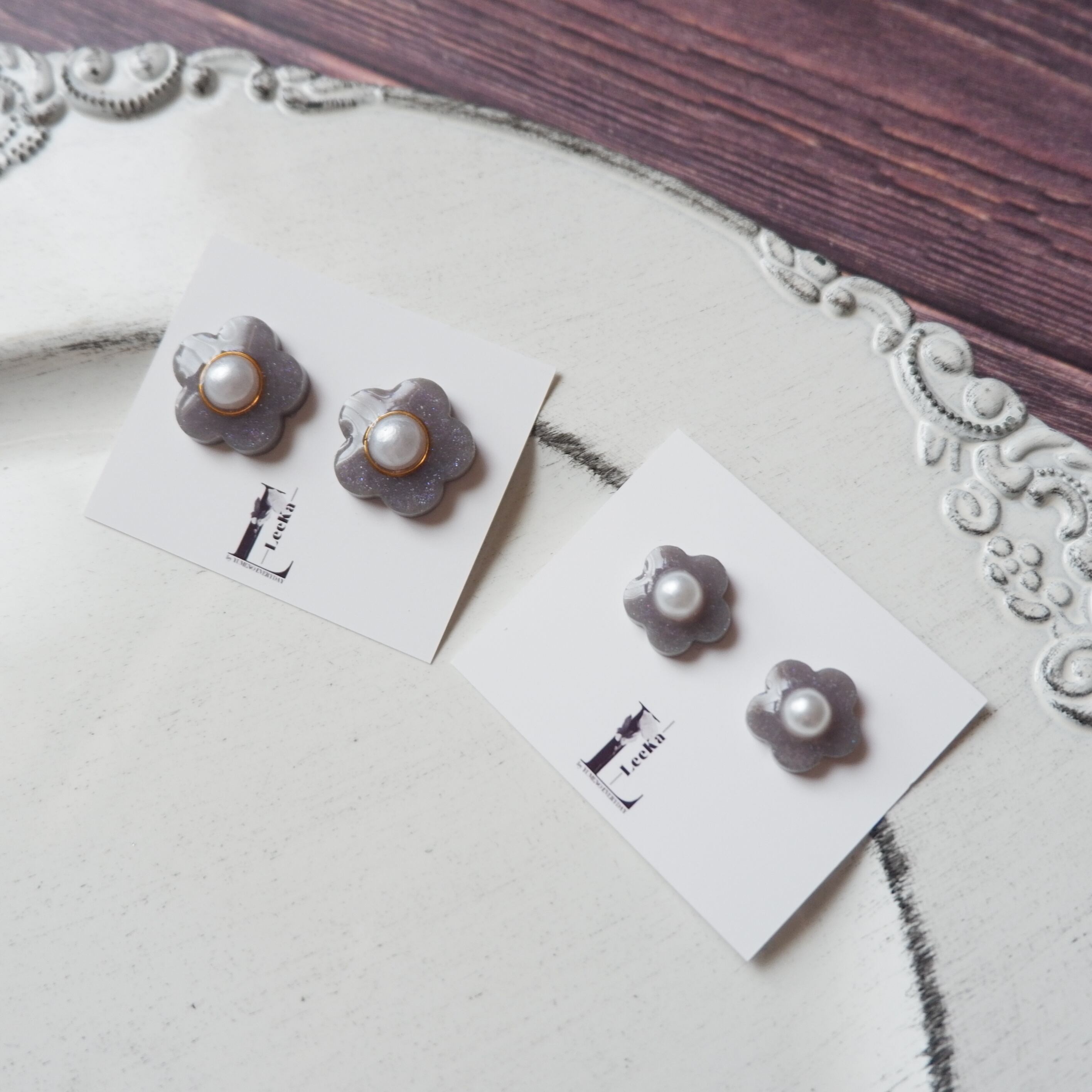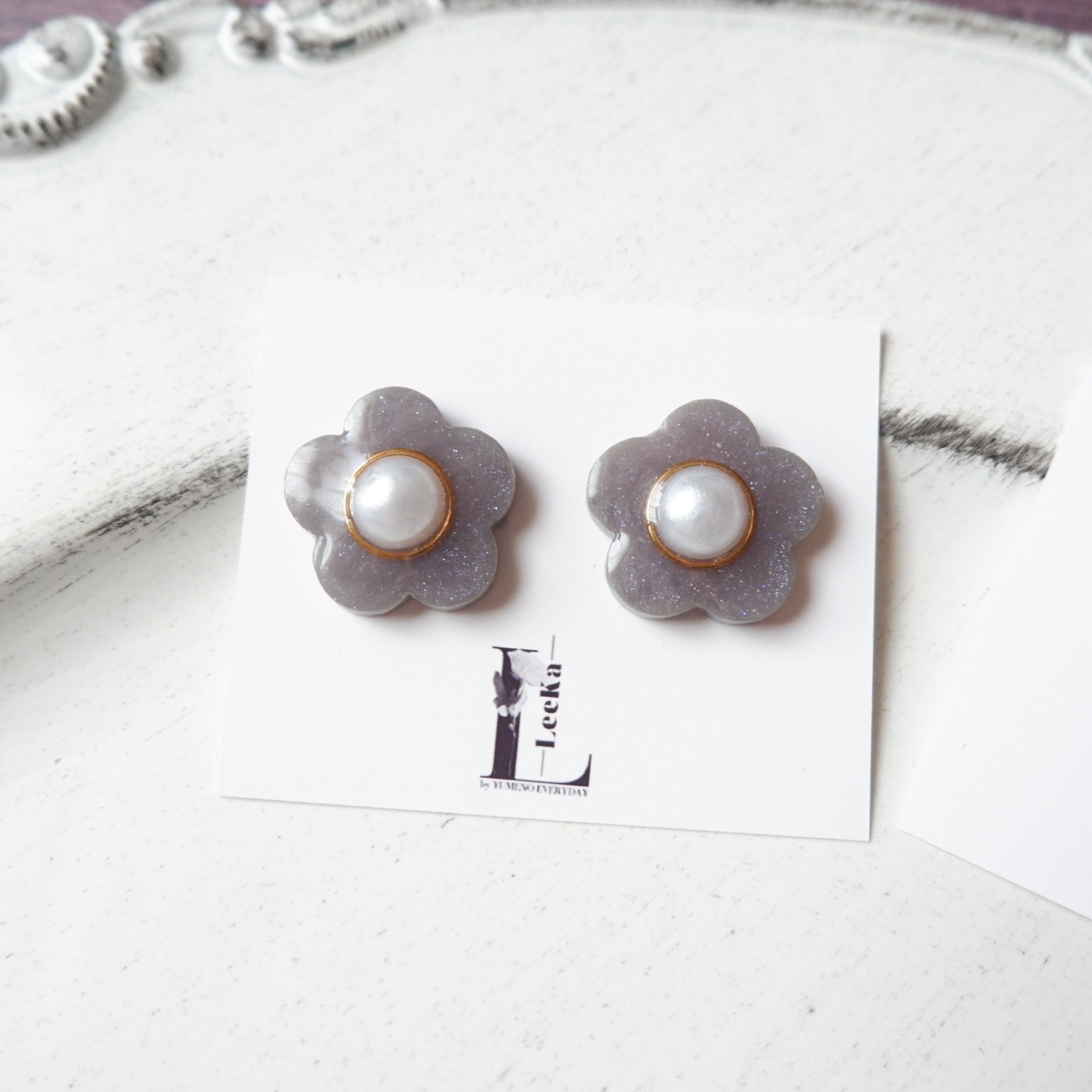 ⑪ お花 パール感 グレー シンプル 一粒 イヤリング/ピアス 金属アレルギー対応 サージカルステンレス