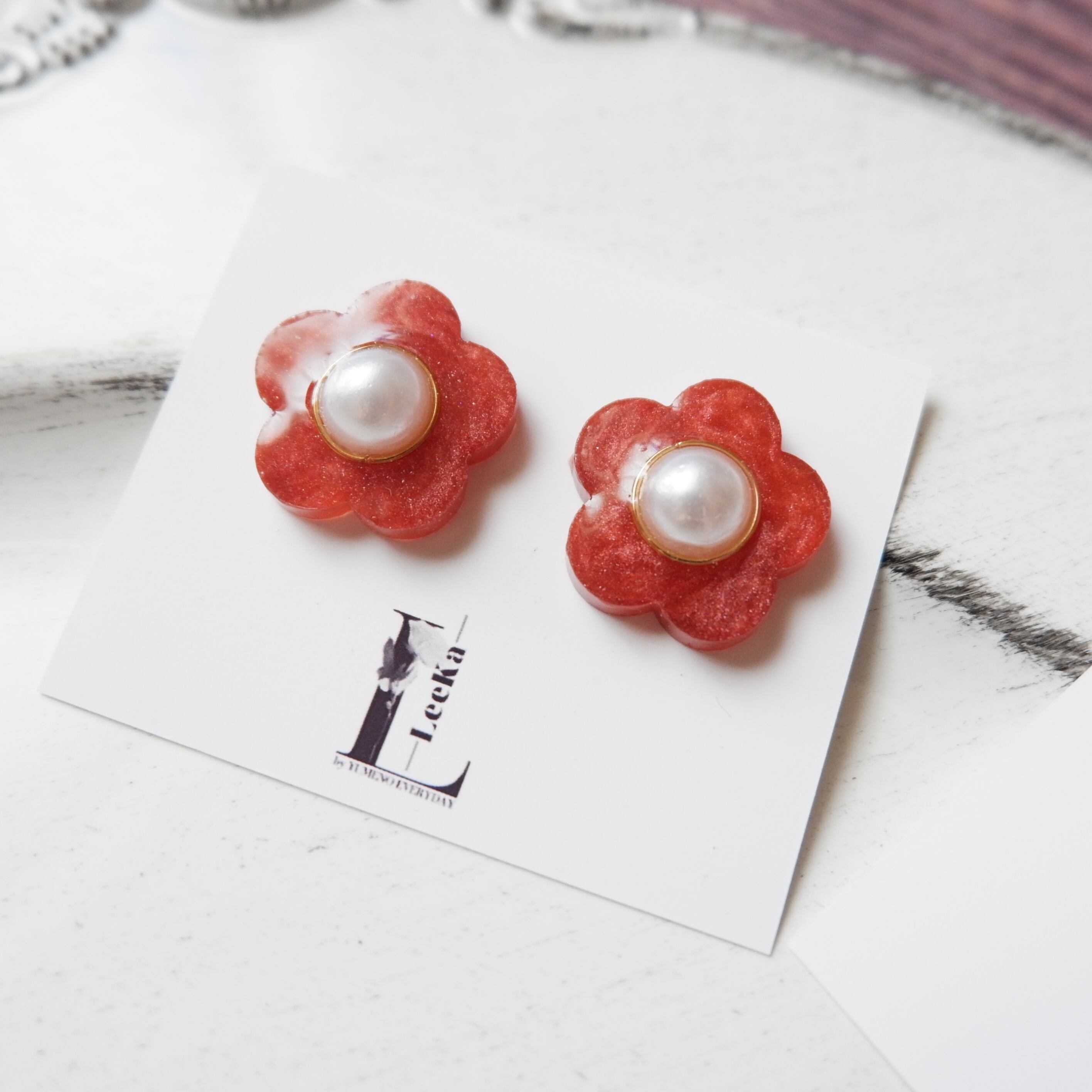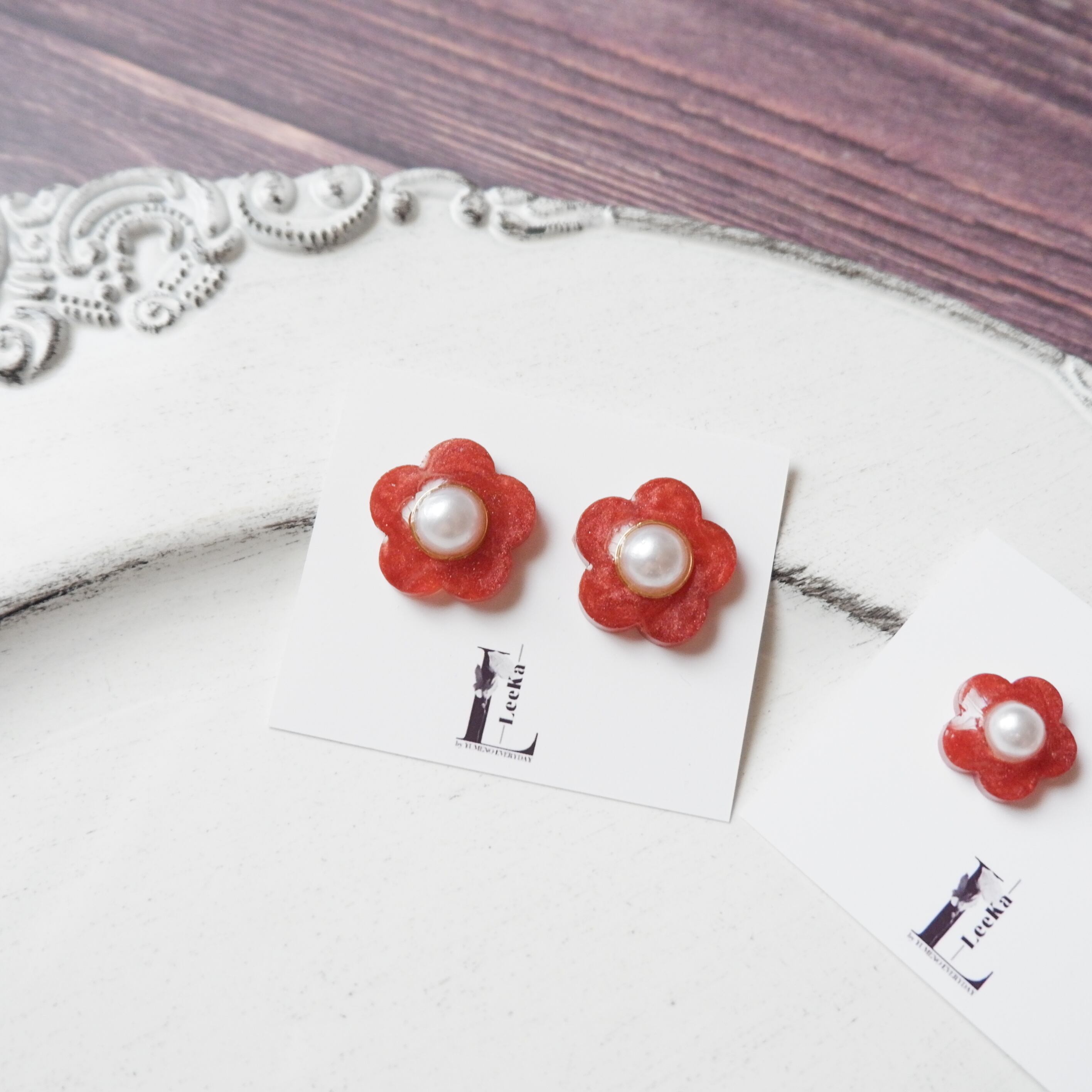 ⑫ お花 パール感 ディープレッド シンプル 一粒 イヤリング/ピアス 金属アレルギー対応 サージカルステンレス