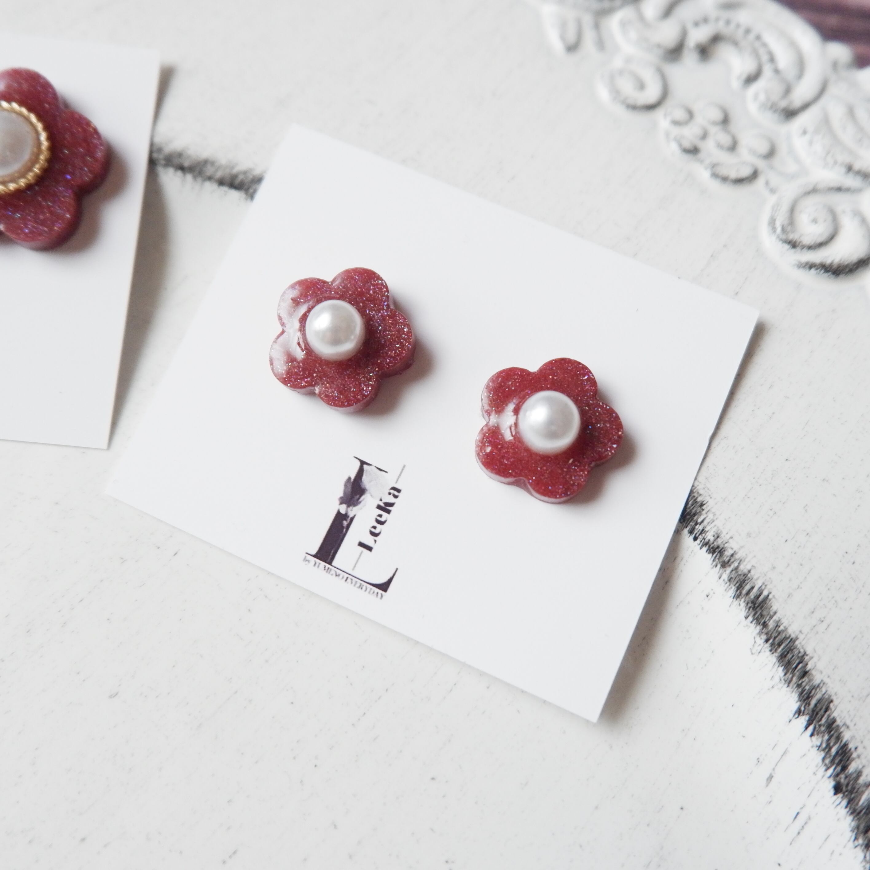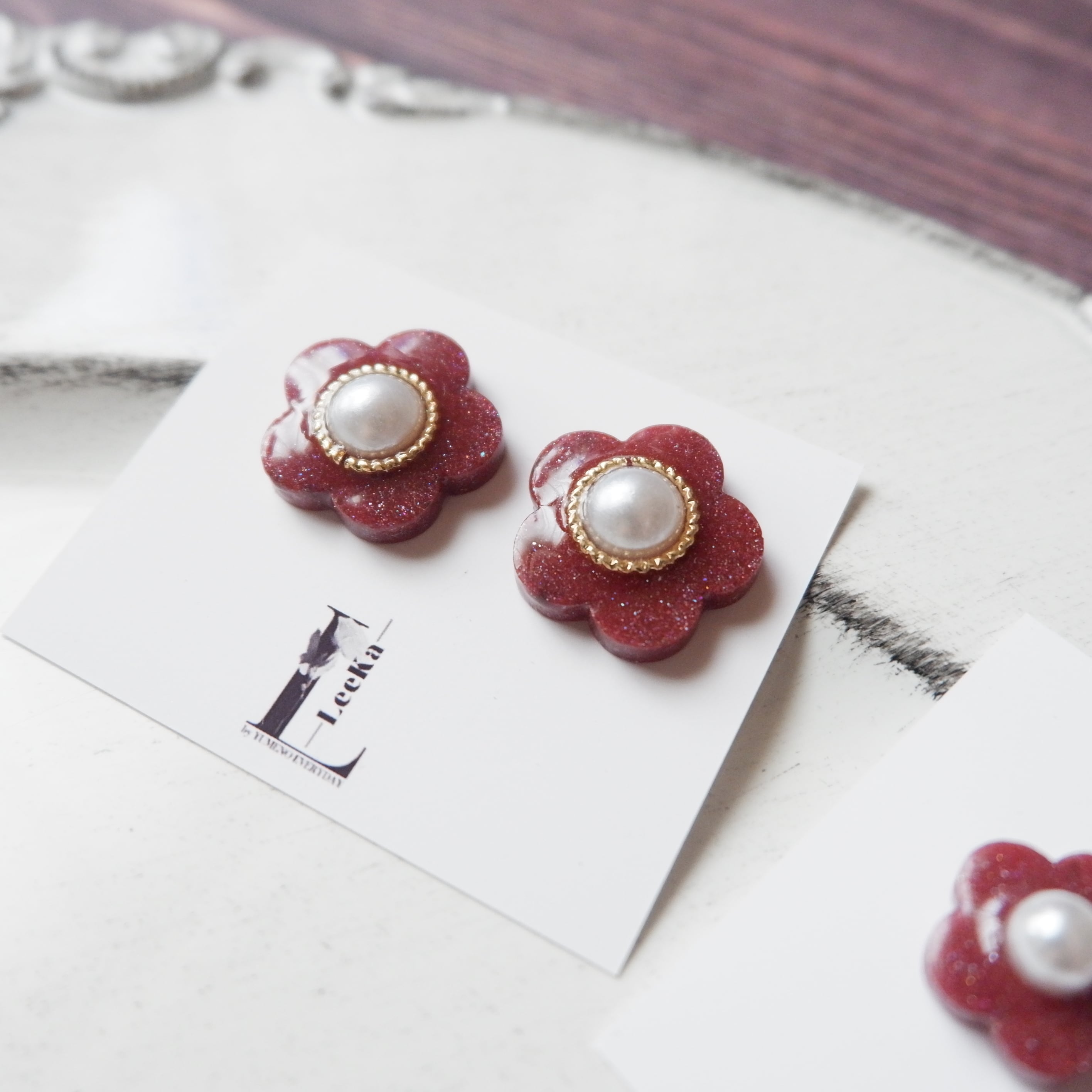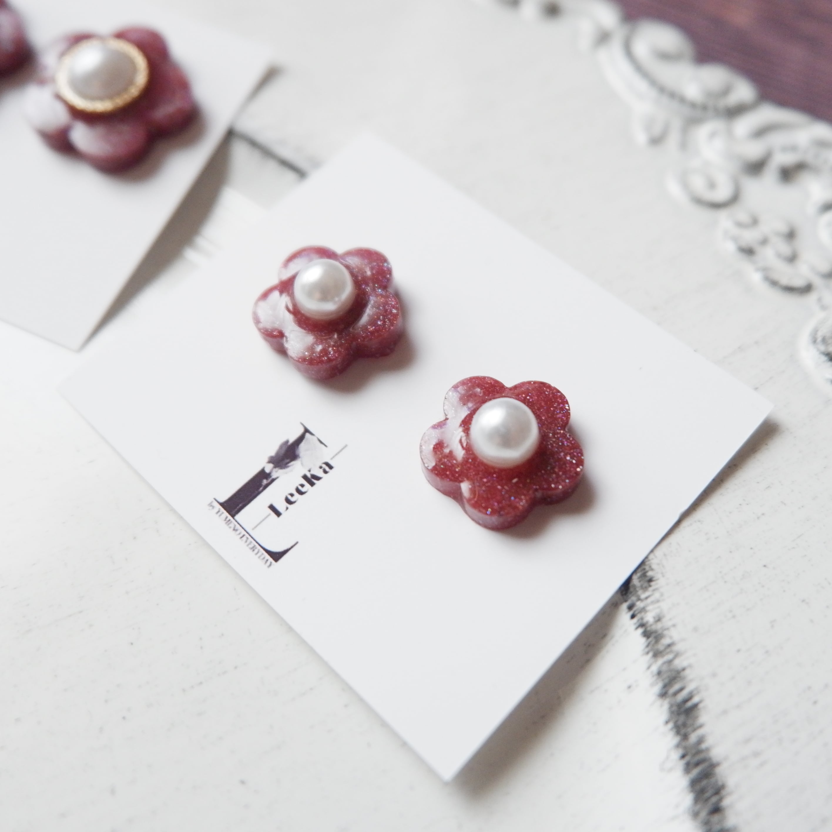⑬ お花 パール感 ダークレッド シンプル 一粒 イヤリング/ピアス 金属アレルギー対応 サージカルステンレス