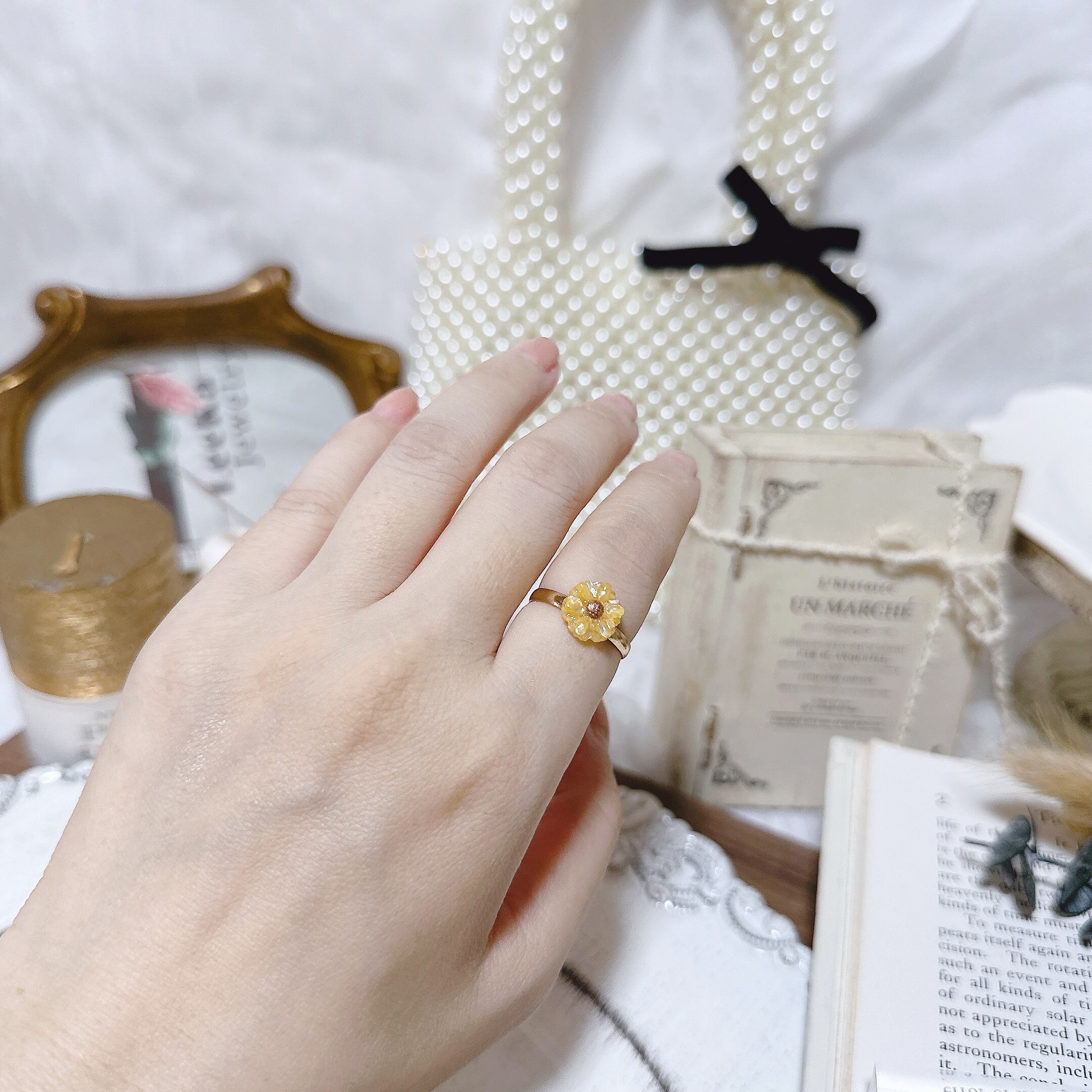 約1cmの小さなひまわりが大人女性のお手元をとても上品で可愛らしい雰囲気にしれくれます。