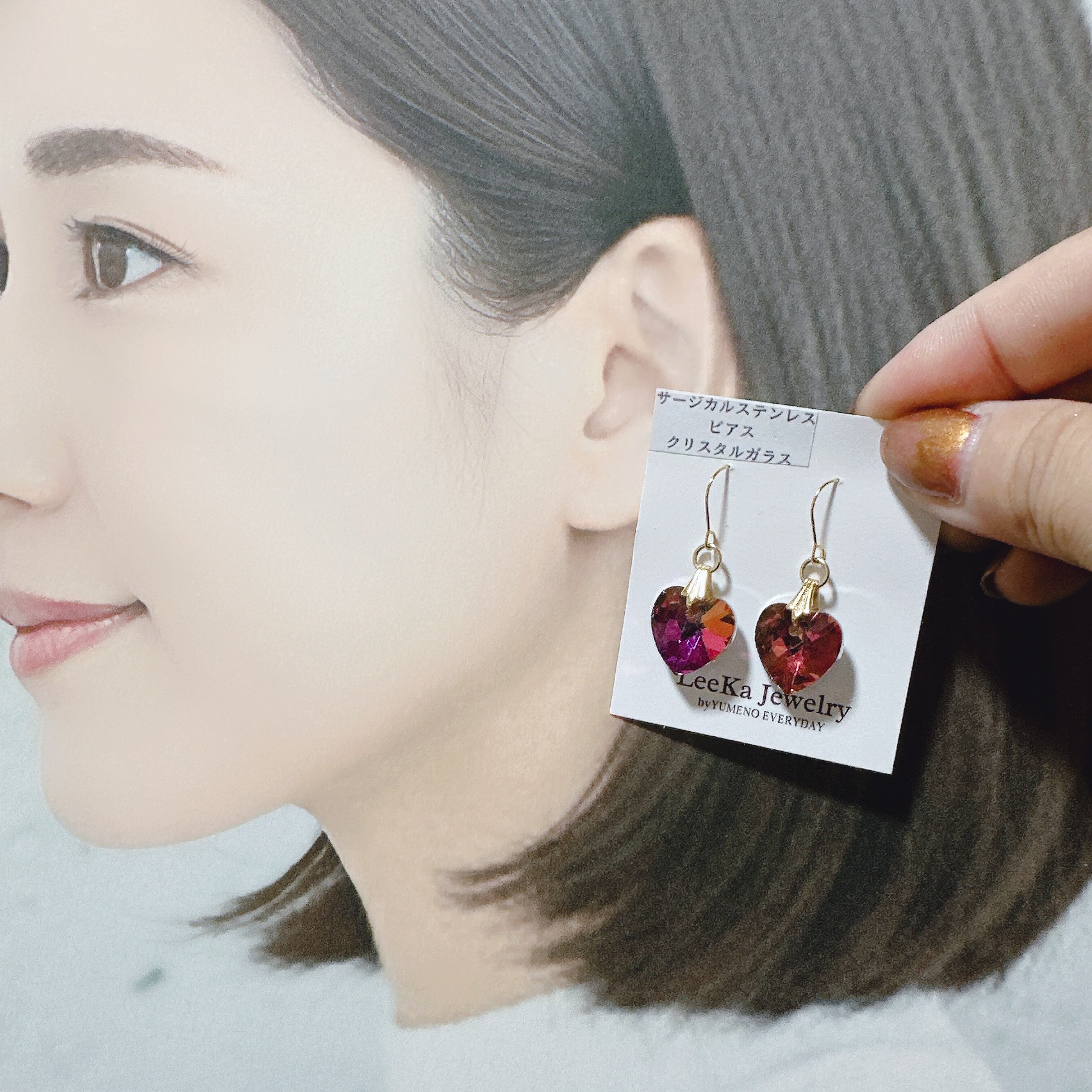 少し大きめのハートが揺れる度に変わるオレンジからパープルへのカラーが華やかなお耳元に致します。