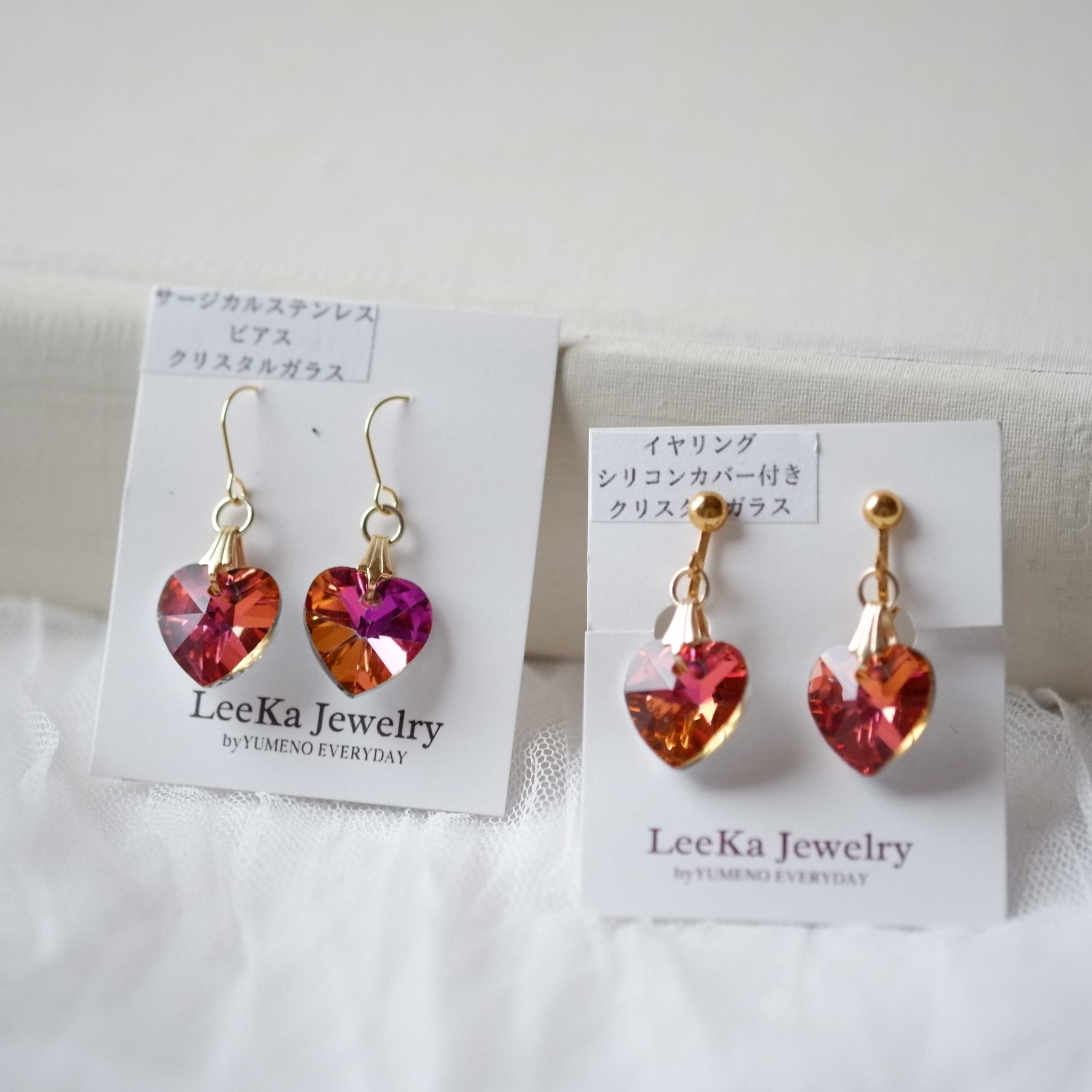 ハロウィンカラーのグラデーションが綺麗なハートのクリスタルガラスのピアス、イヤリングです。