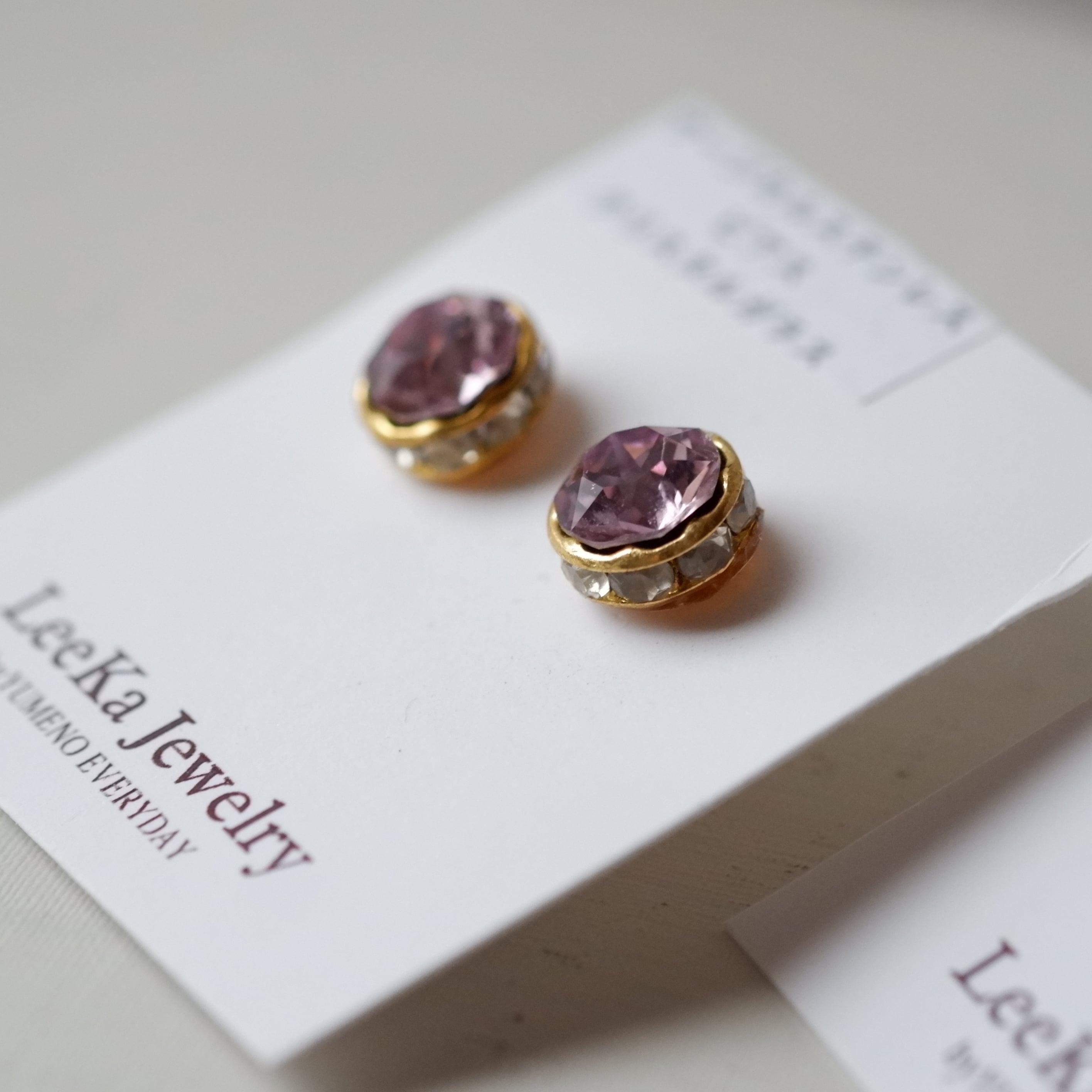 クリスタルガラスのライトアメジストをクリスタルガラスを埋め込んだ台座にはめたピアスになります。
