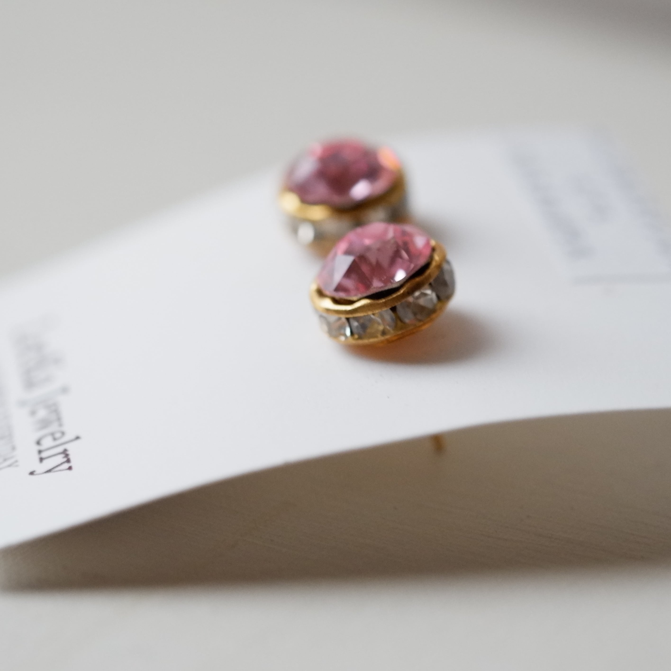 クリスタルガラスのライトピンクをクリスタルガラスを埋め込んだ台座にはめたピアスになります。