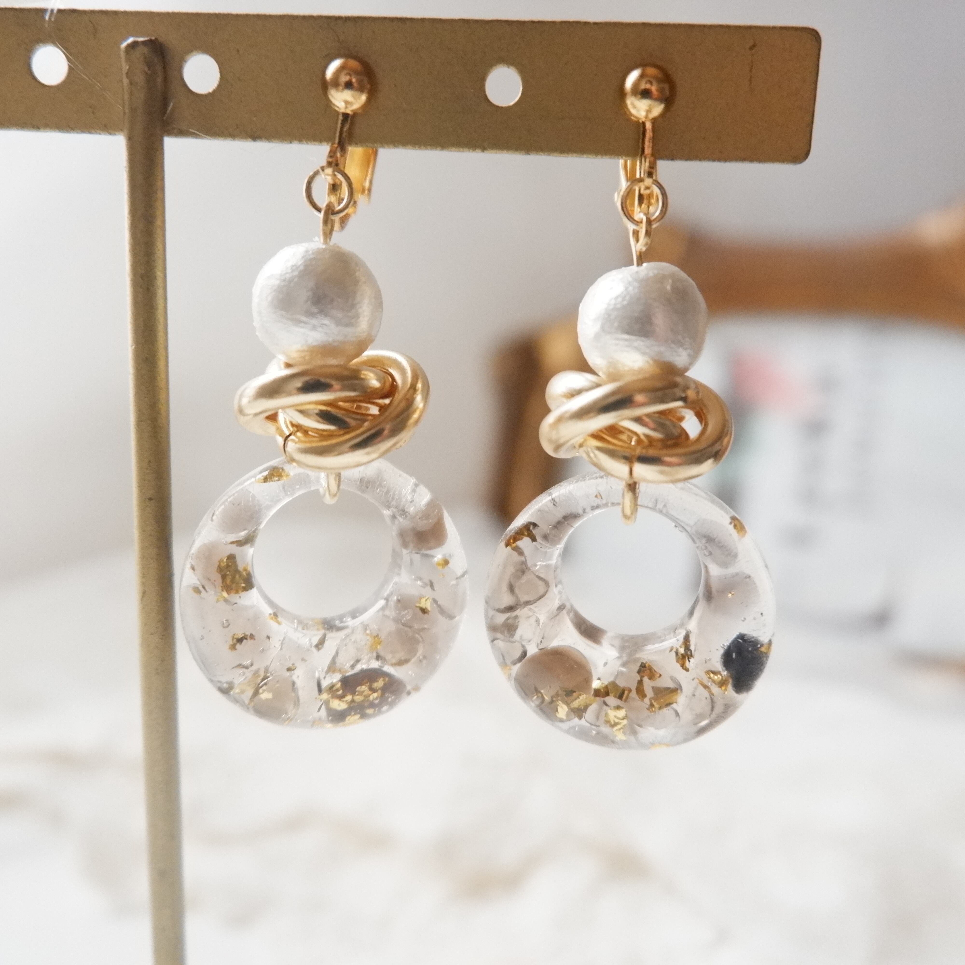 天然石×コットンパール 大ぶり 揺れるデザイン イヤリング/ピアス 金属アレルギー対応 サージカルステンレス