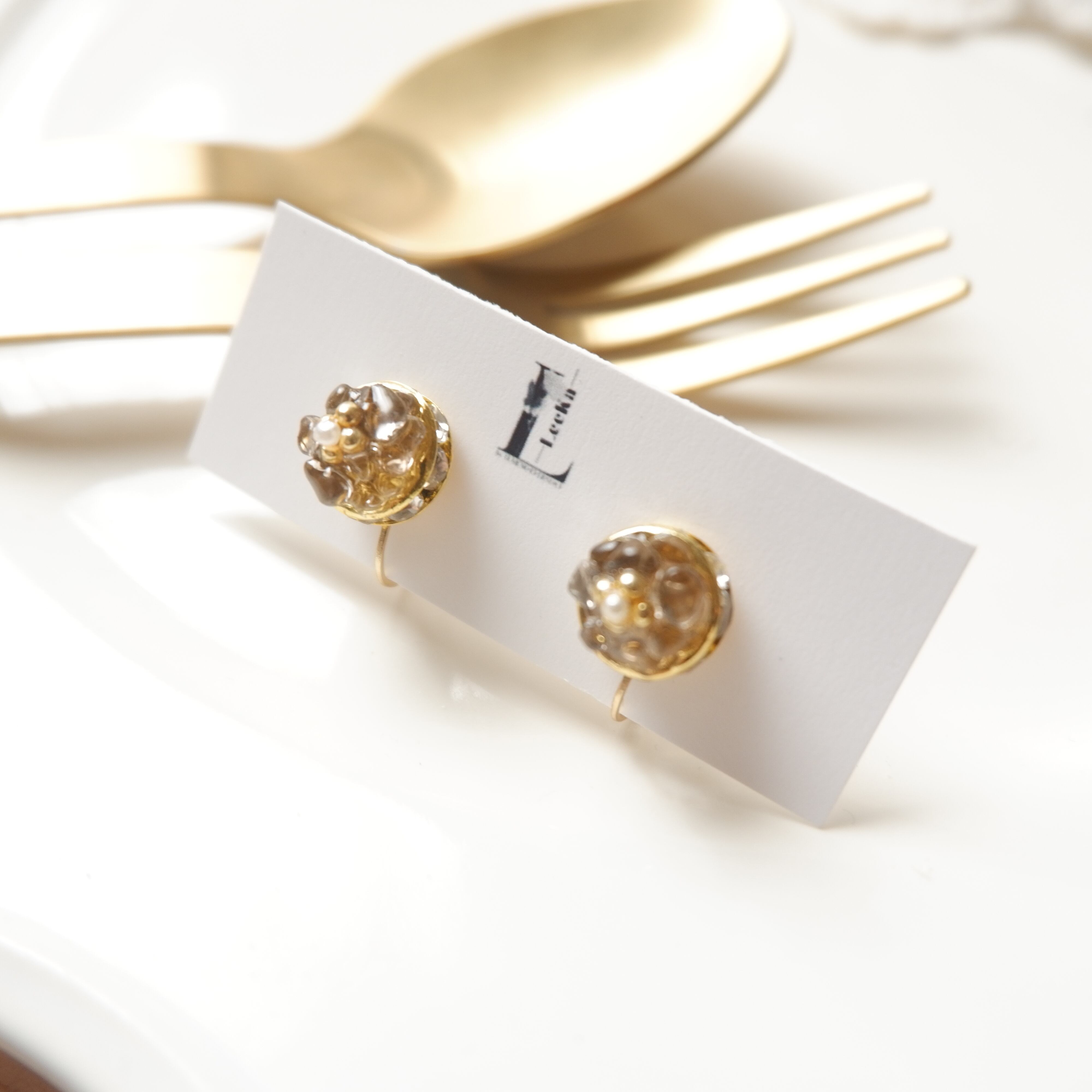 ベースのゴールドの丸いフレームにはクリスタルガラスが入っており、まるでラッピングされてお店のショーケースに並んでいる雰囲気です。