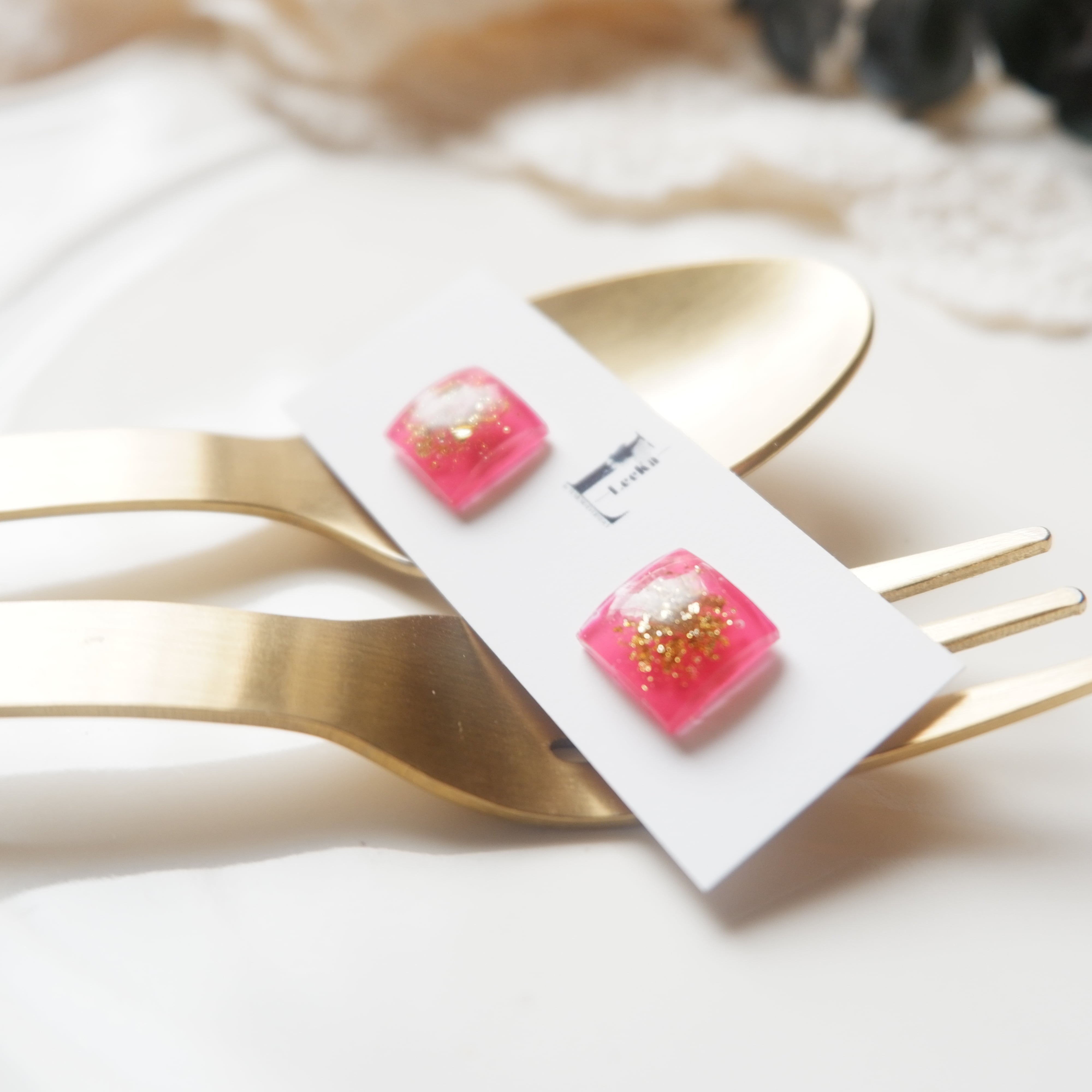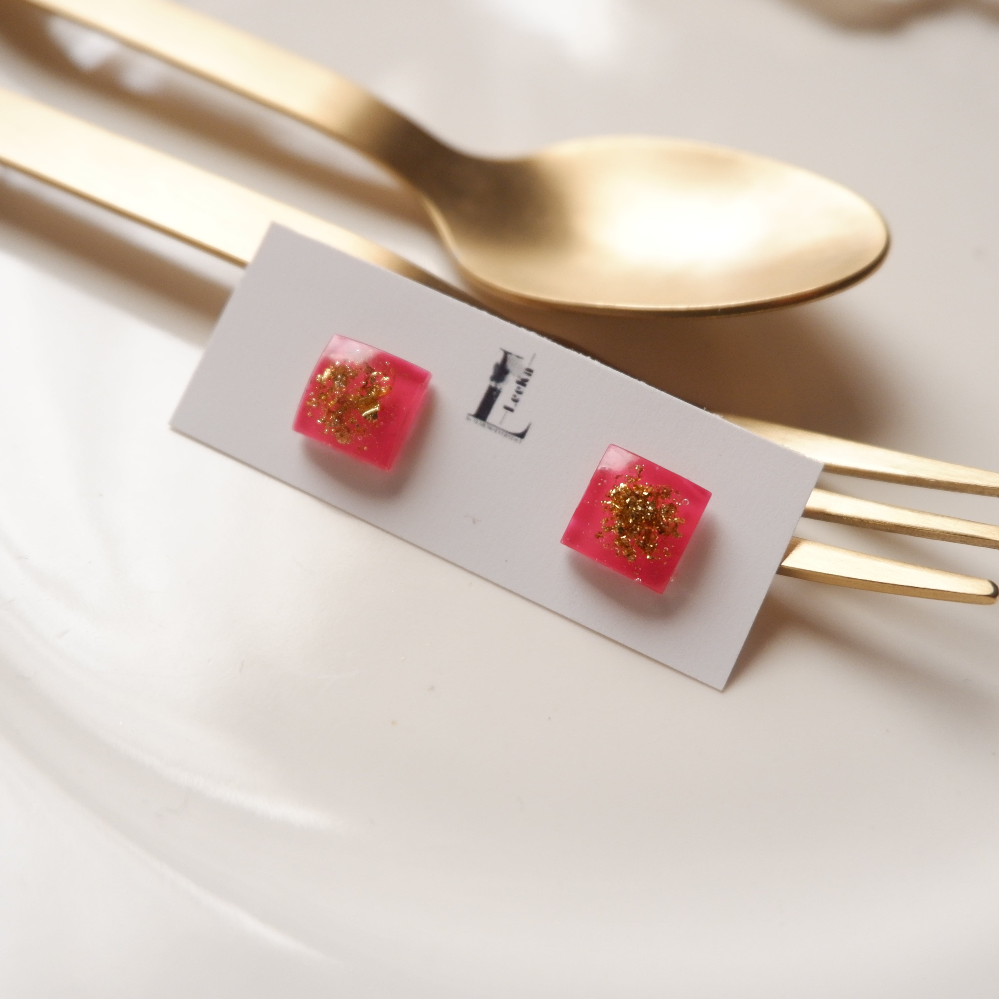バレンタイン ポップ 金箔 × ピンク 四角 ピアス/イヤリング