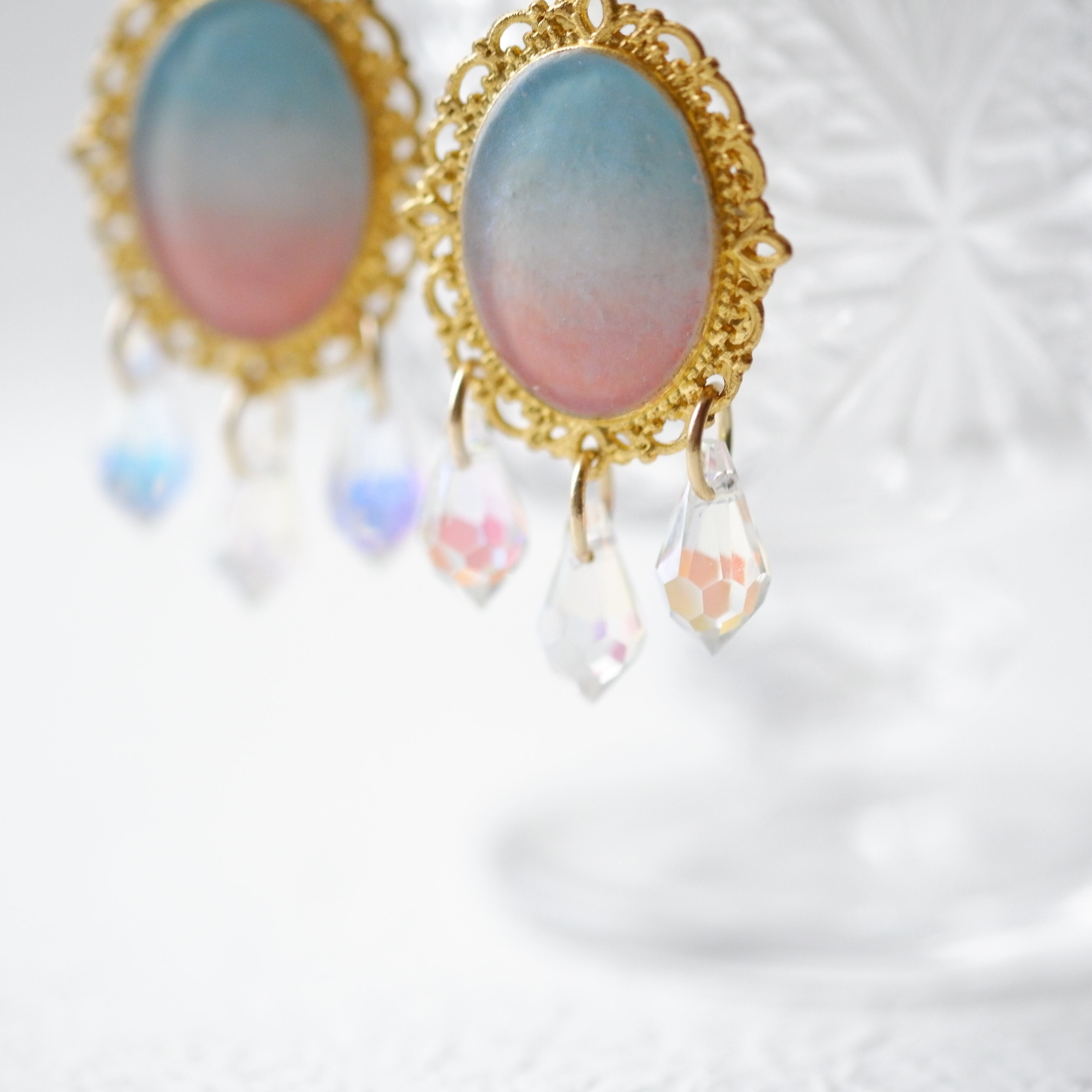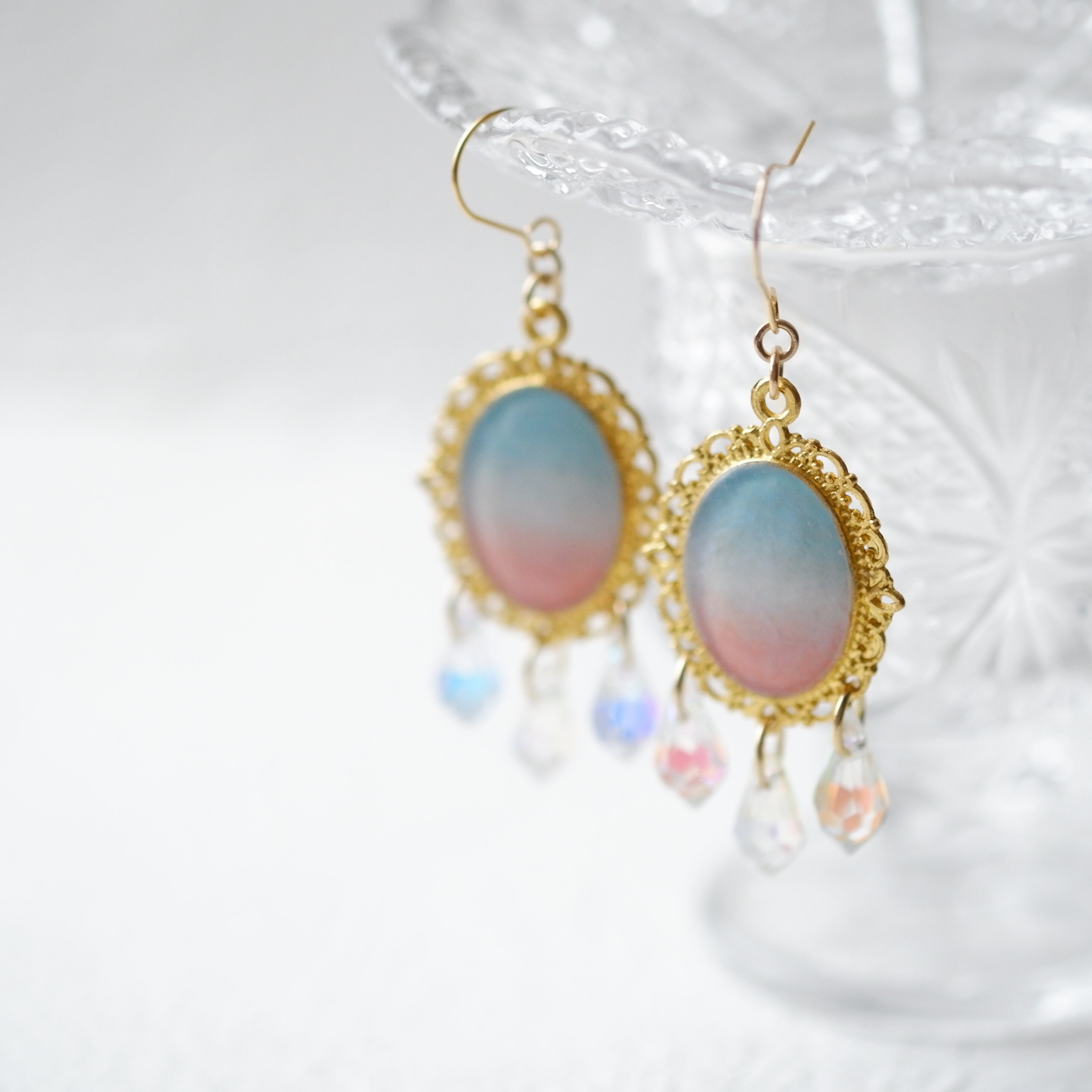 空のグラデーションのようなレジンアート+揺れるクリスタルガラス+アンティーク調フレームを合わせました。