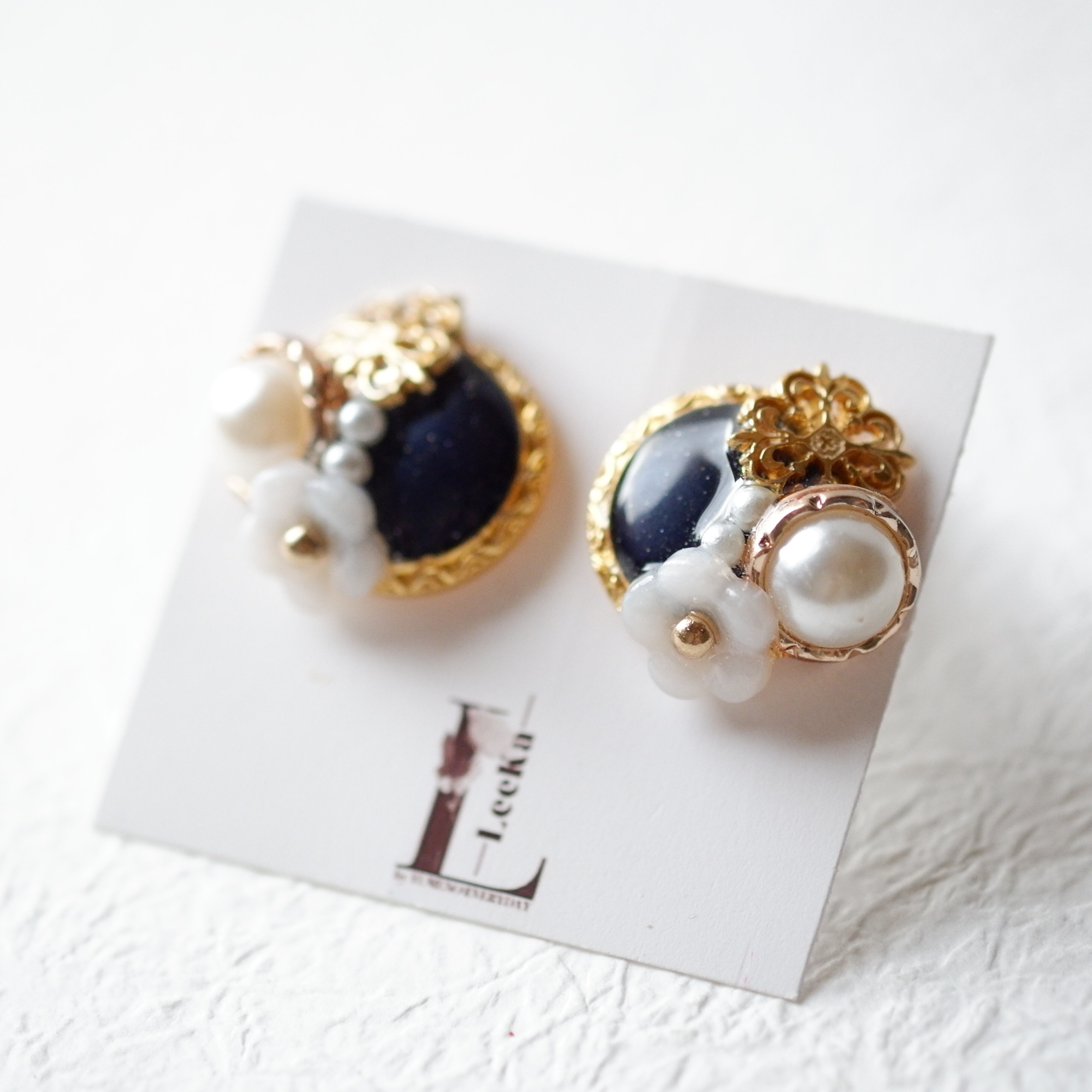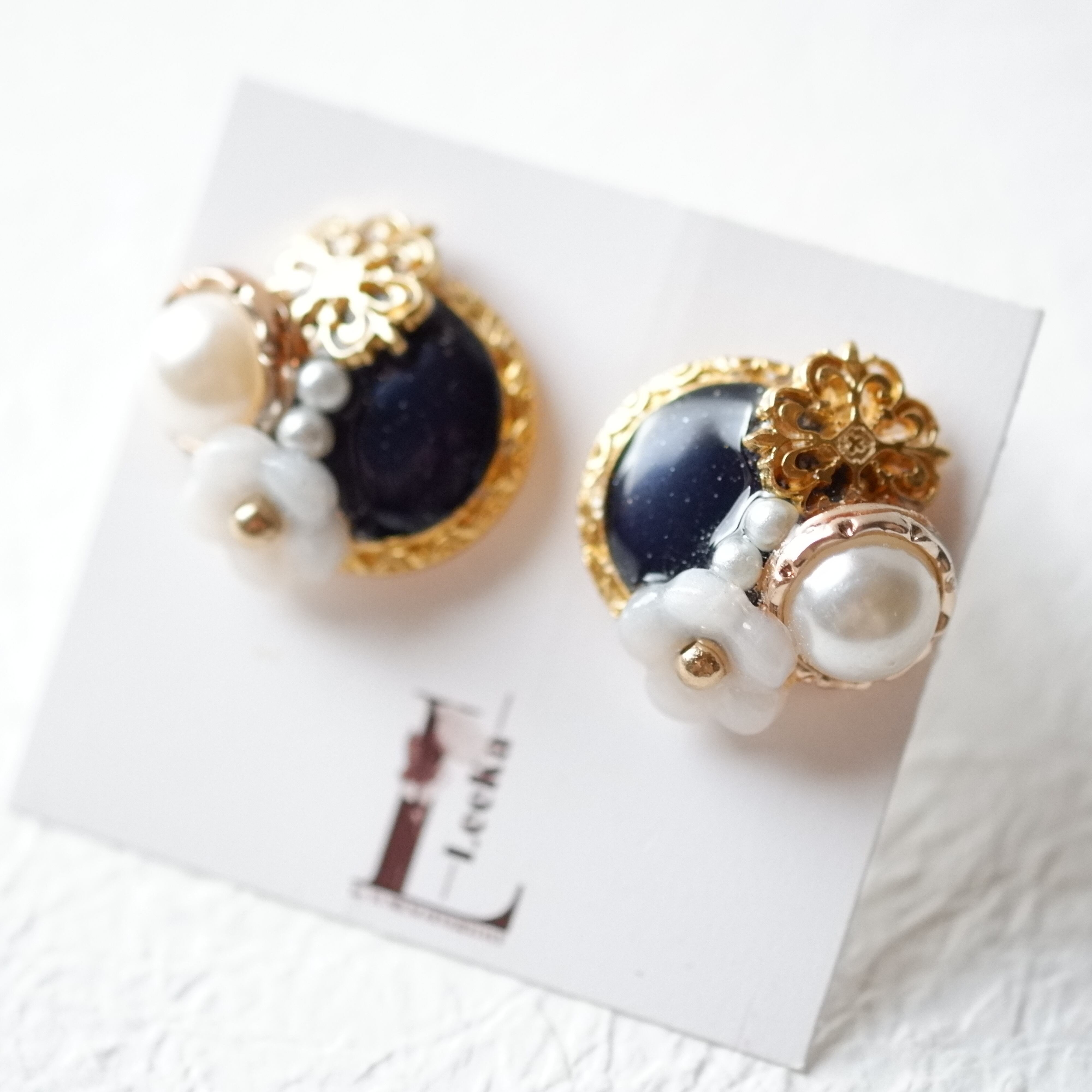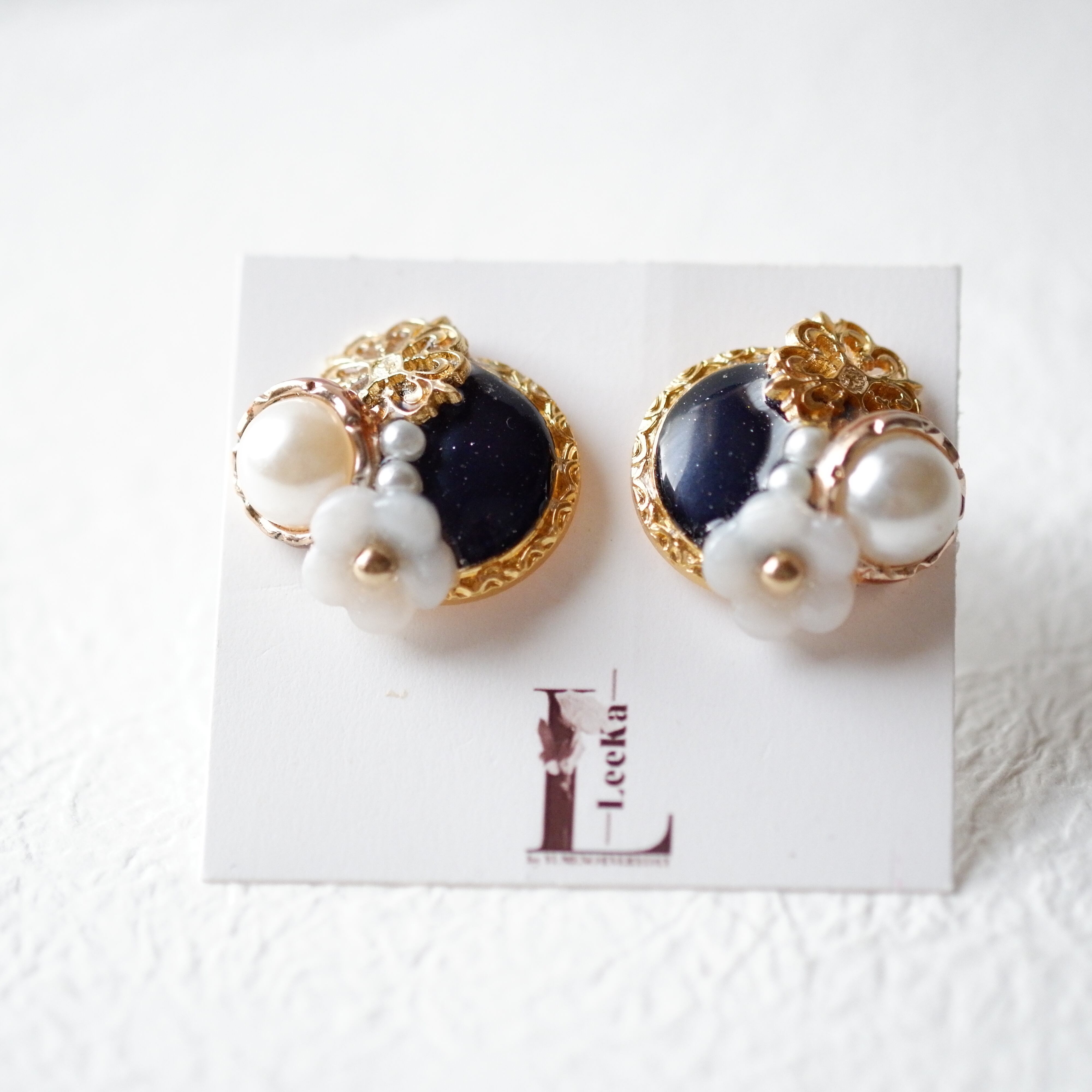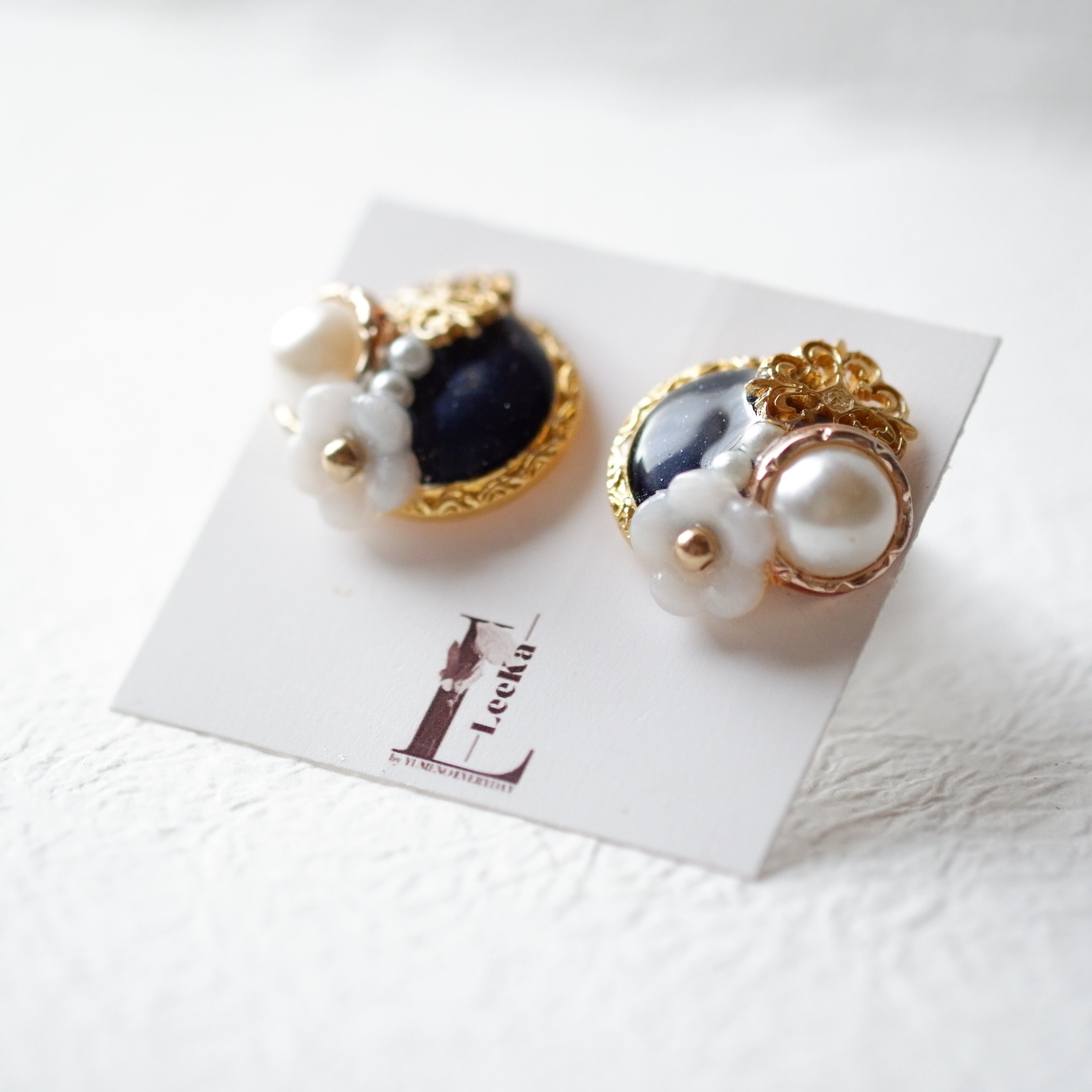 メインにブラックのビンテージボタンとパールボタン、透かしボタン、手作りの白色のお花で作りました。