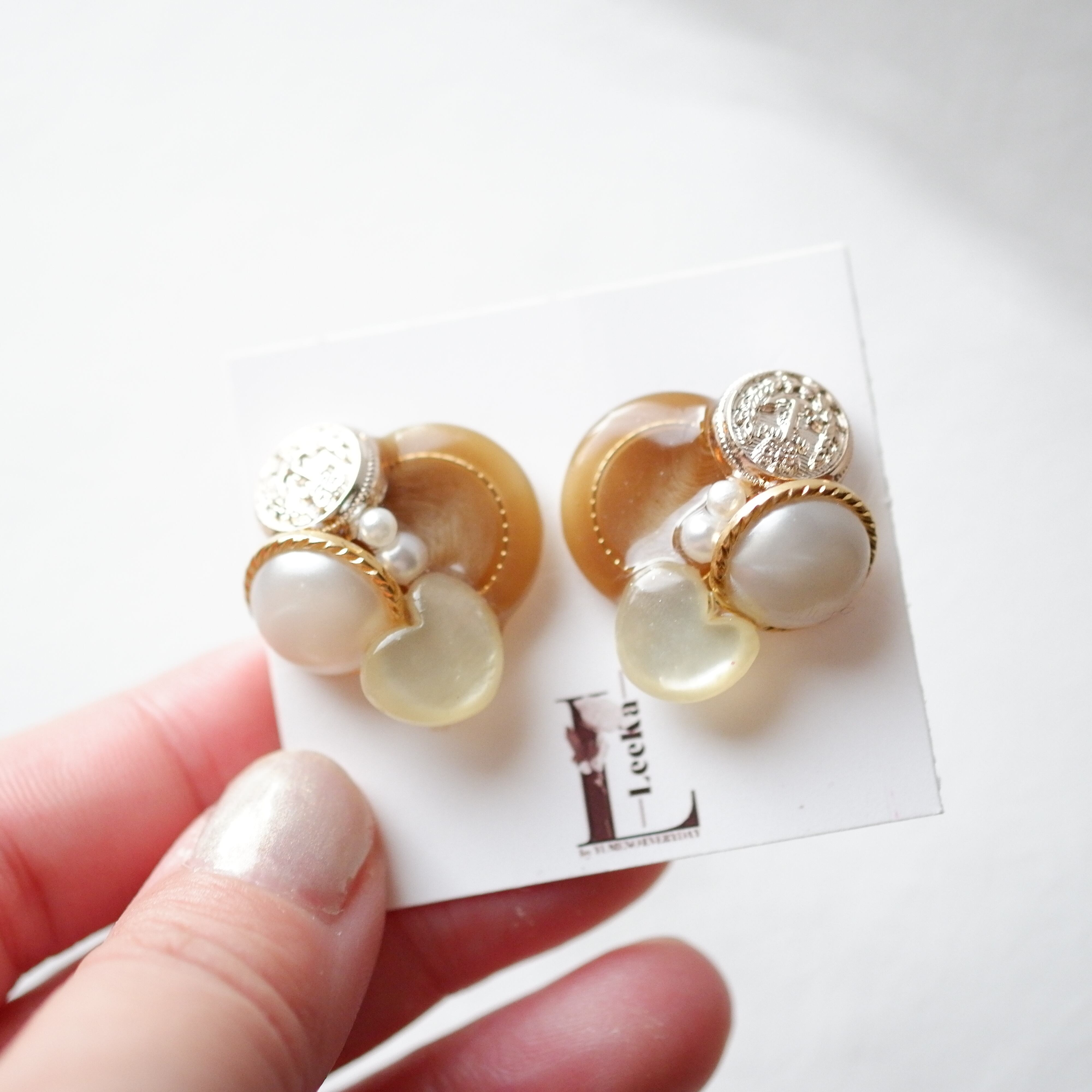 メインにカフェカラーのビンテージボタンとパールボタン、ゴールドボタン、クリーム色のハートボタンで作りました。