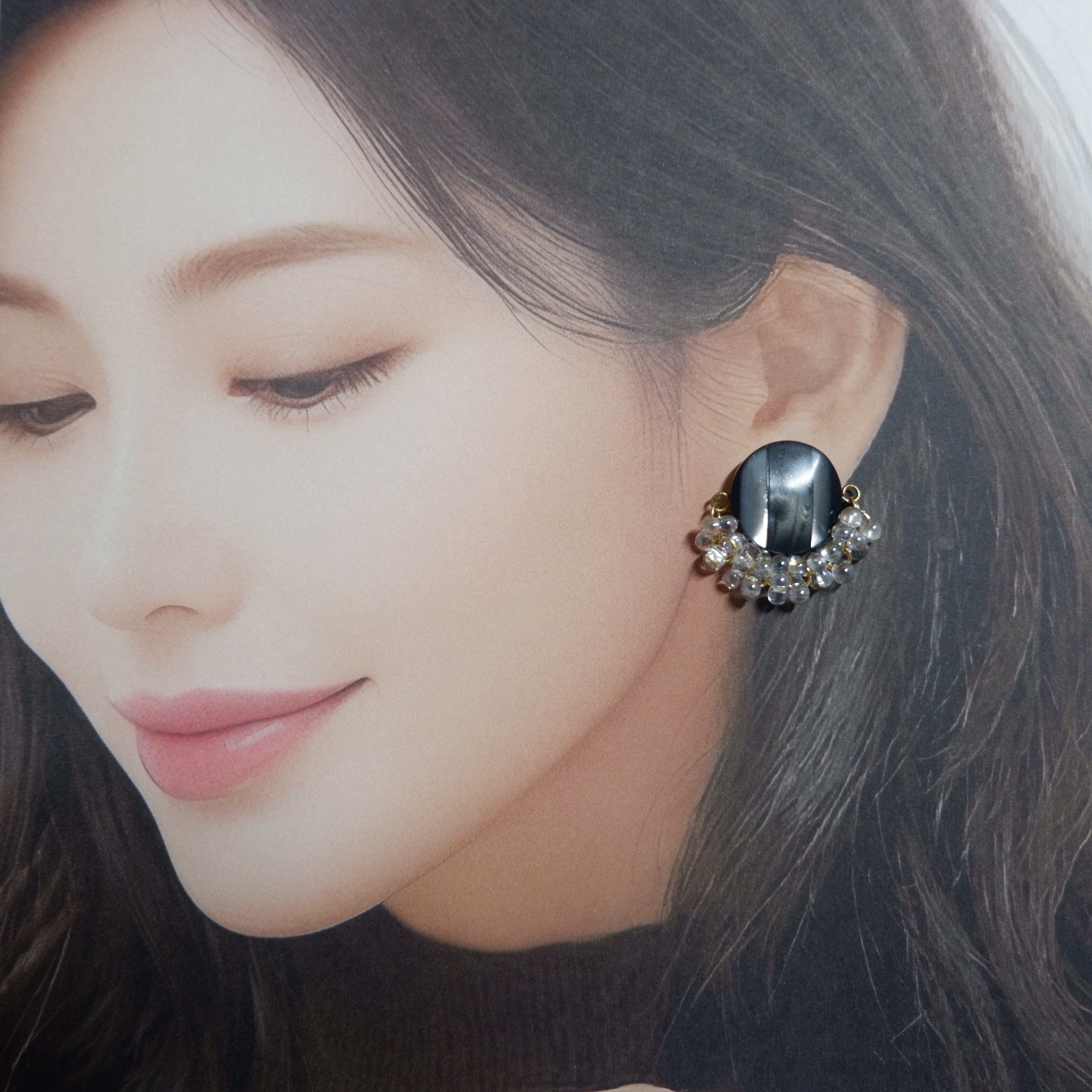 ボタンの下で揺れるクリアなビーズたちは、まるでドレスの裾が揺らめくように、お顔周りに透明感と華やぎを添えてくれます。