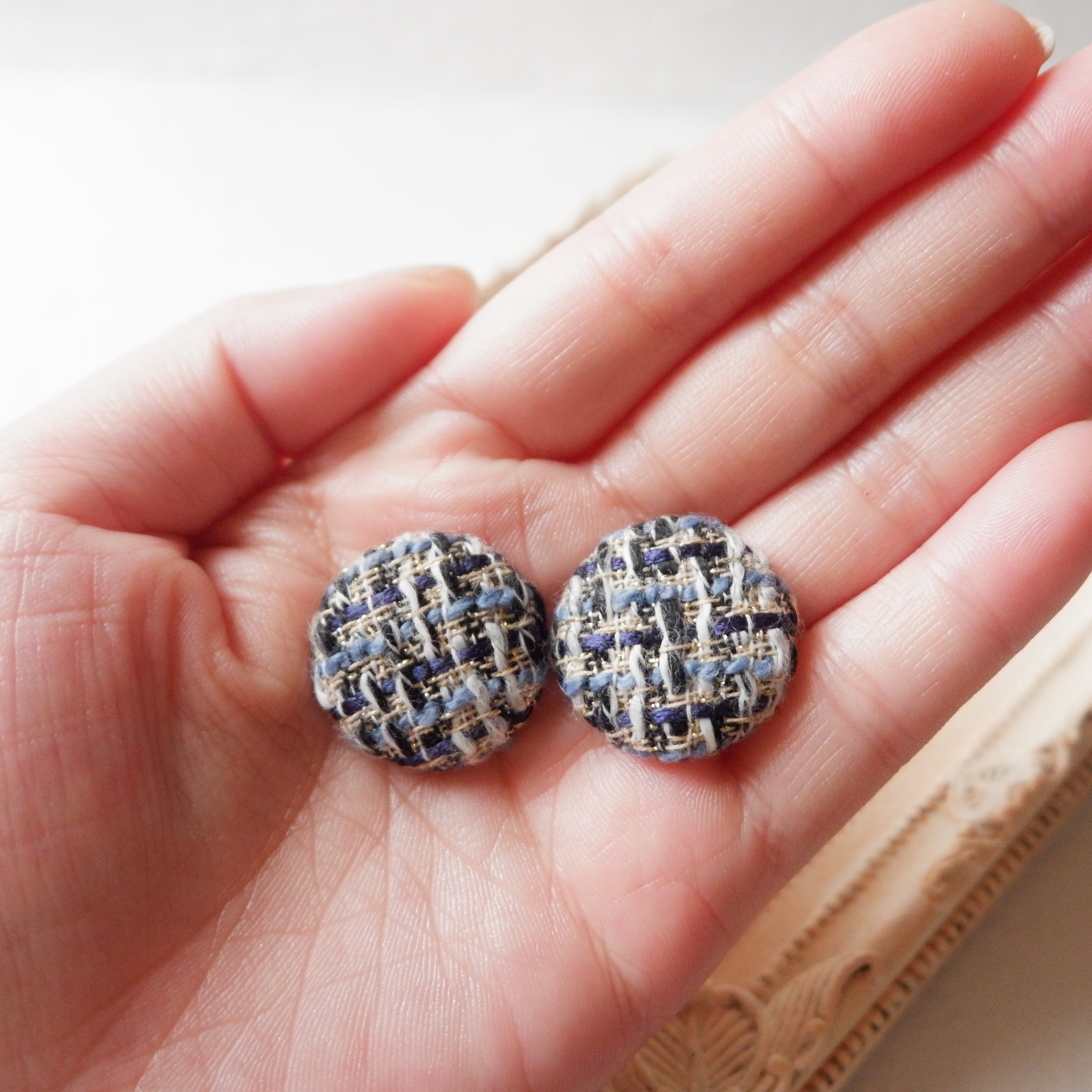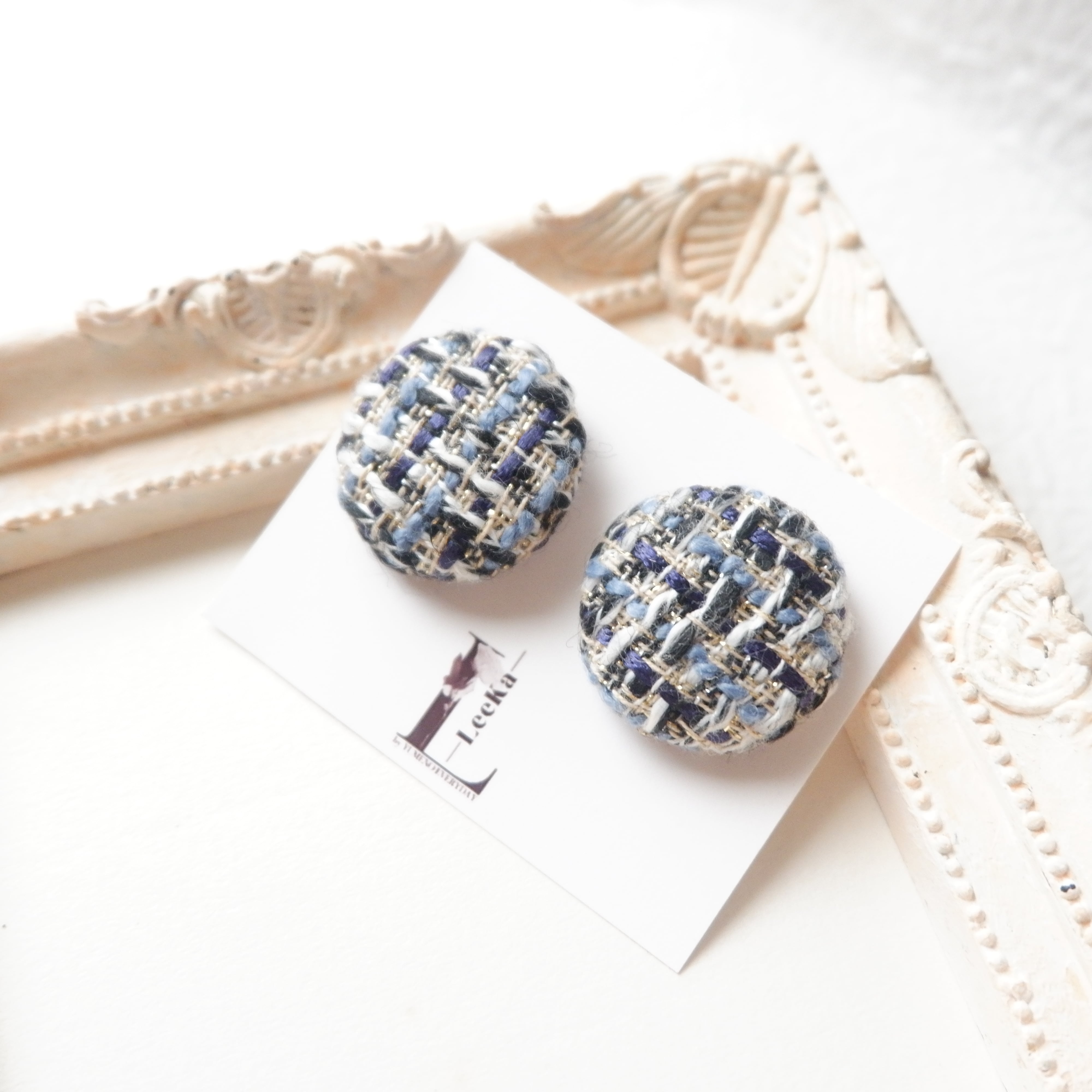 様々な糸が織りなす表情豊かなブルー系ツイードを使用したボタンピアスです。