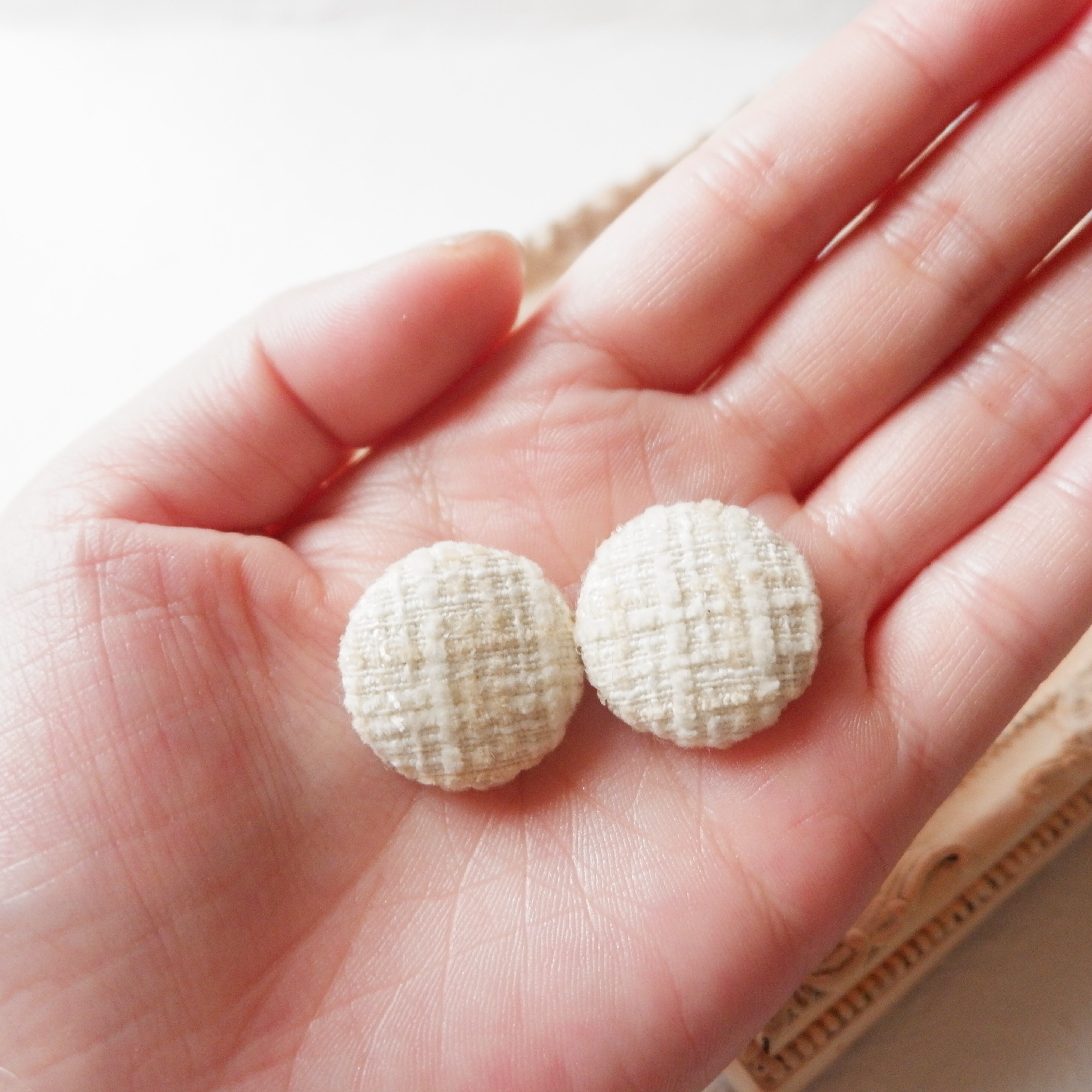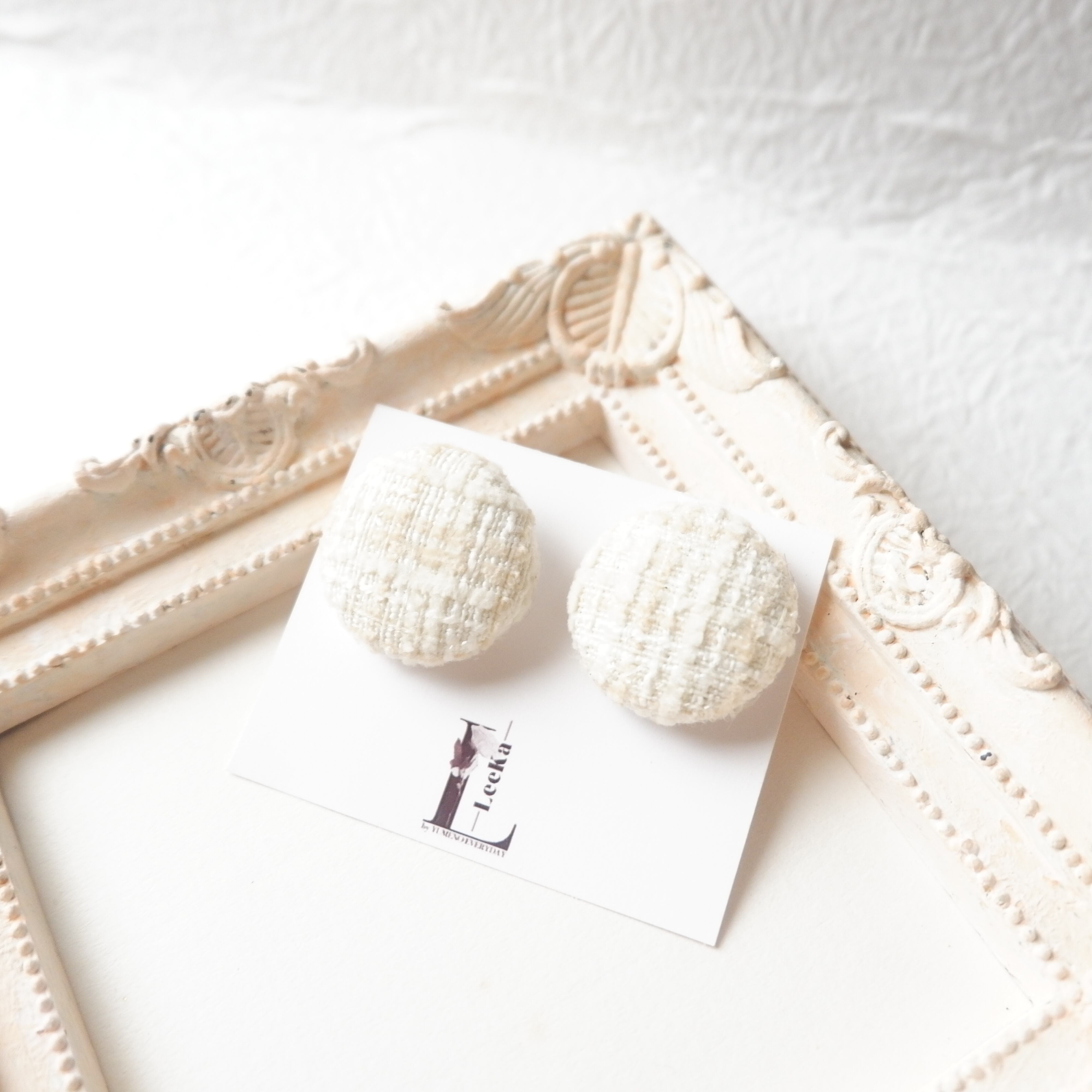 柔らかな質感が魅力のホワイトツイードを贅沢に使用したボタンピアスです。