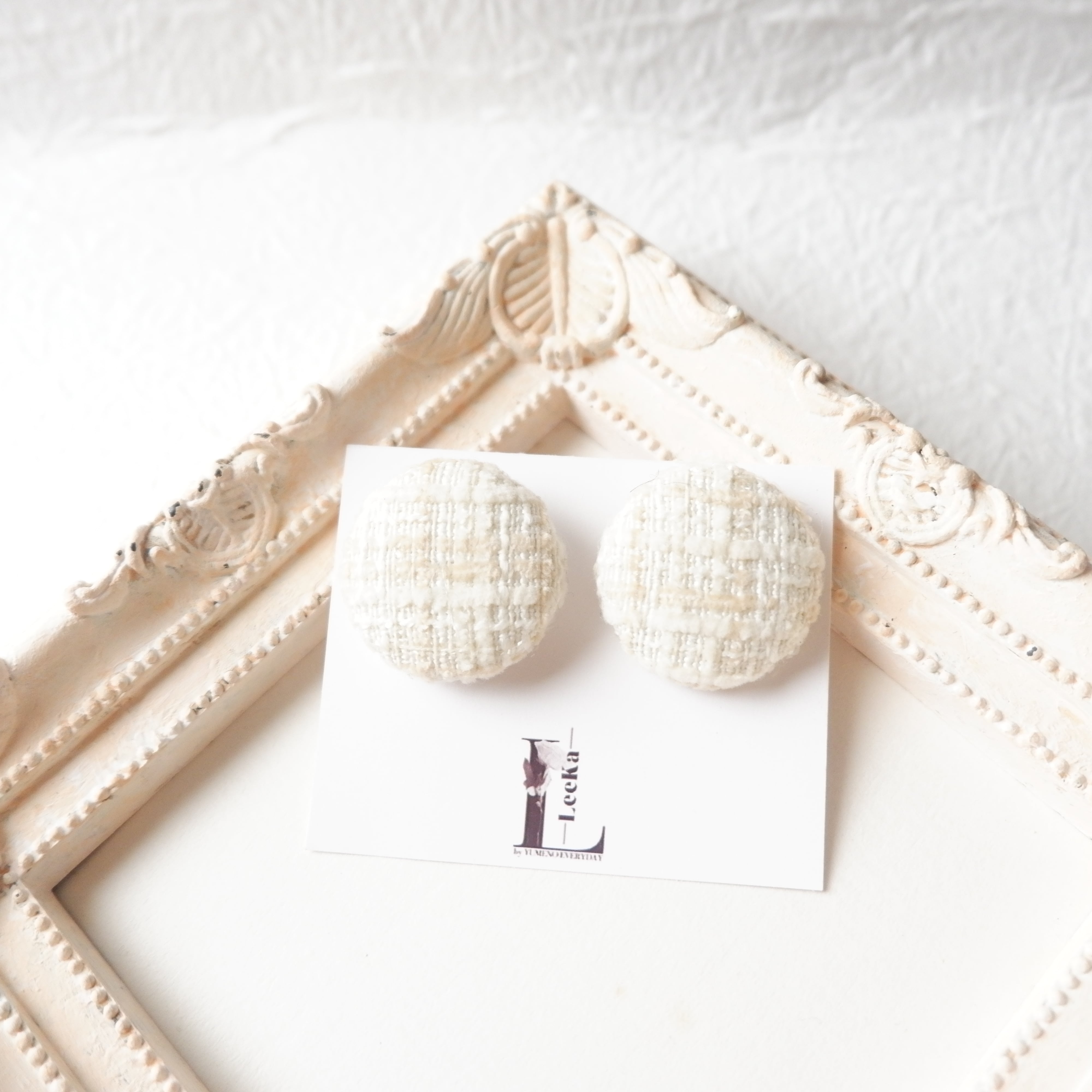#ハンドメイドアクセサリー #ツイードピアス #ツイードイヤリング #ホワイトコーデ #キレイめカジュアル #入学式ママコーデ #卒業式コーデ #フォーマルアクセサリー #大人可愛い #大ぶりピアス #ボタンピアス #オールシーズン #LeeKaJewelry