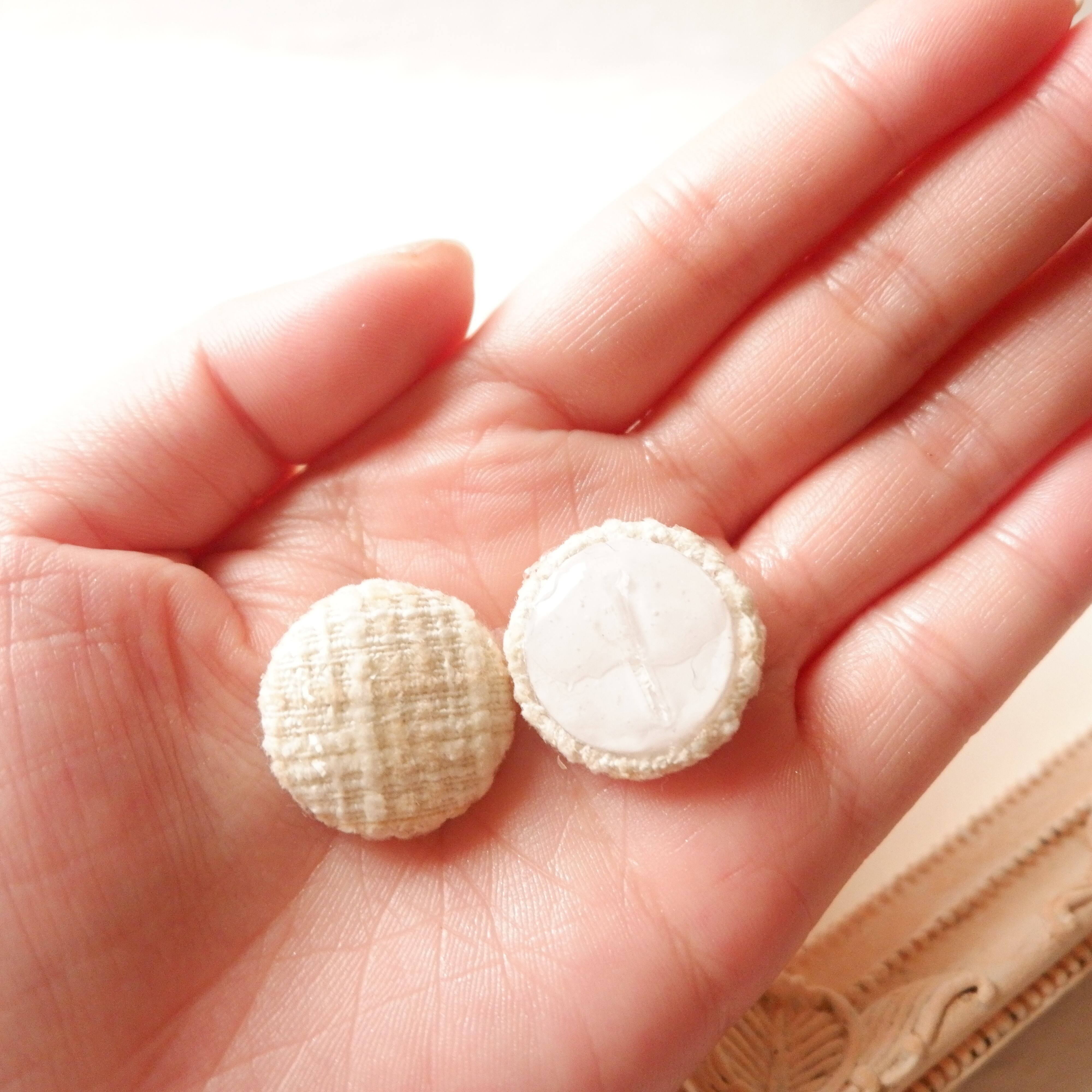 オールシーズン使える ホワイトツイードのボタン ピアス/イヤリング 金属アレルギー対応 サージカルステンレス 一粒ピアス シンプル