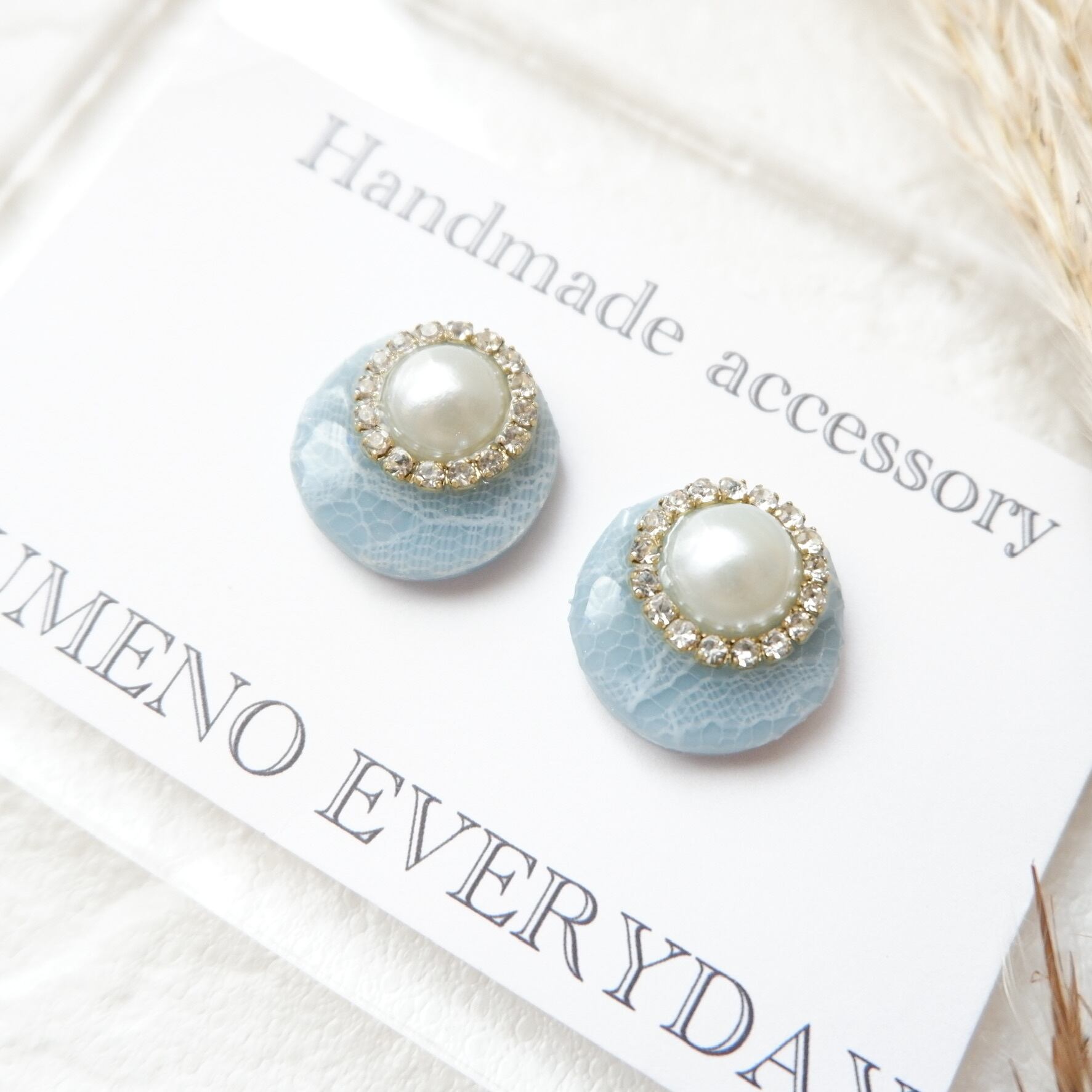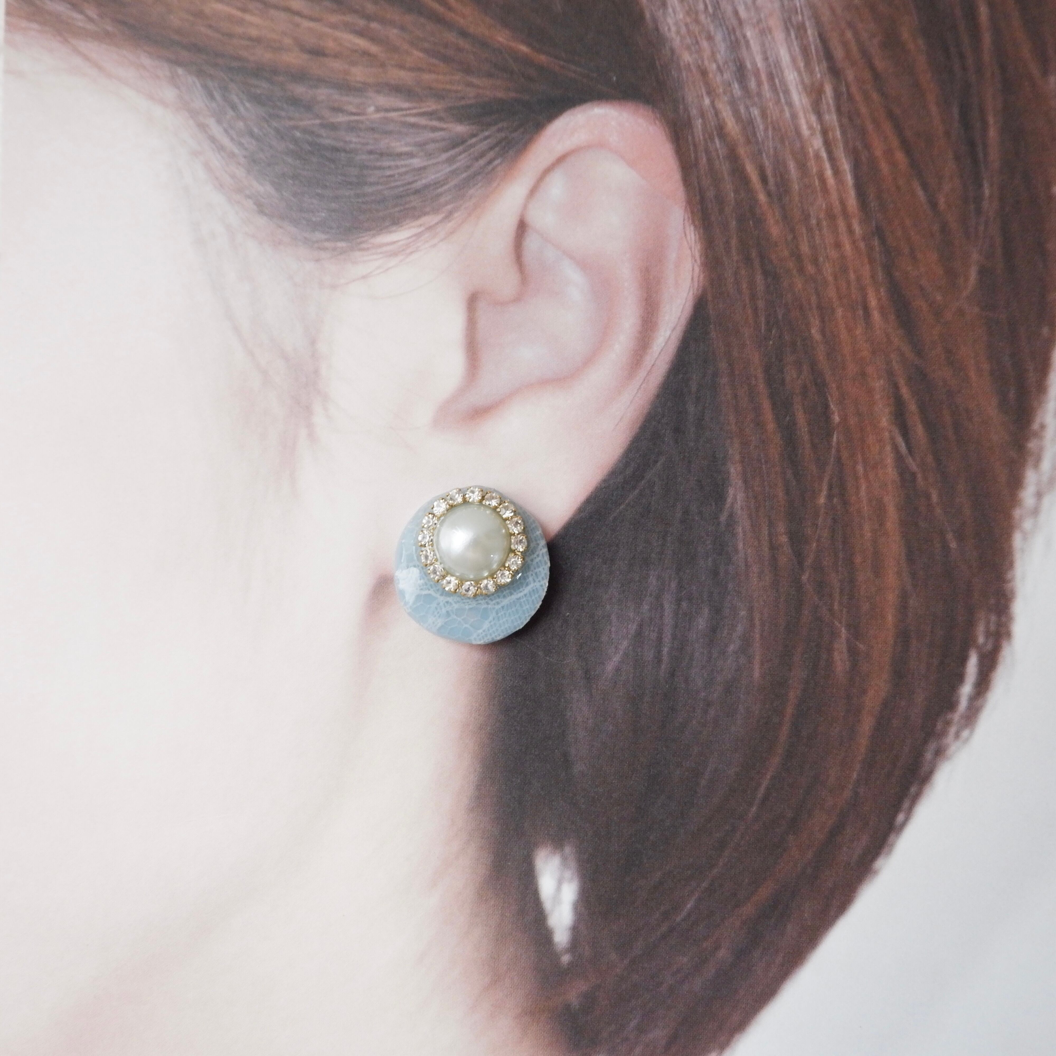大人Ladyのレース✖️パール✖️クリスタルイヤリング/ピアス(くすみブルー)