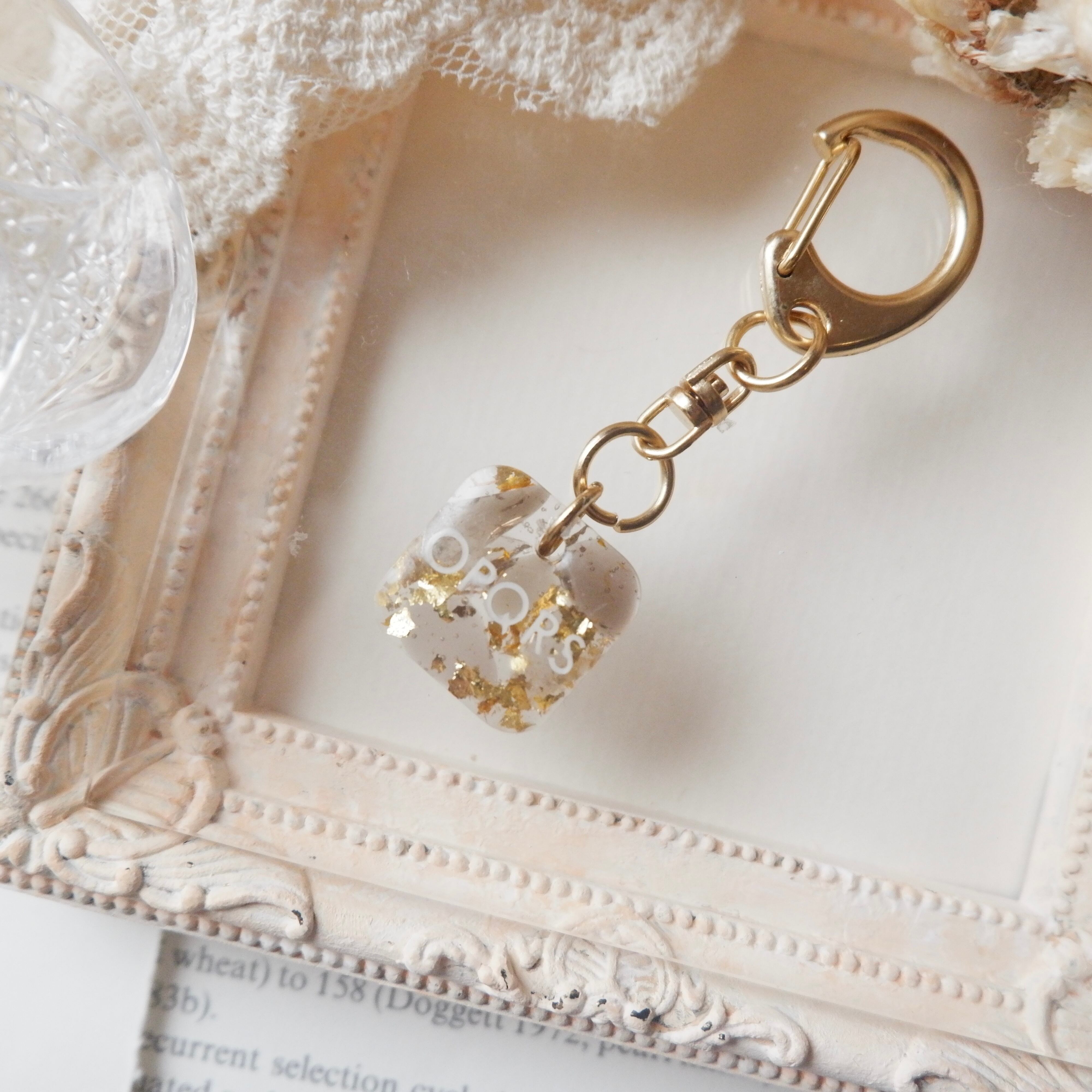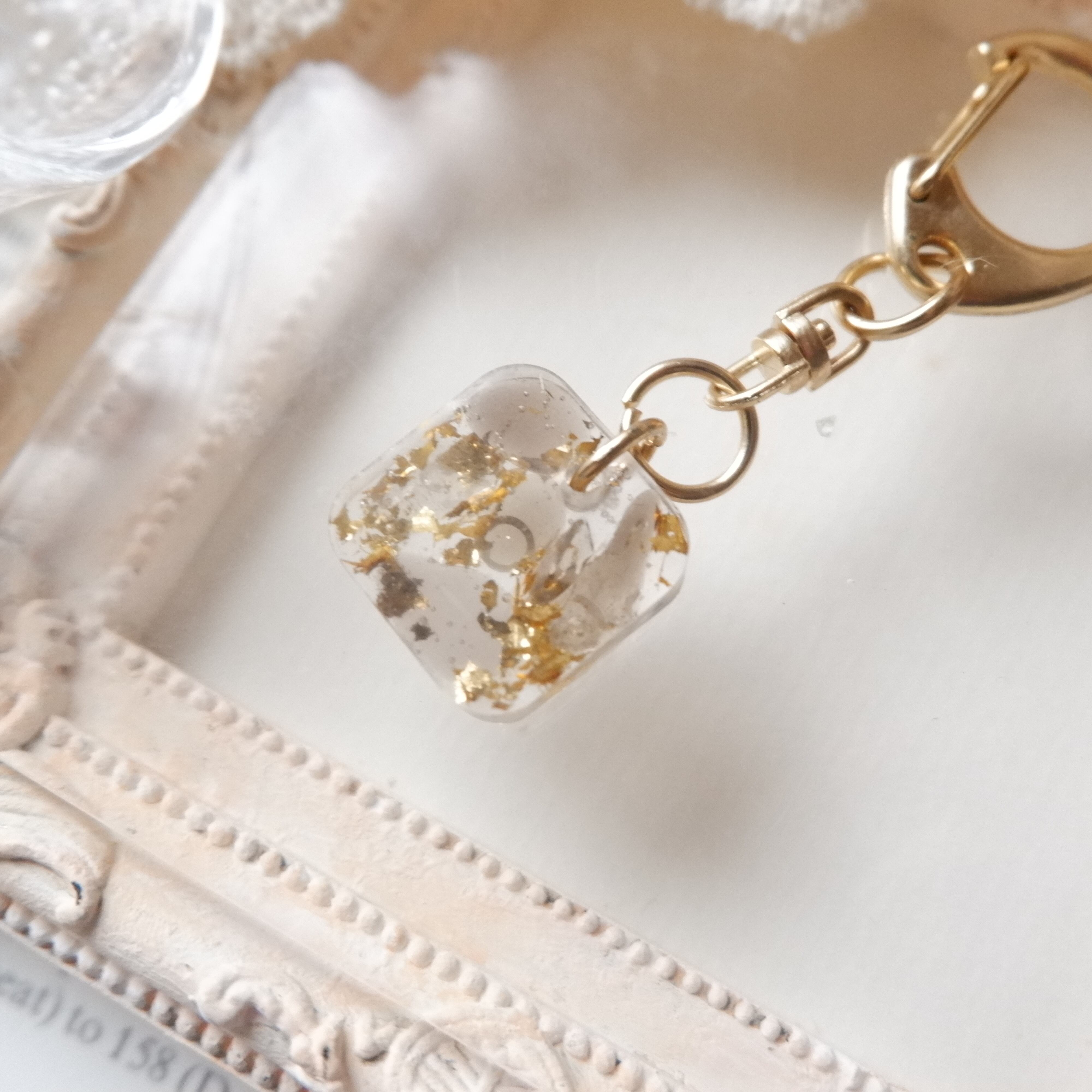四角に天然石のスモーキークォーツのさざれと金箔をたっぷり閉じ込めたキーホルダーです。