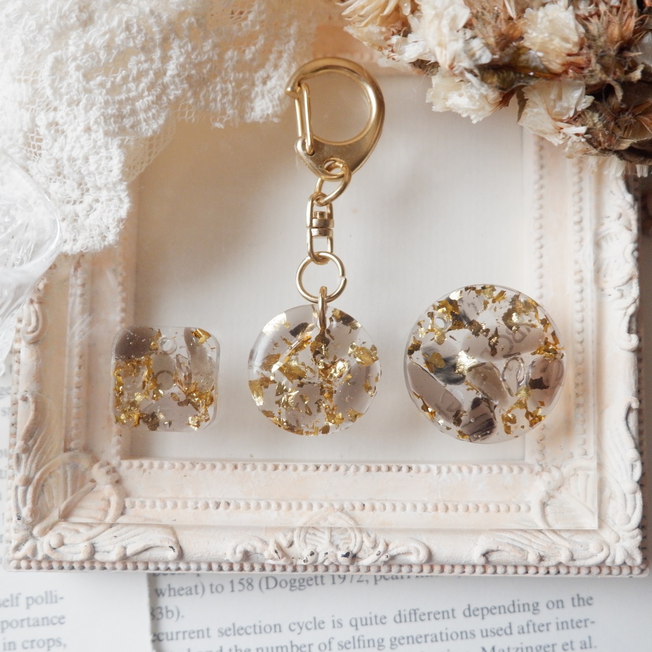 素材:レジン、天然石(スモーキークォーツ)、金箔、金属