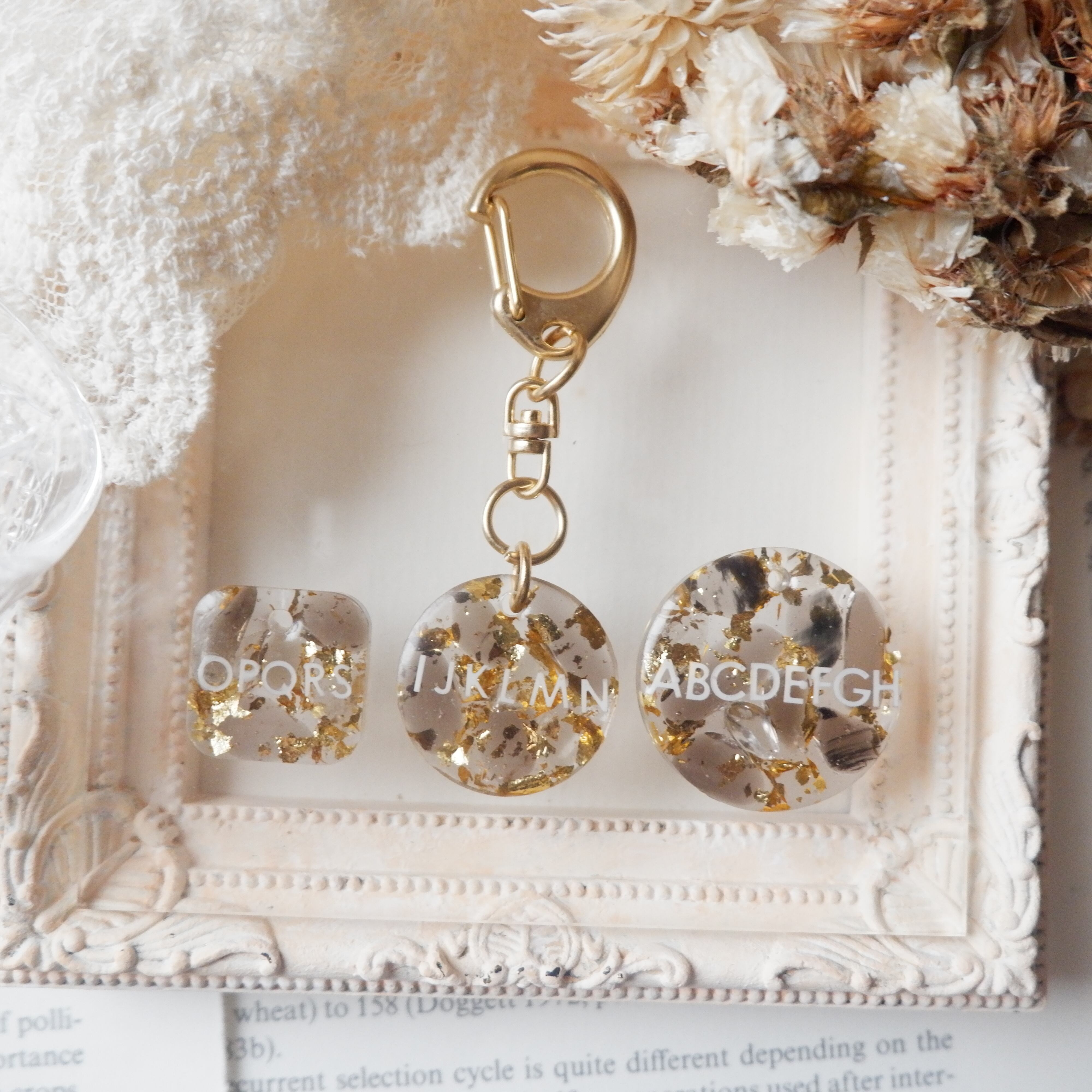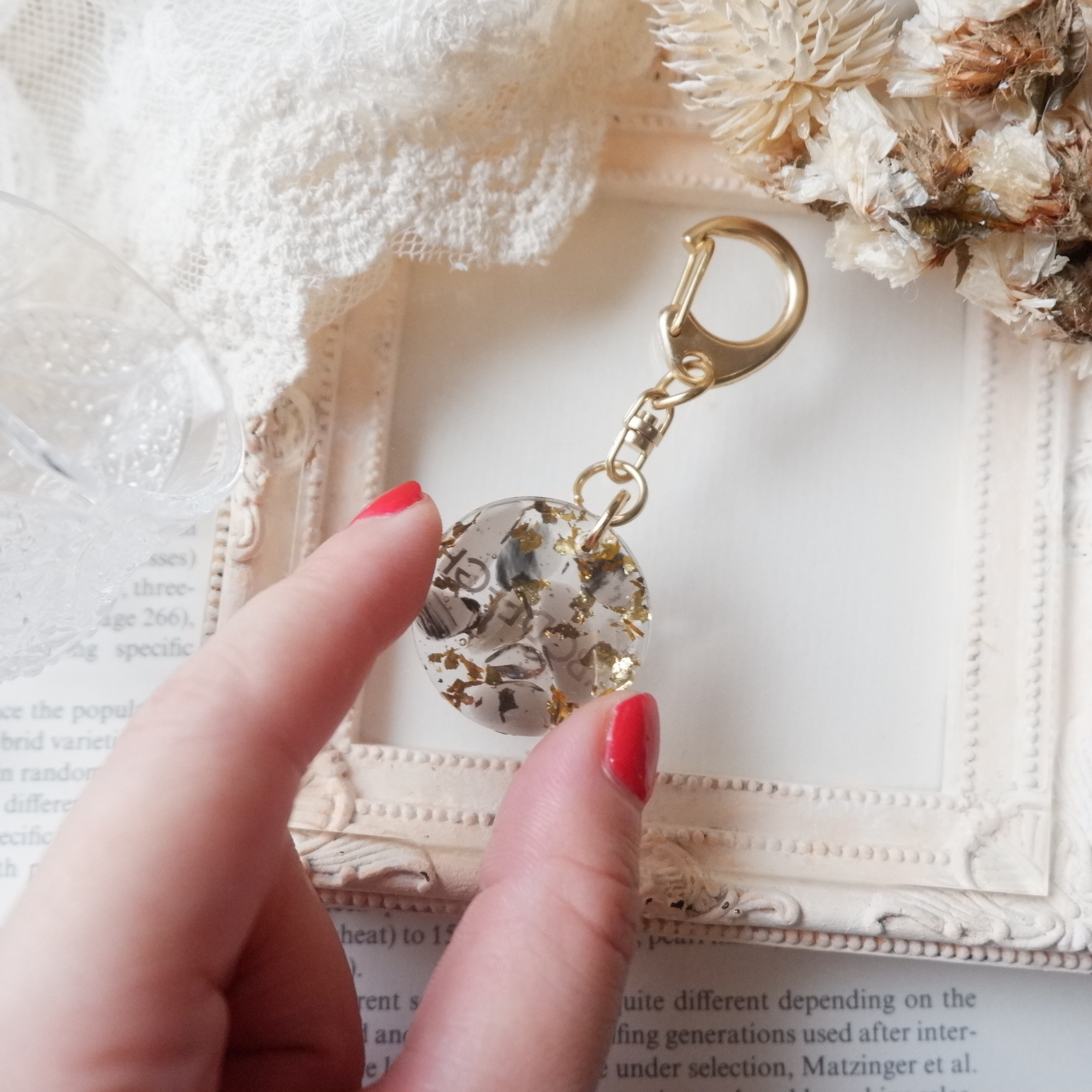 丸い形に天然石のスモーキークォーツのさざれと金箔をたっぷり閉じ込めたキーホルダーです。