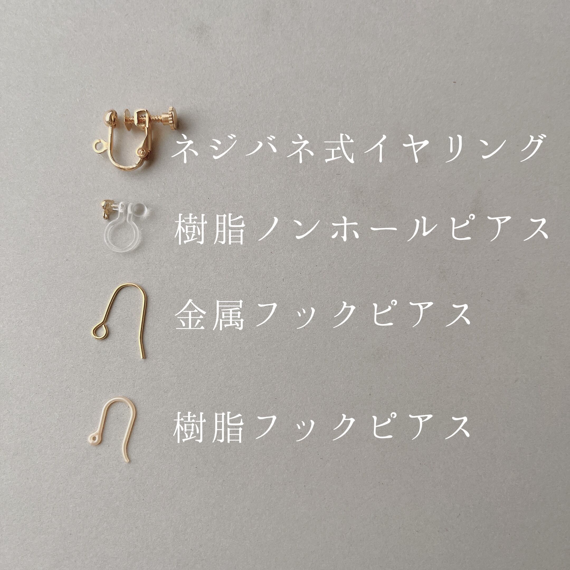 ネジバネ式イヤリング、樹脂ノンホールピアス、金属フックピアス、樹脂フックピアスの中からパーツを選択欄からお選び下さい。
