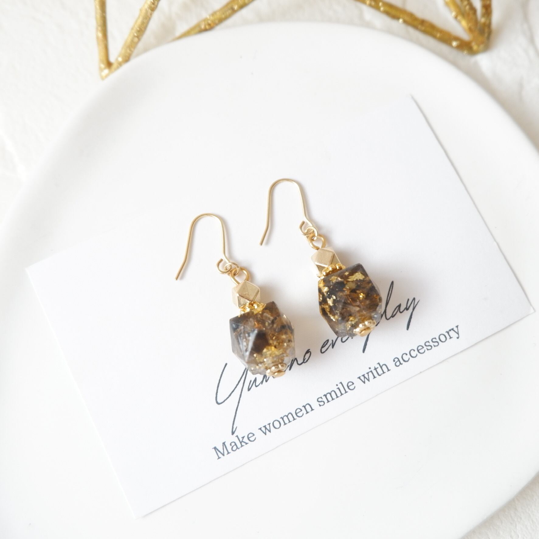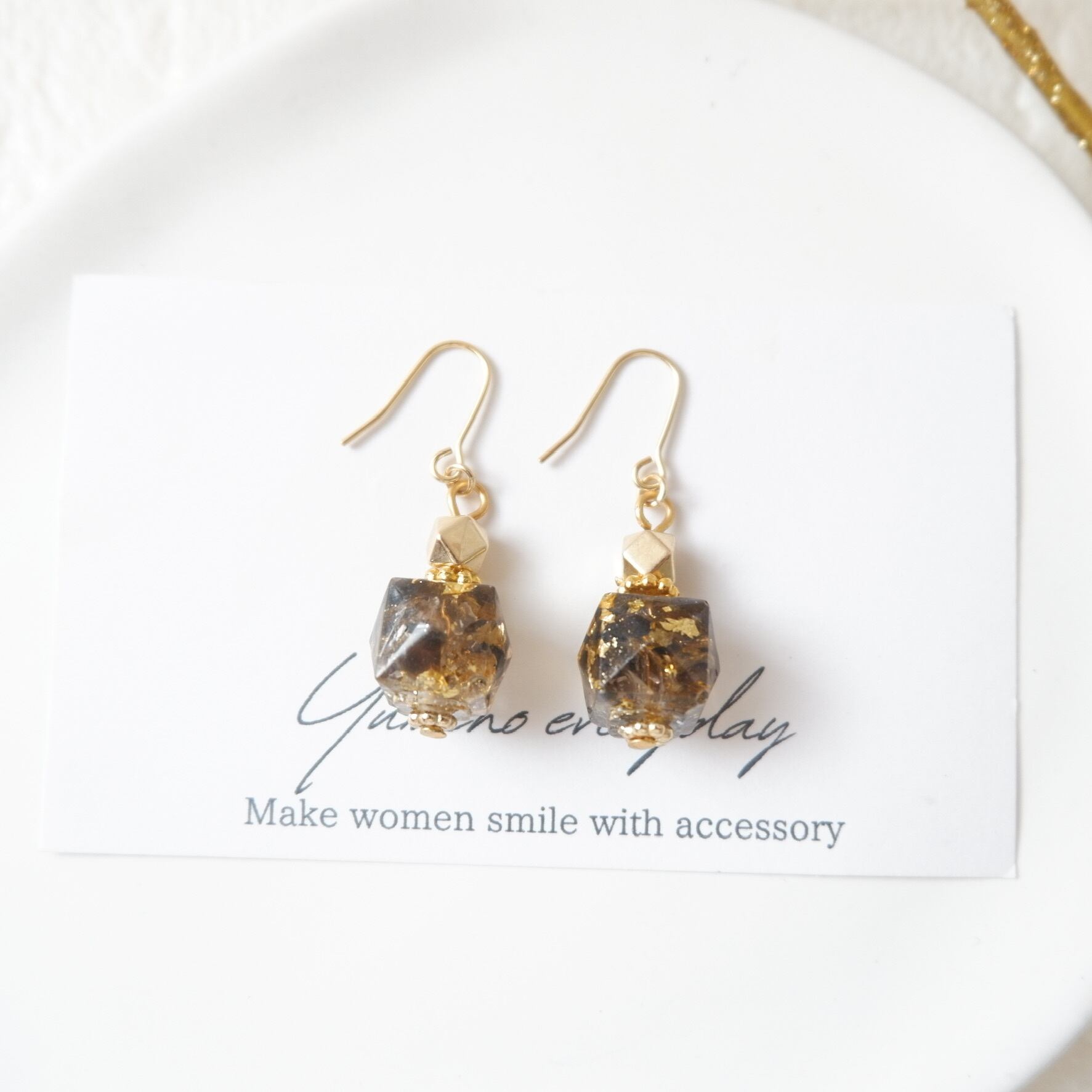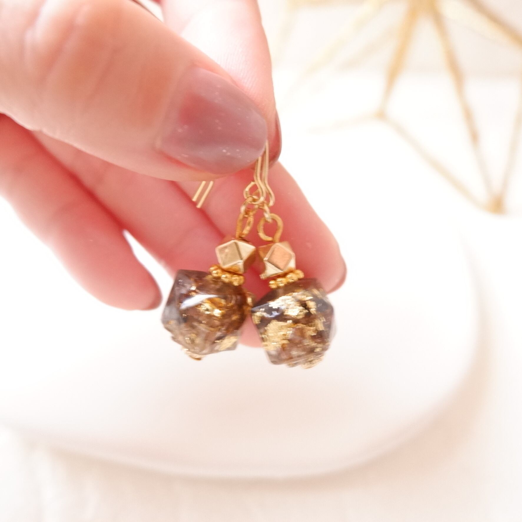 スモーキークォーツ、金箔をレジンで少しカットのあるキューブに閉じ込めました。