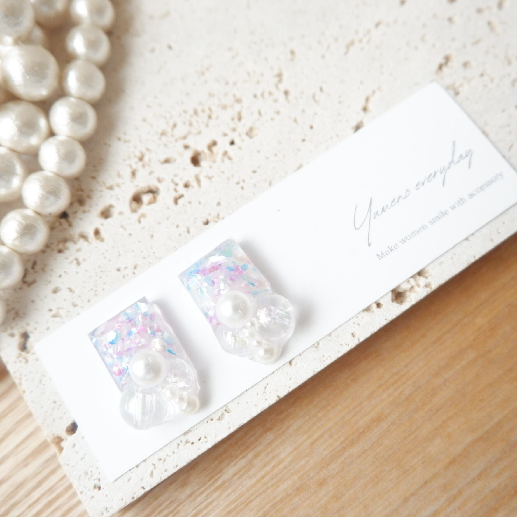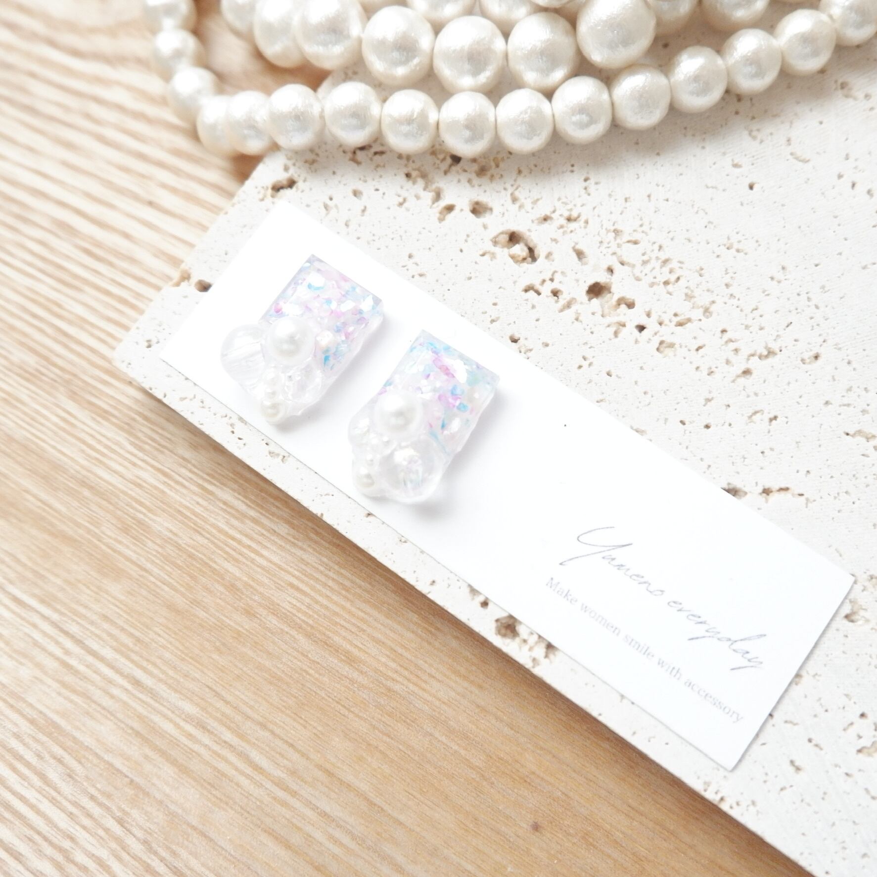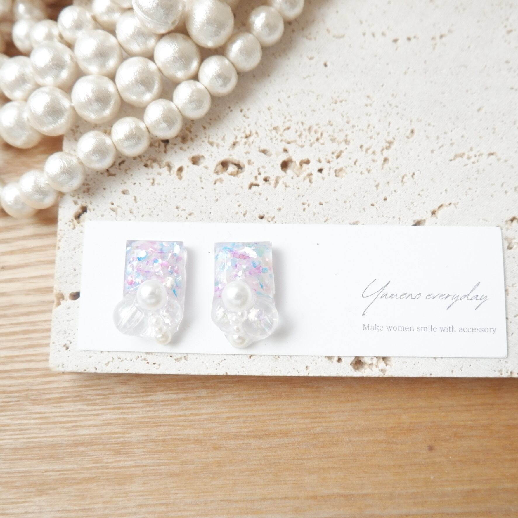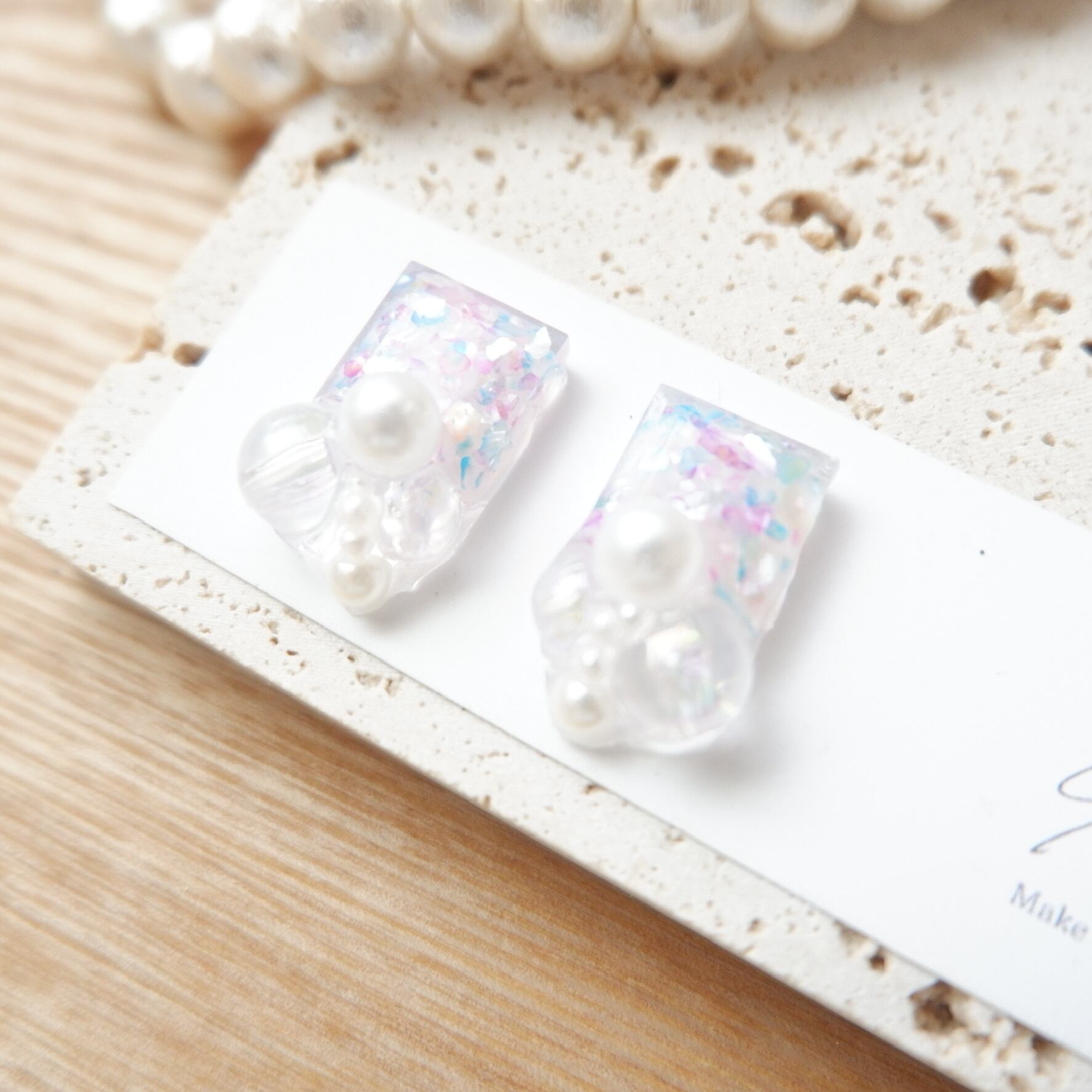 マーメイドをイメージしてミックスしたシェルの宝石に泡みたいなオーロラとパールを合わせた海の宝石です。