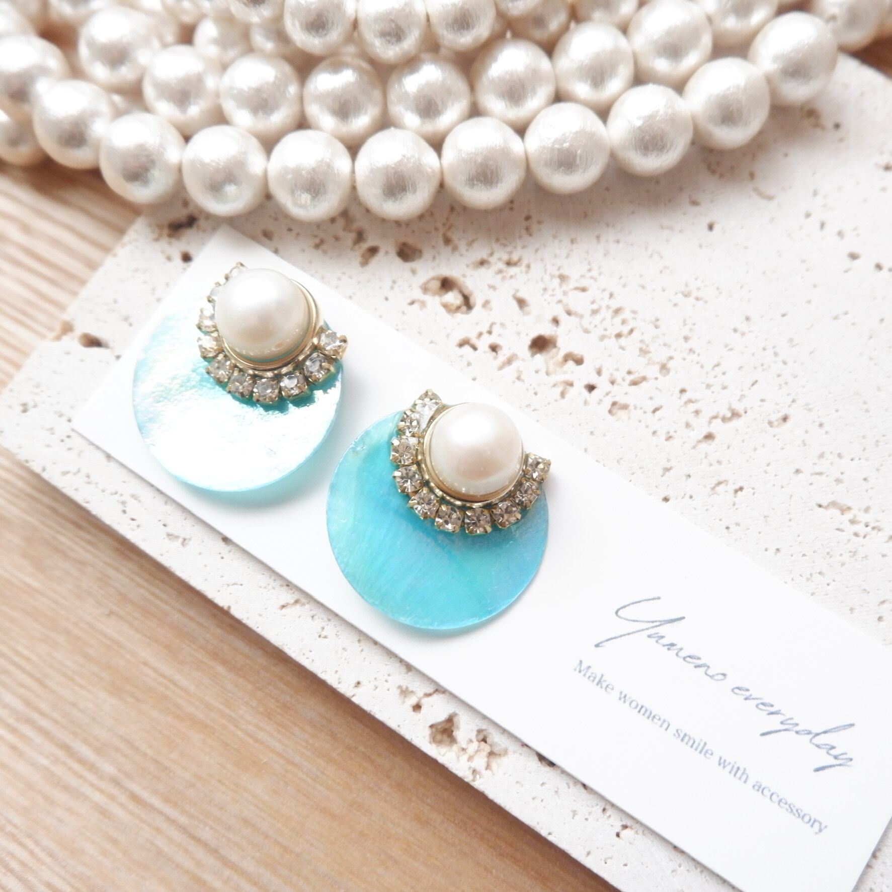虹色にきらめくライトブルーのシェルに淡水パールとクリスタルガラスを合わせました。