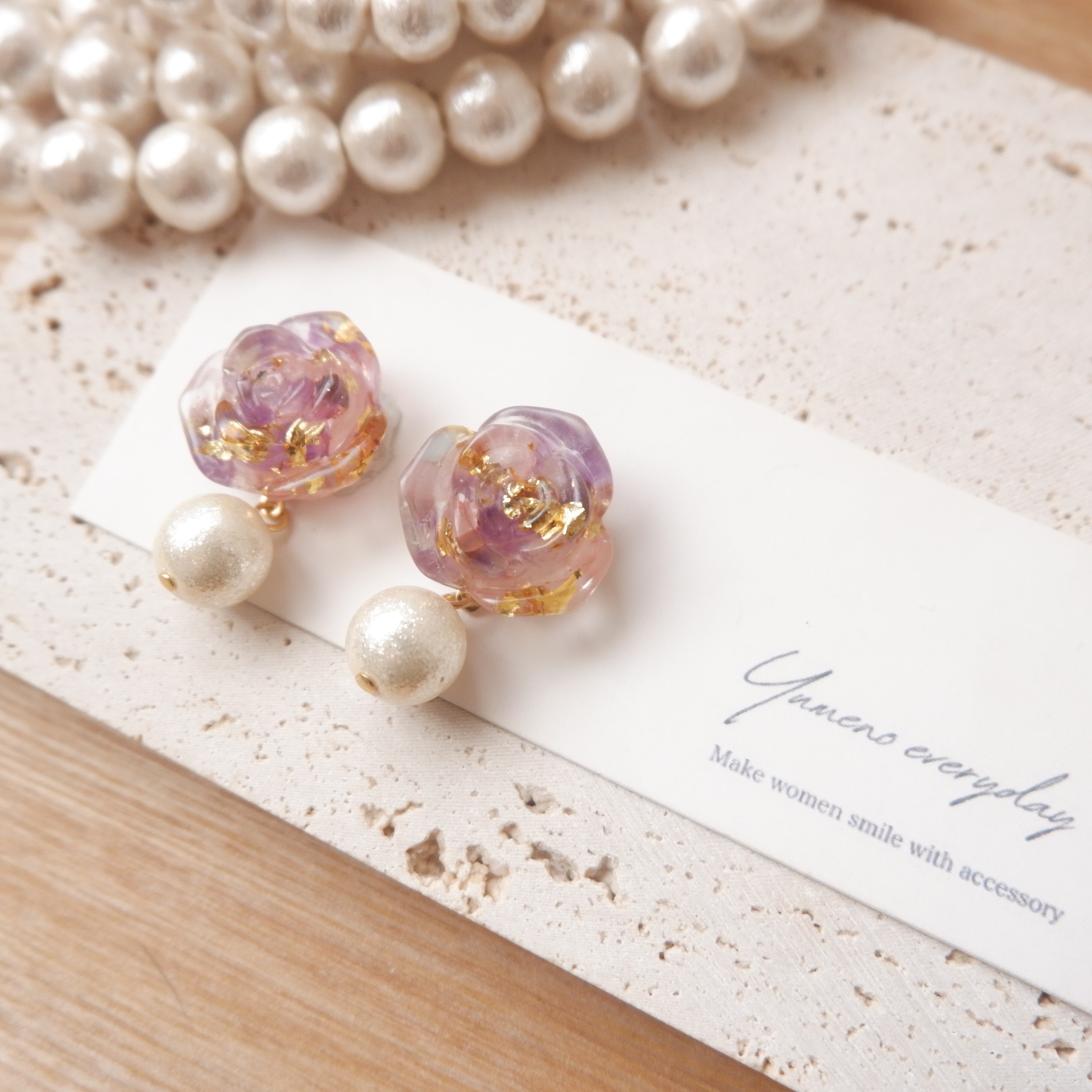 素材:金属、レジン、天然石(アメジスト、ローズクォーツ)、シャイニーパール、金箔