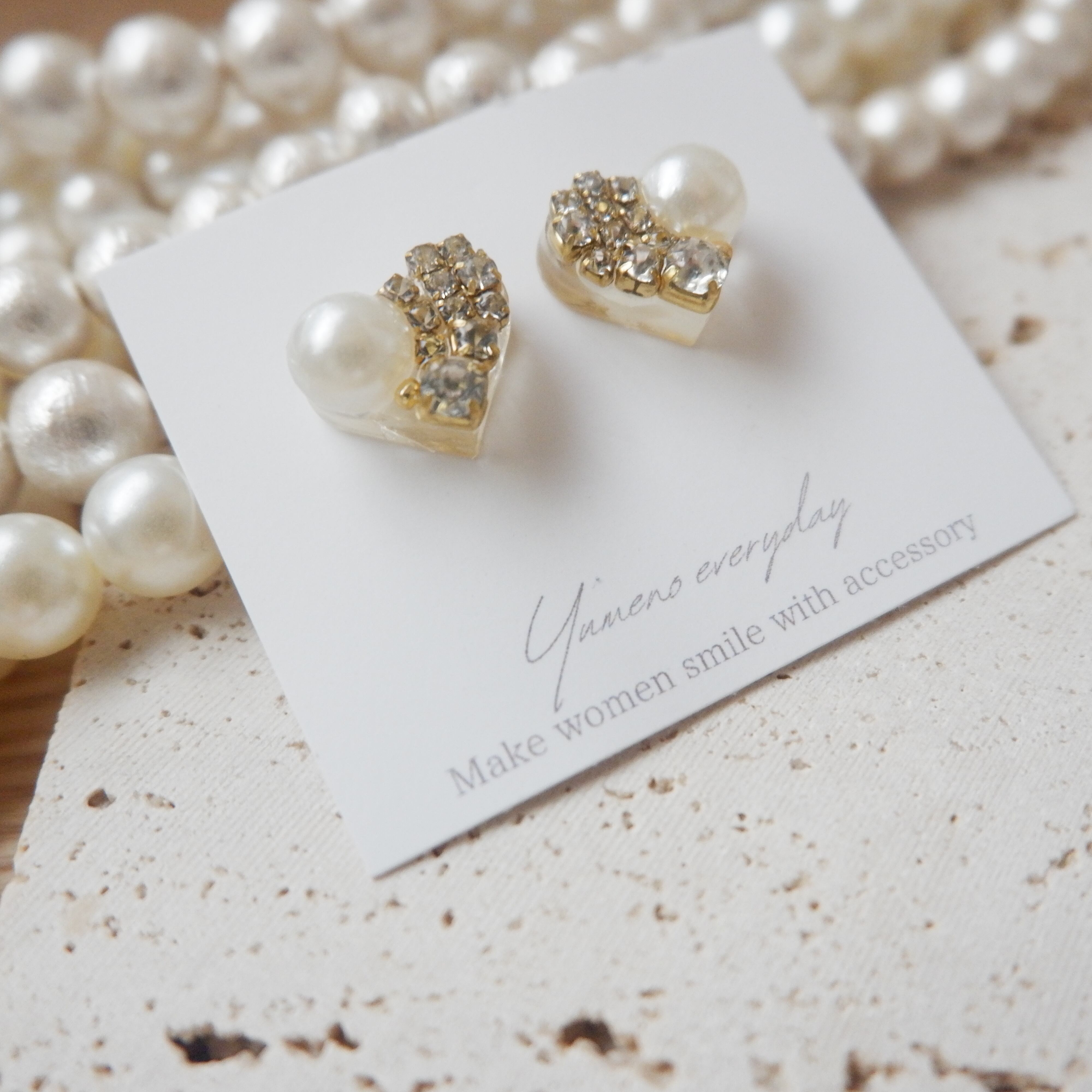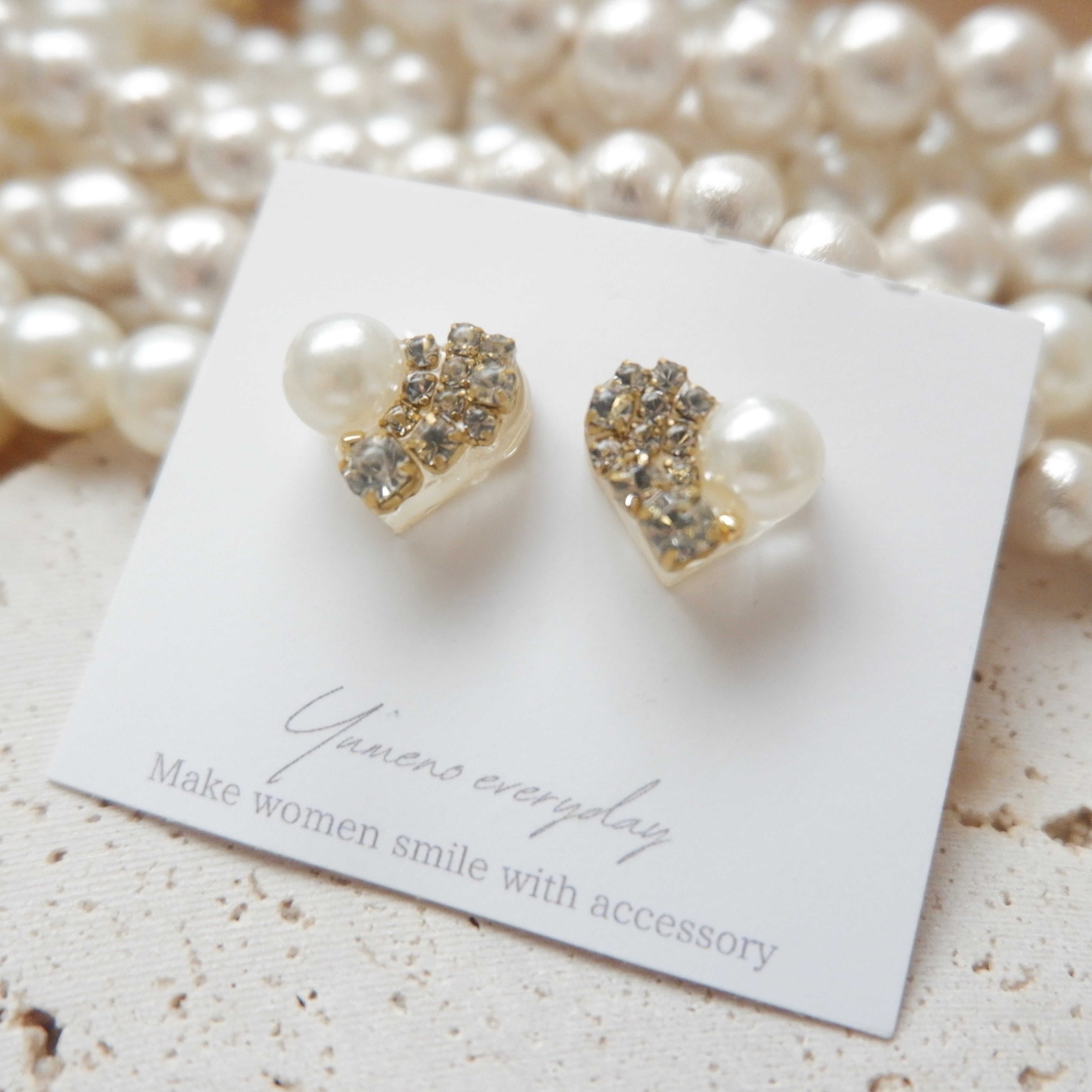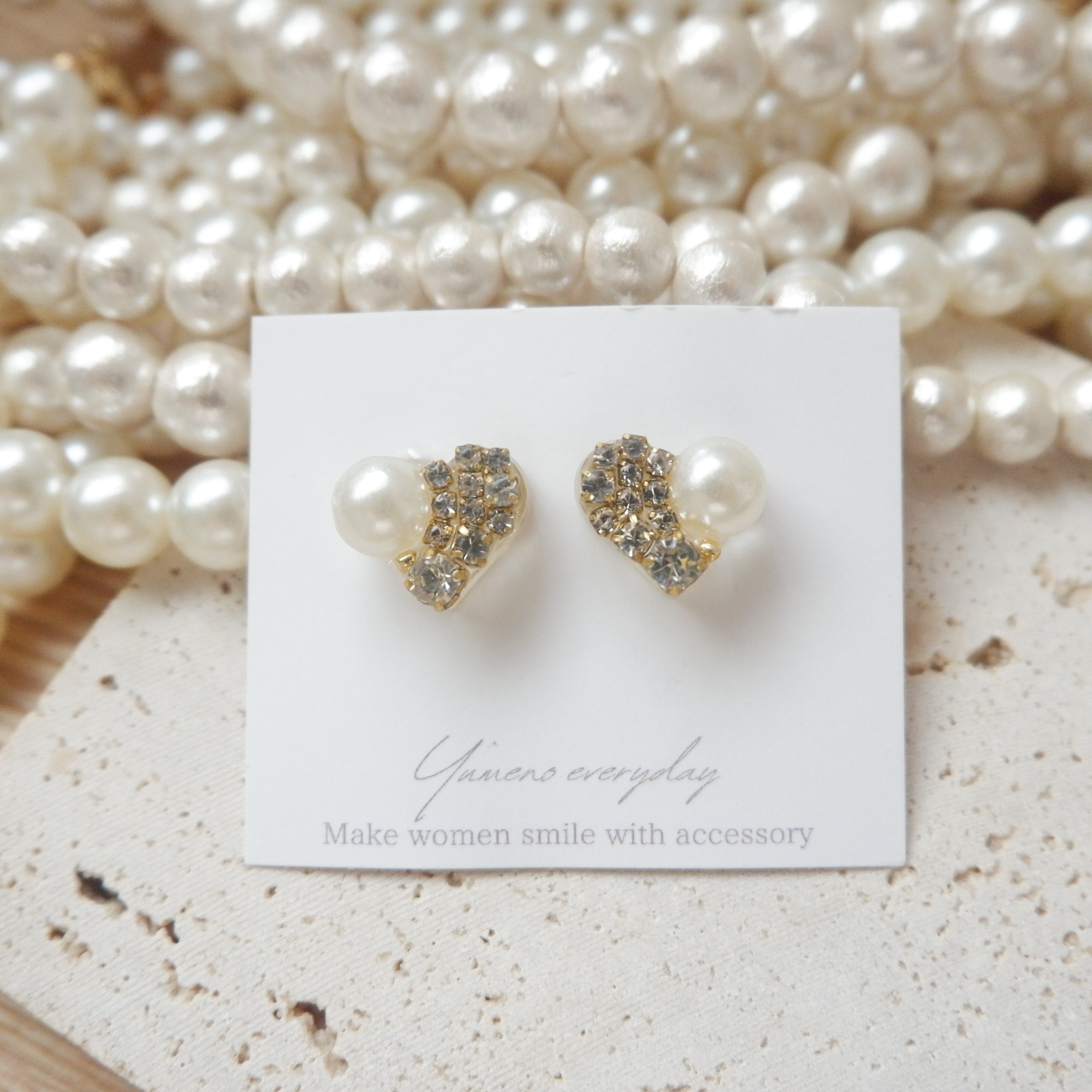 ハートの中にパールとクリスタルガラスをたっぷりと詰め込んだ大人可愛い耳飾りです。