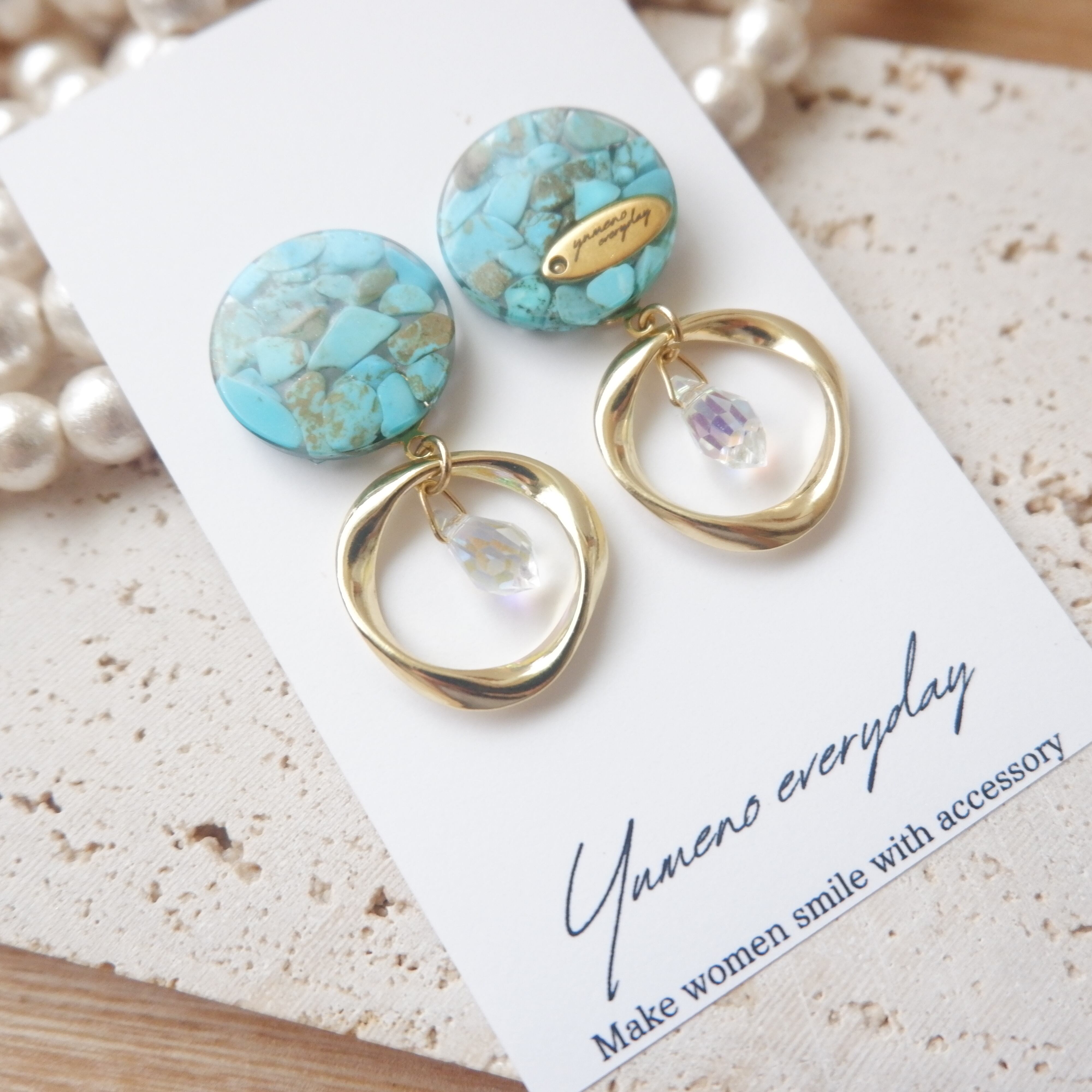 天然石 夏のお守り ターコイズ×クリスタルガラス×ゴールドリング イヤリング/ピアス
