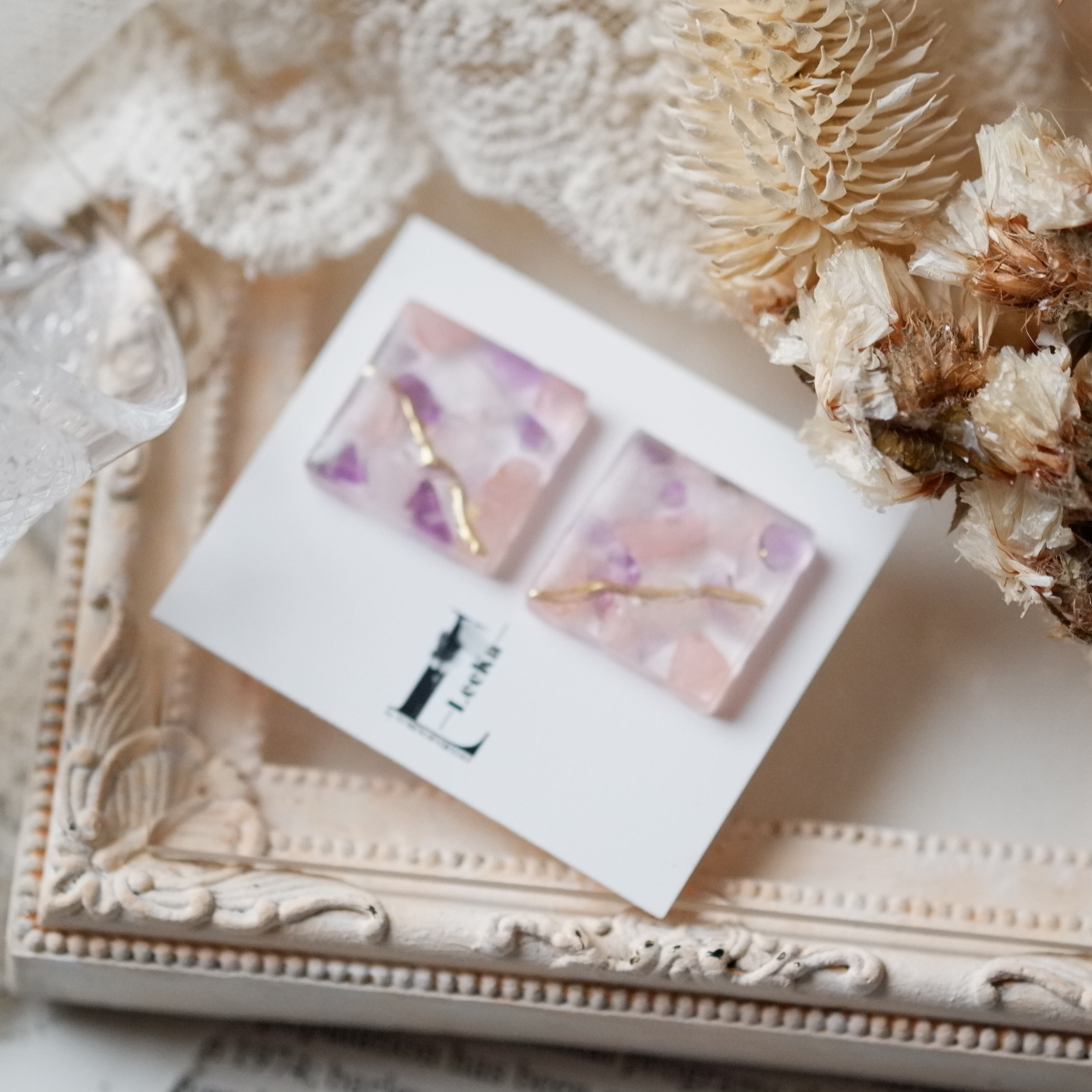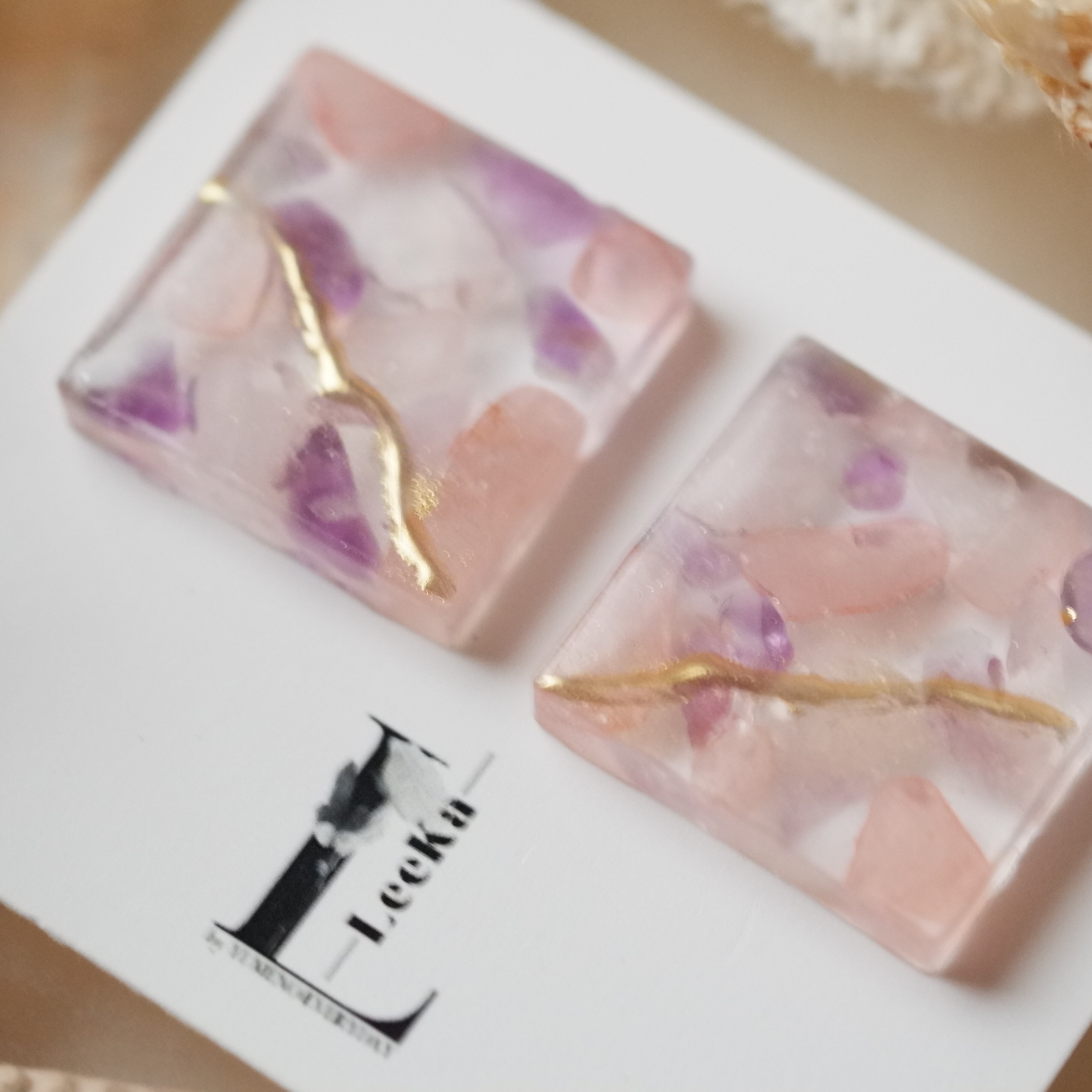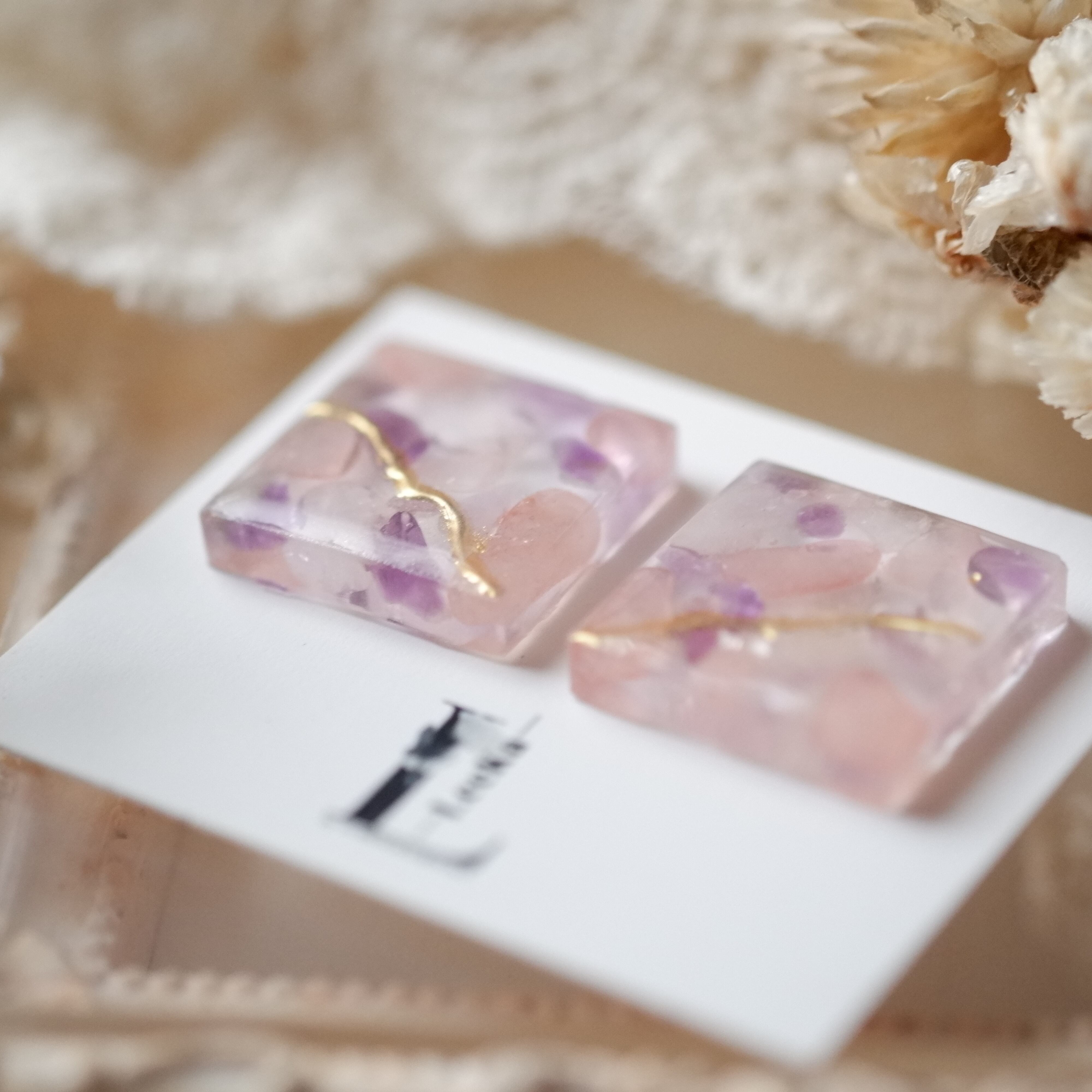 アメジストとローズクォーツのさざれを約2センチの薄めのスクエアに閉じ込め、ゴールドラインを引きました。