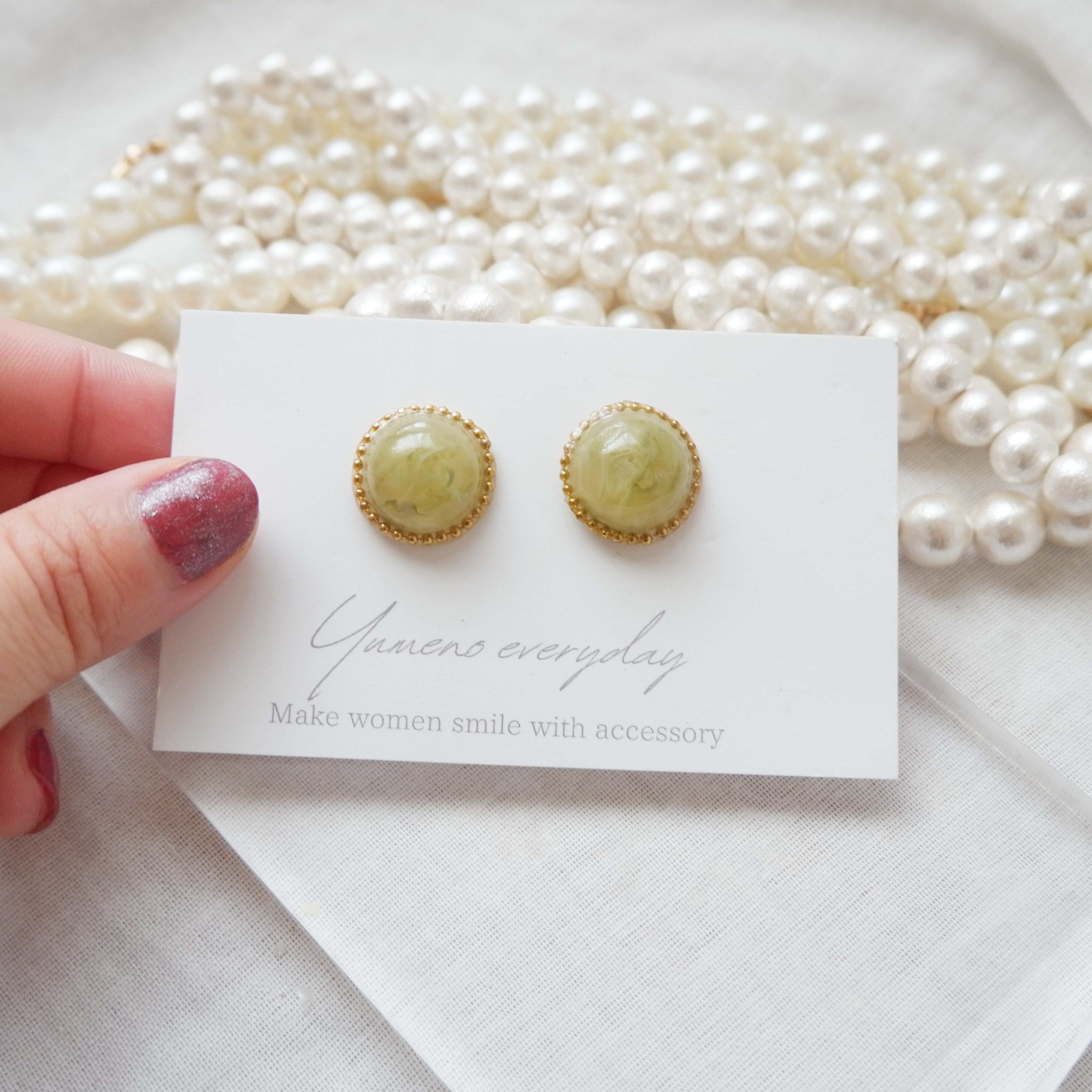 グリーンのニュアンスカラーのシンプルな耳飾りです。