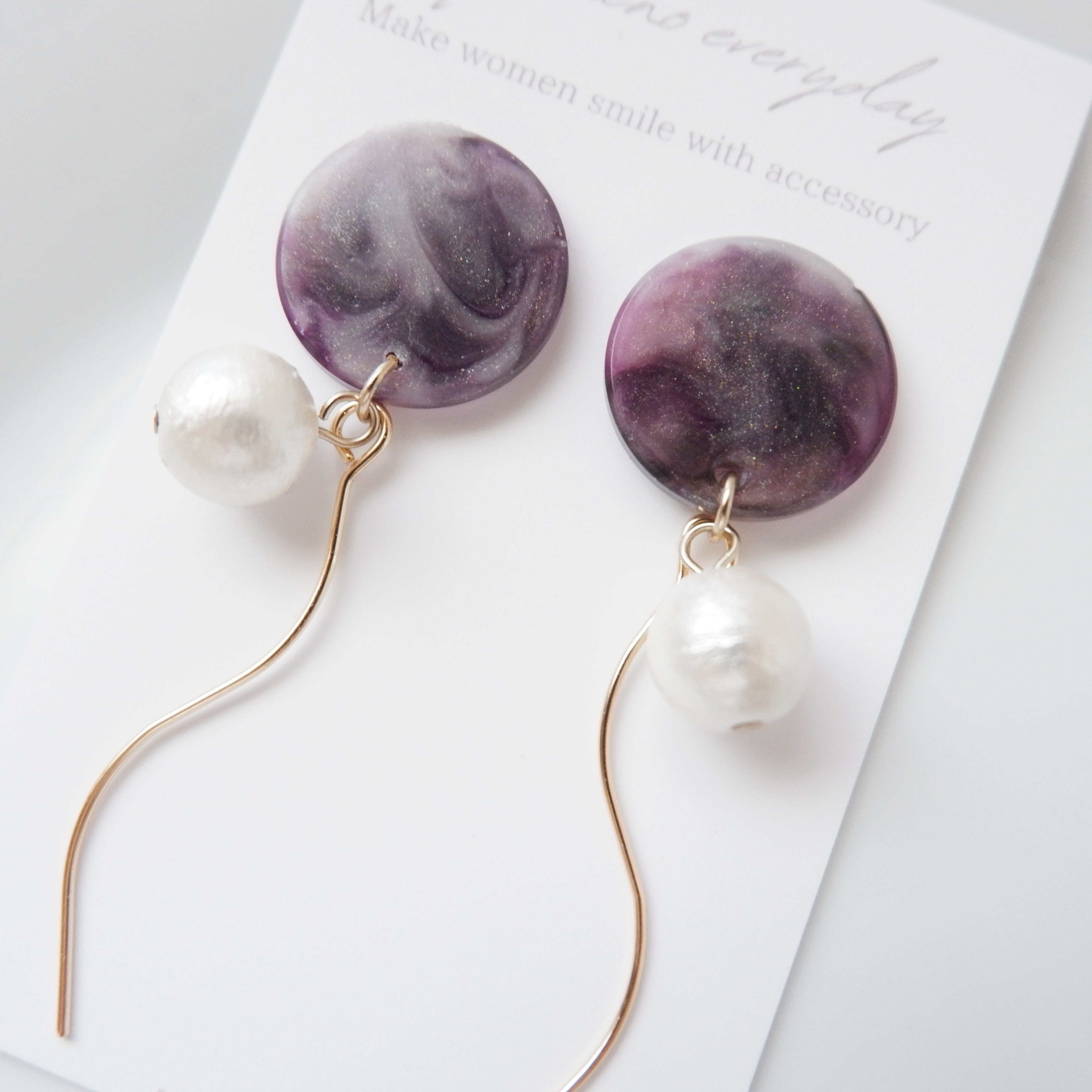 大人の深みべっ甲 ×コットンパール ×ゴールドスティック パープル イヤリング/ピアス
