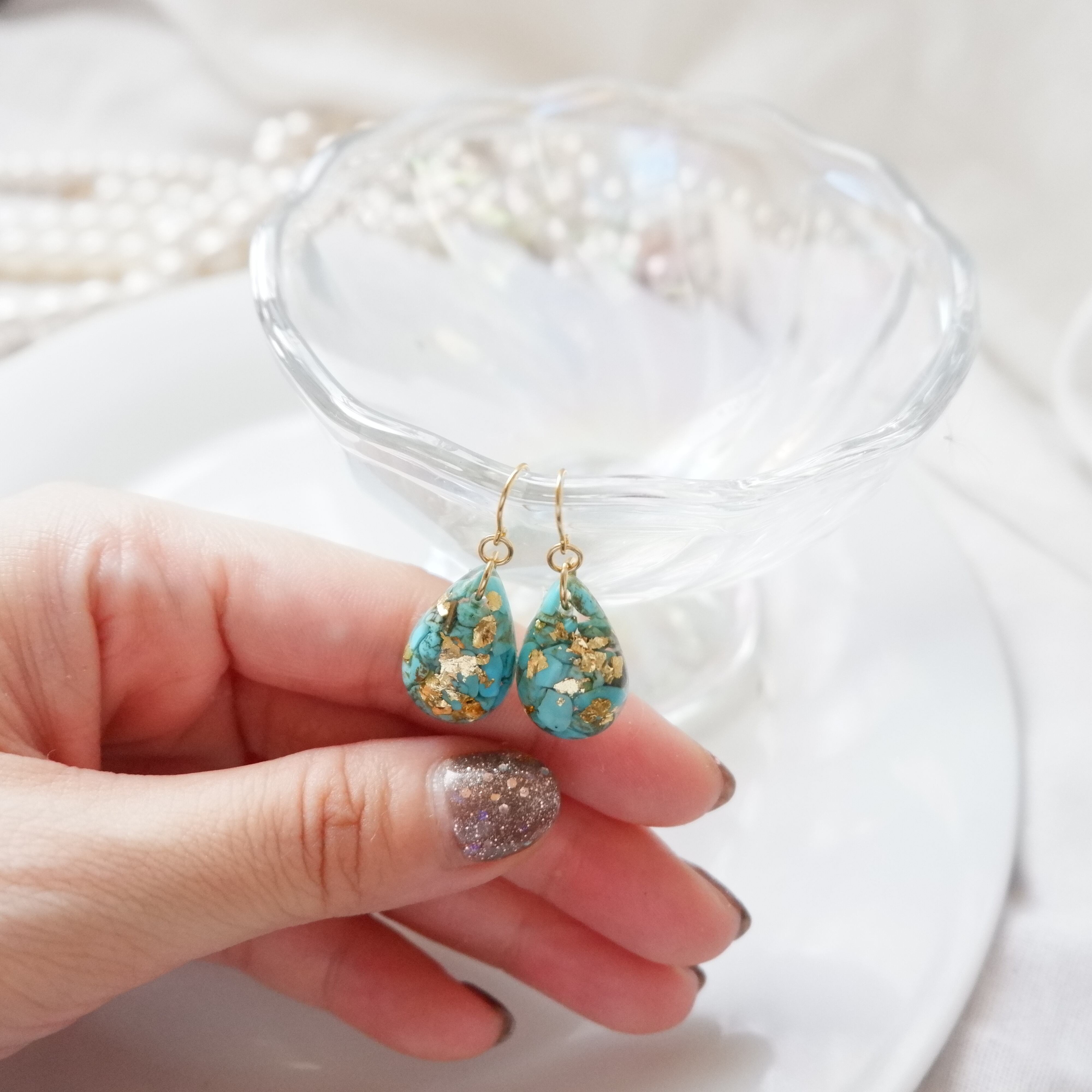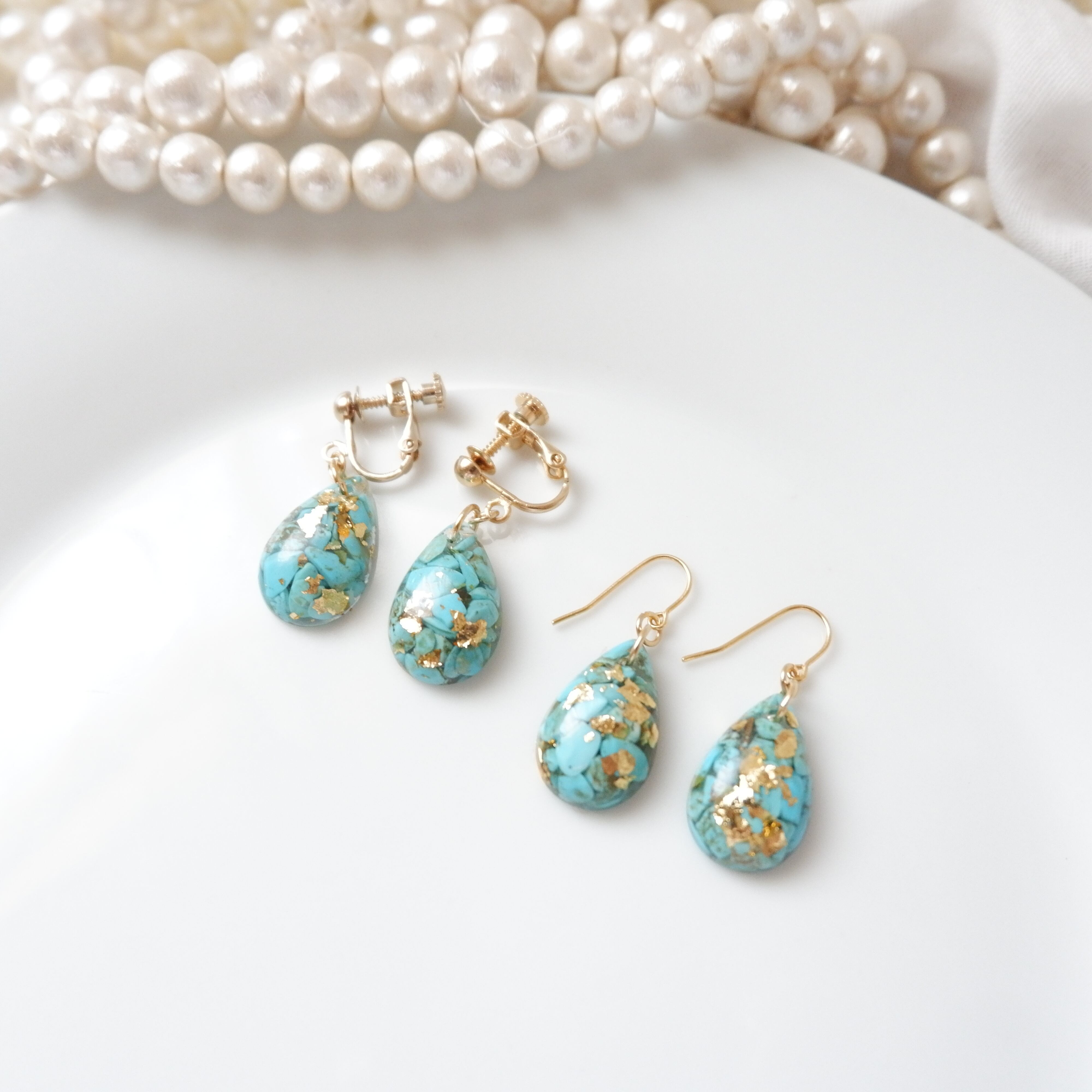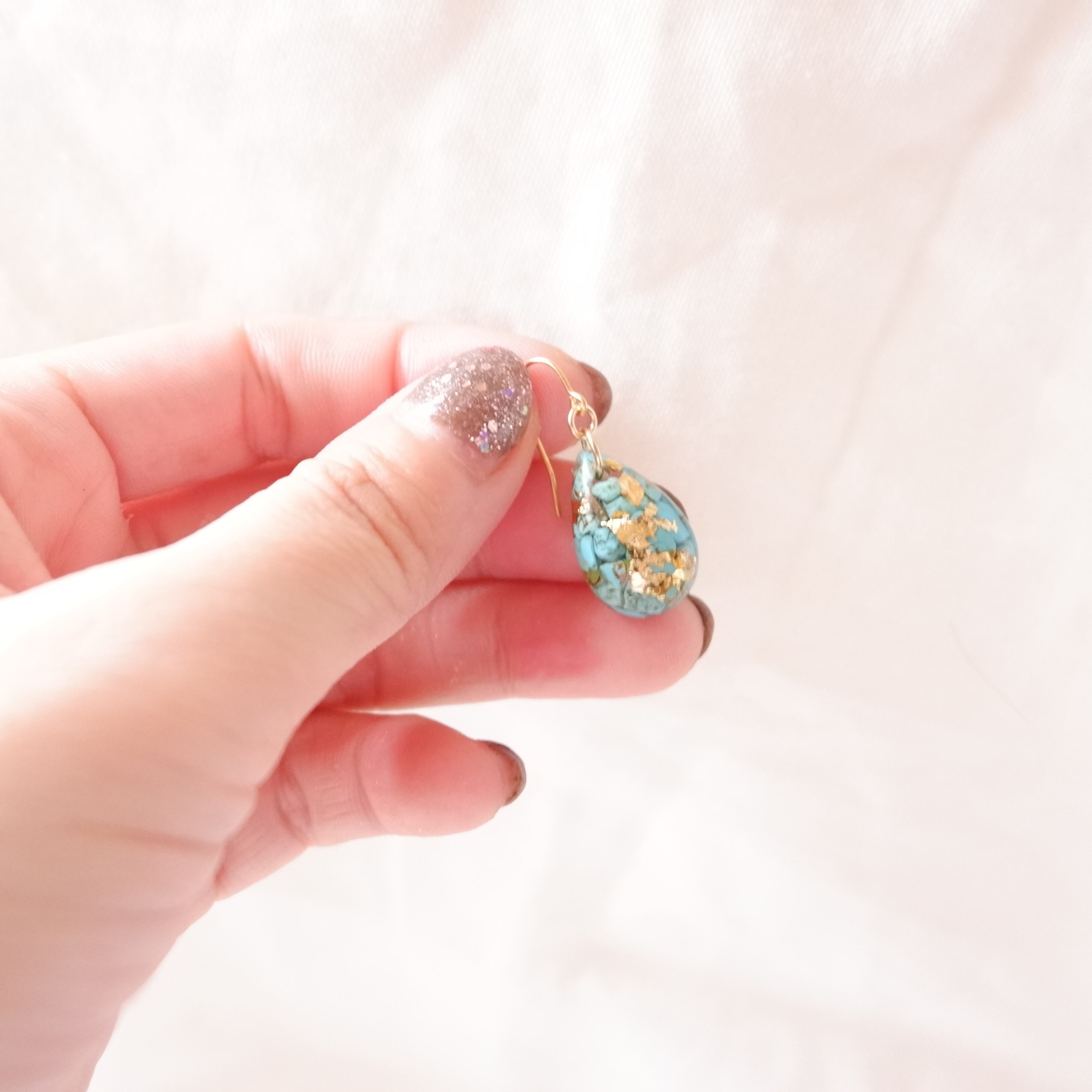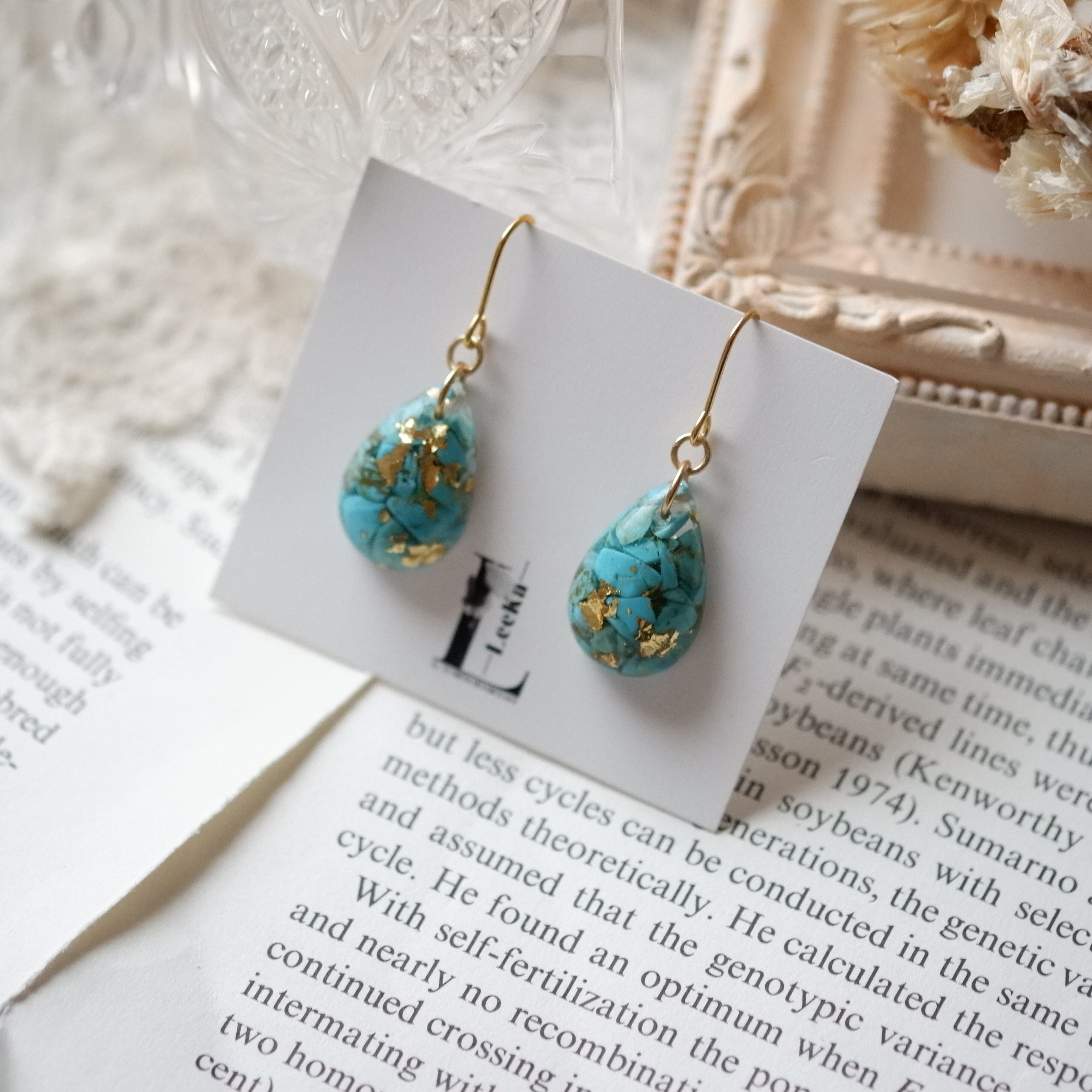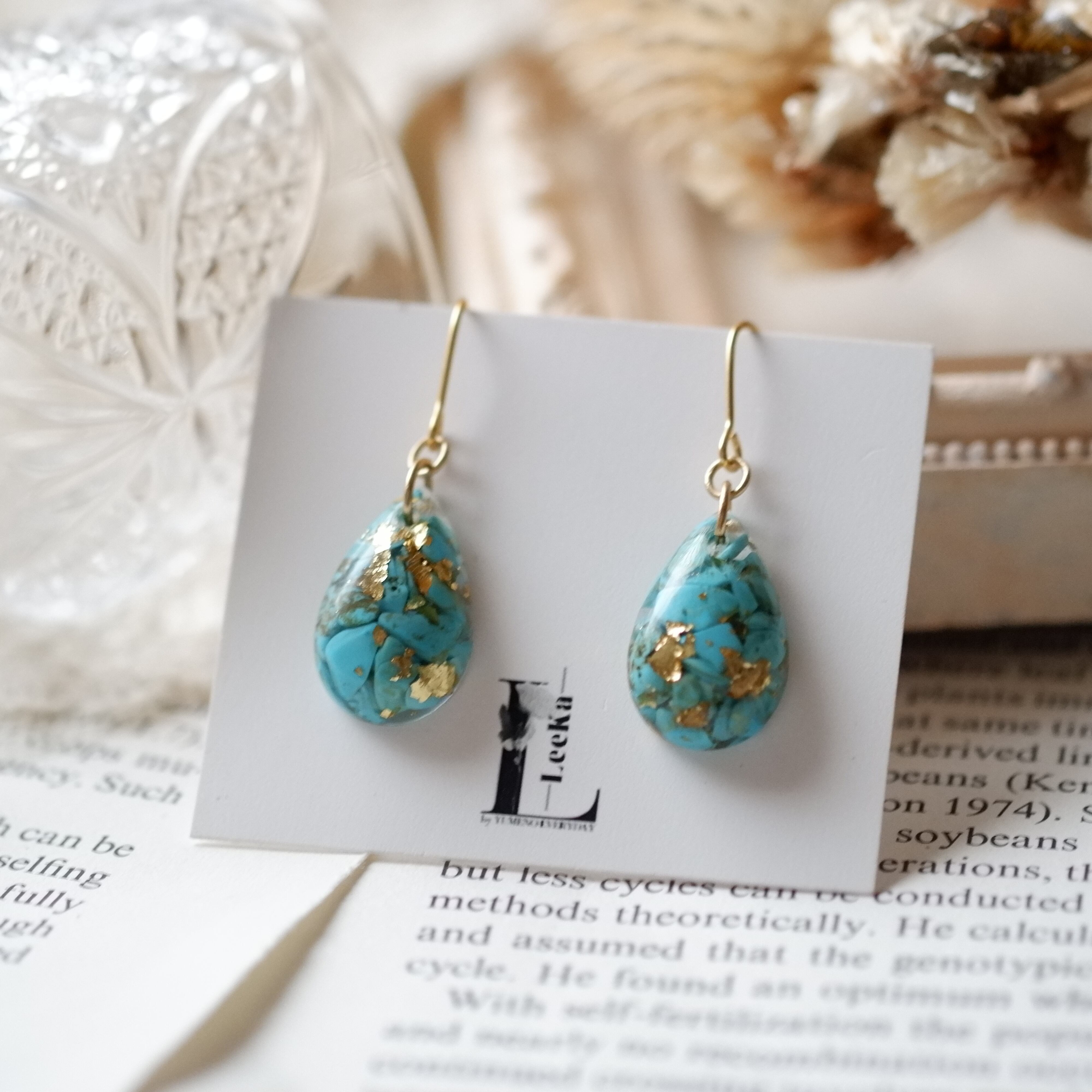 ドロップ型にターコイズと金箔を色や形サイズを考えながらバランスよく閉じ込め、揺れるデザインに。