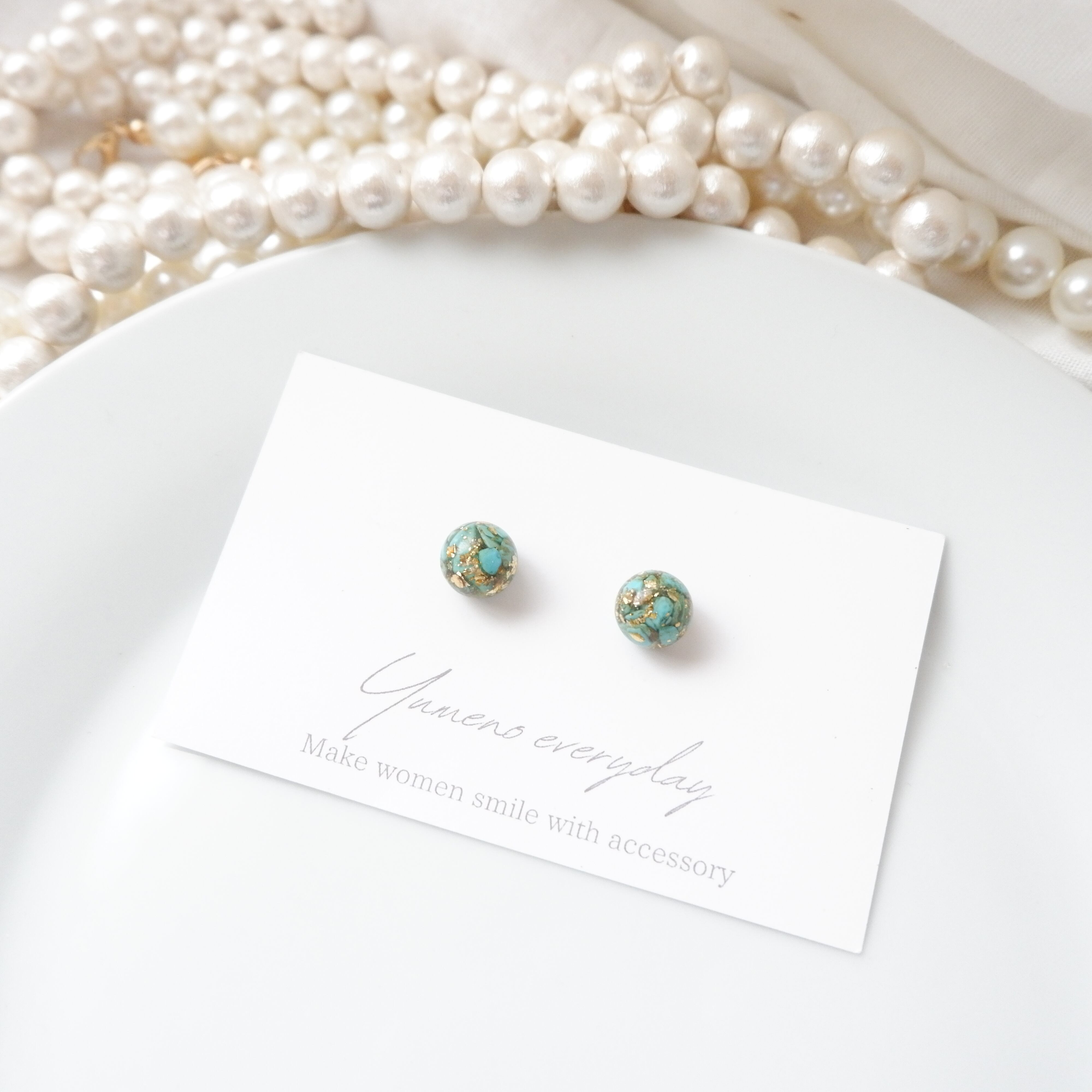天然石のターコイズのさざれと金箔を綺麗なSphere(球体)に閉じ込めた1粒タイプの耳飾りです。ターコイズは夏ぴったりの綺麗な天然のターコイズブルーカラーが大人っぽく落ち着いた印象です。