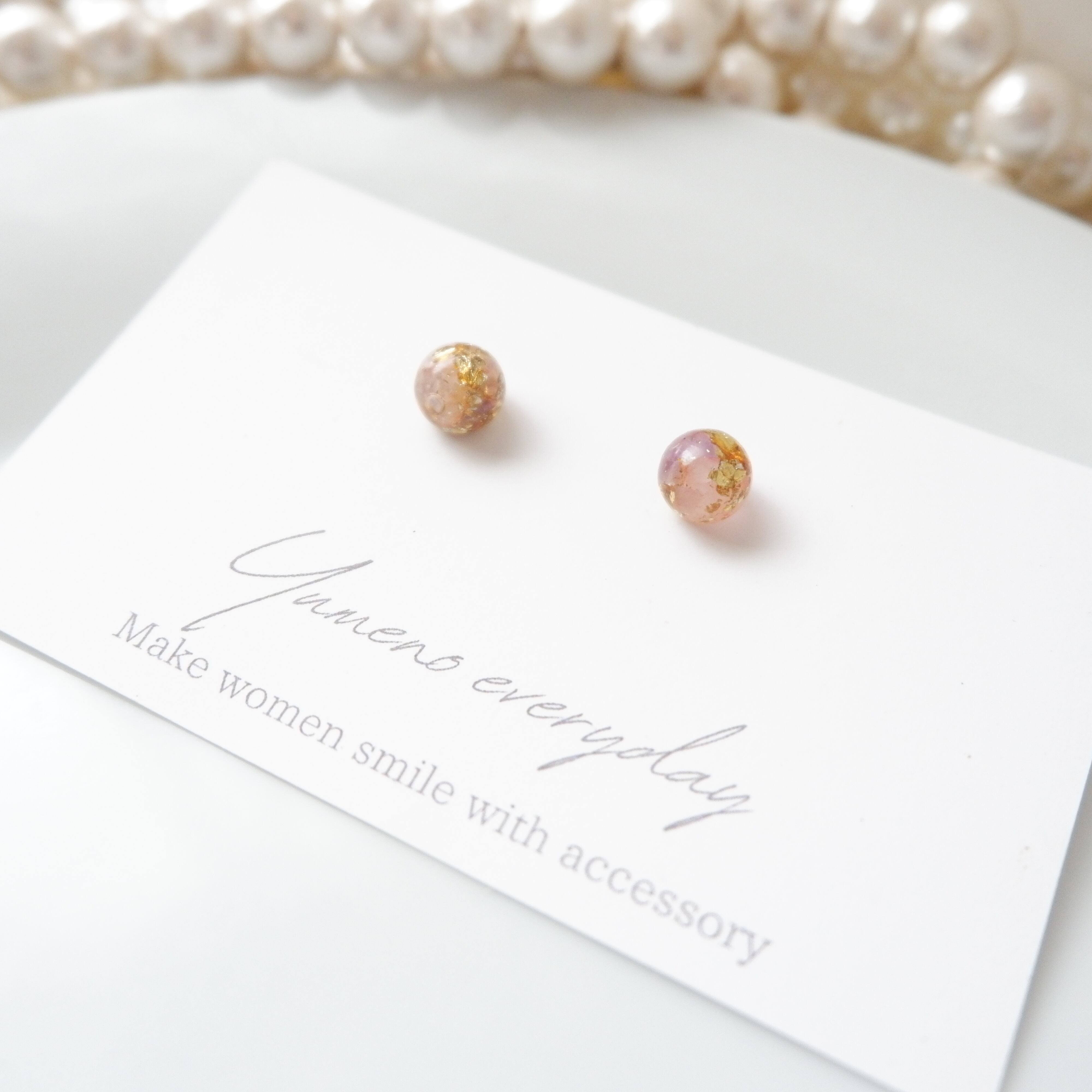 天然石のアメジストとローズクォーツのさざれと金箔を綺麗なSphere(球体)に閉じ込めた1粒タイプの耳飾りです。
